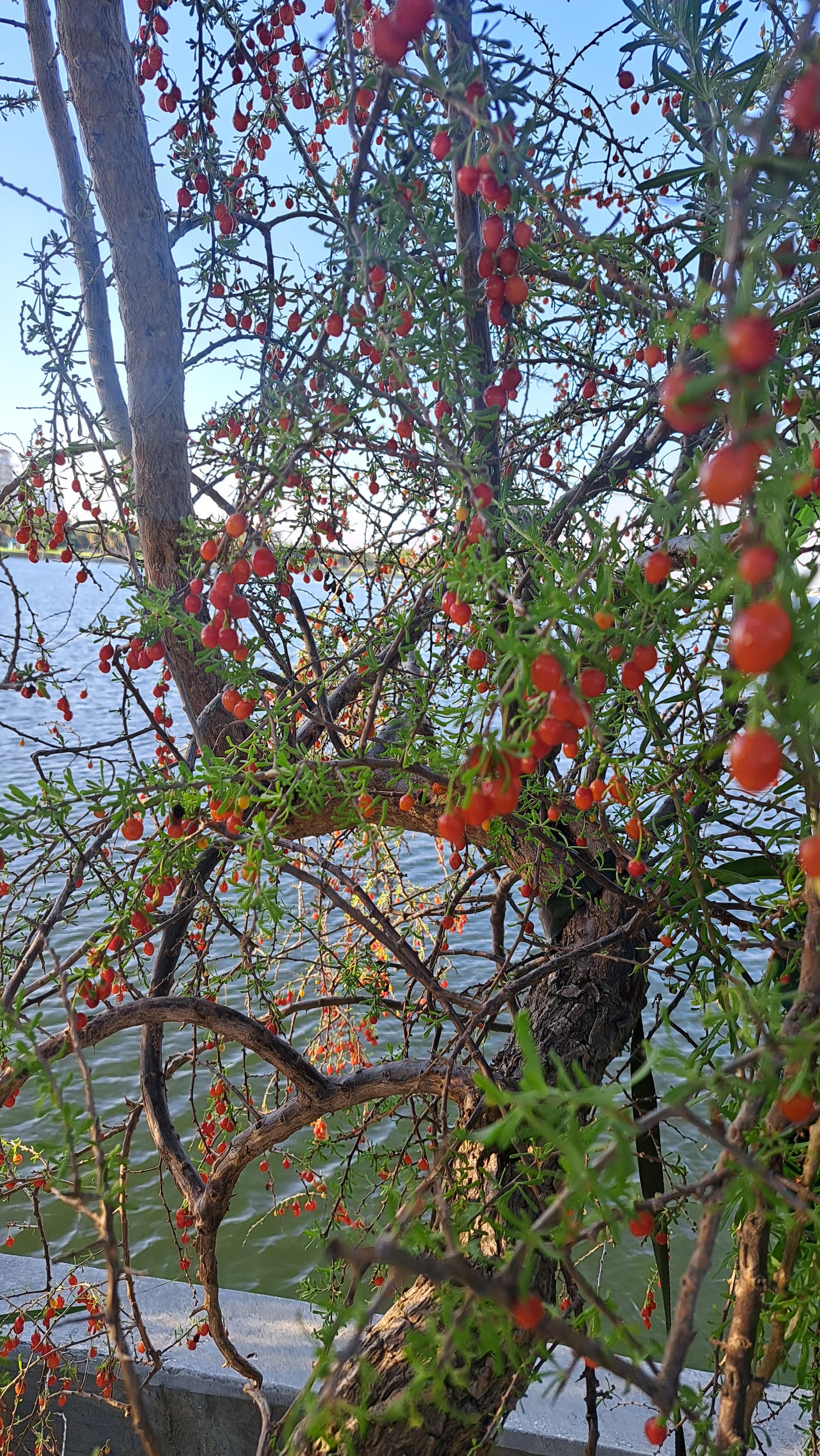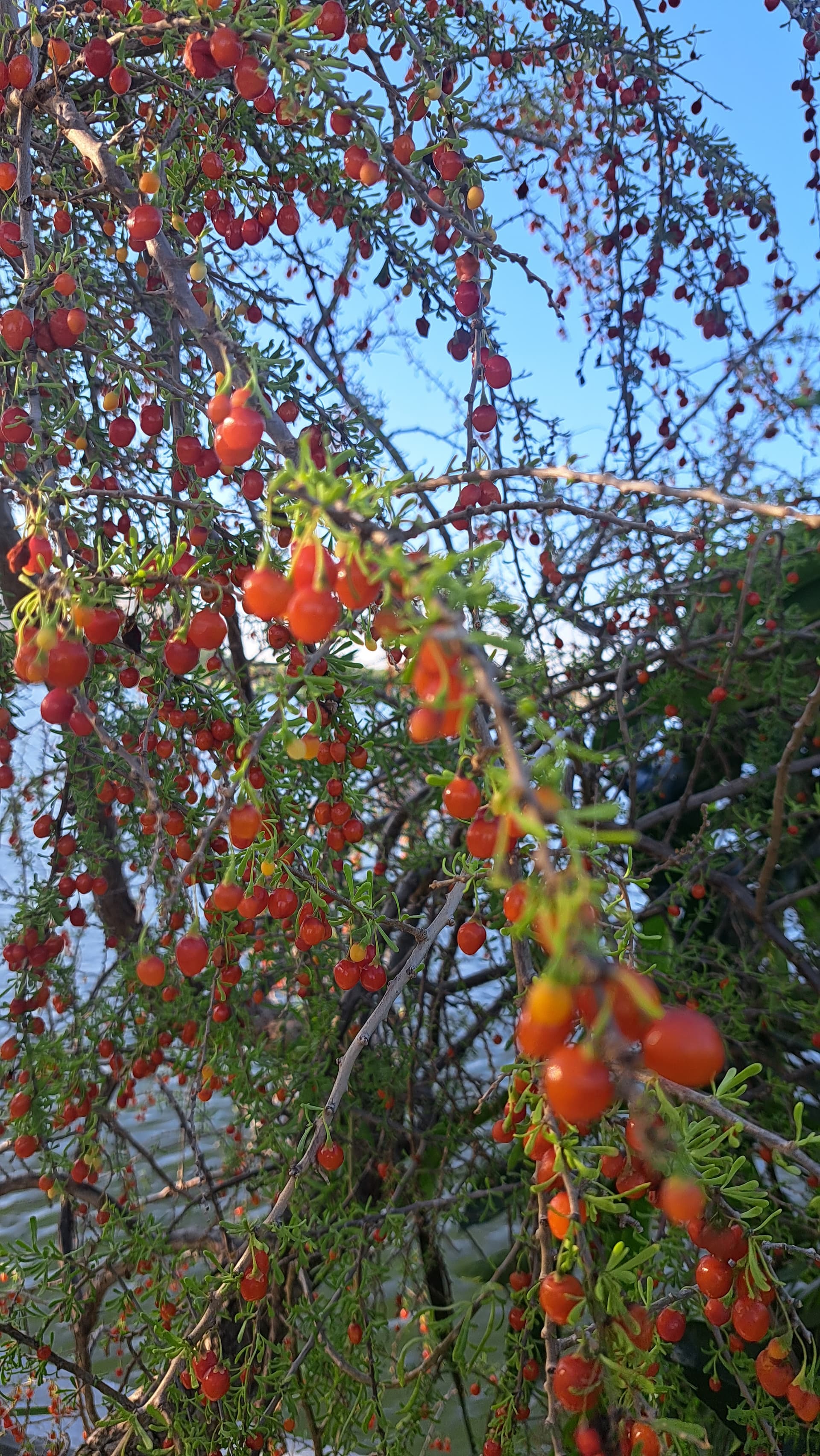 Christmas berry (Lycium carolinianum). Native relative to goji berry mostly grown as an ornamental. Growing on St. Pete Pier, extremely salt tolerent plant. Grabbed a handful of fruits and planted a trays worth. Took a nibble on a couple fruit, taste like sweet tomatoes.
