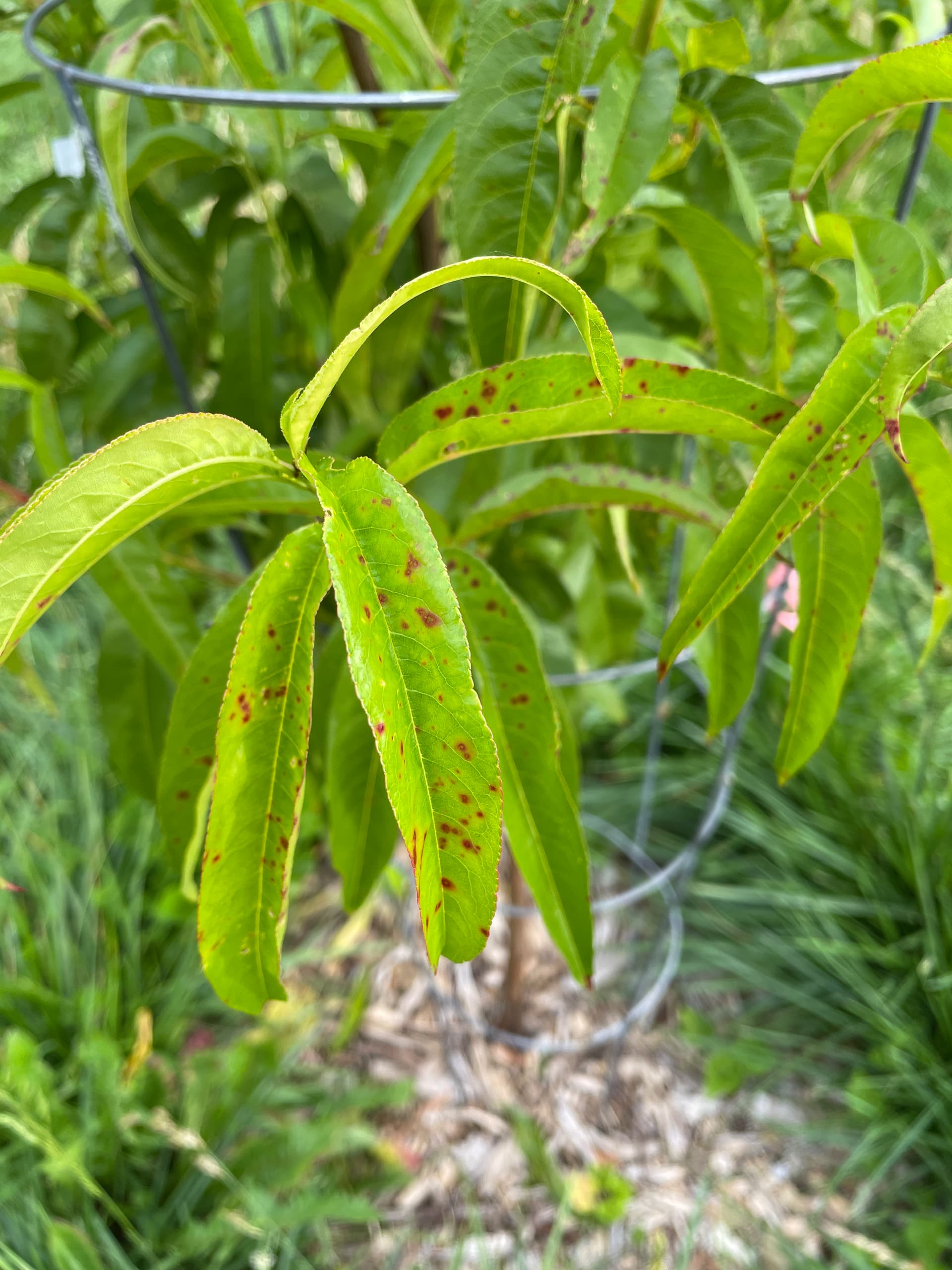 Hi all! Just looking for help with ID with this nectarine and peach issue. Trees were planted bare root this spring. We’ve had good rain this season, usually one good rain/week. The weather just got into the 90s and humid this last week or so. Soil seems to drain well, 3ft mulch around base. Trees have shown no signs of stress at all and have grown vigorously. Applied one round of 13-13-13 late spring.