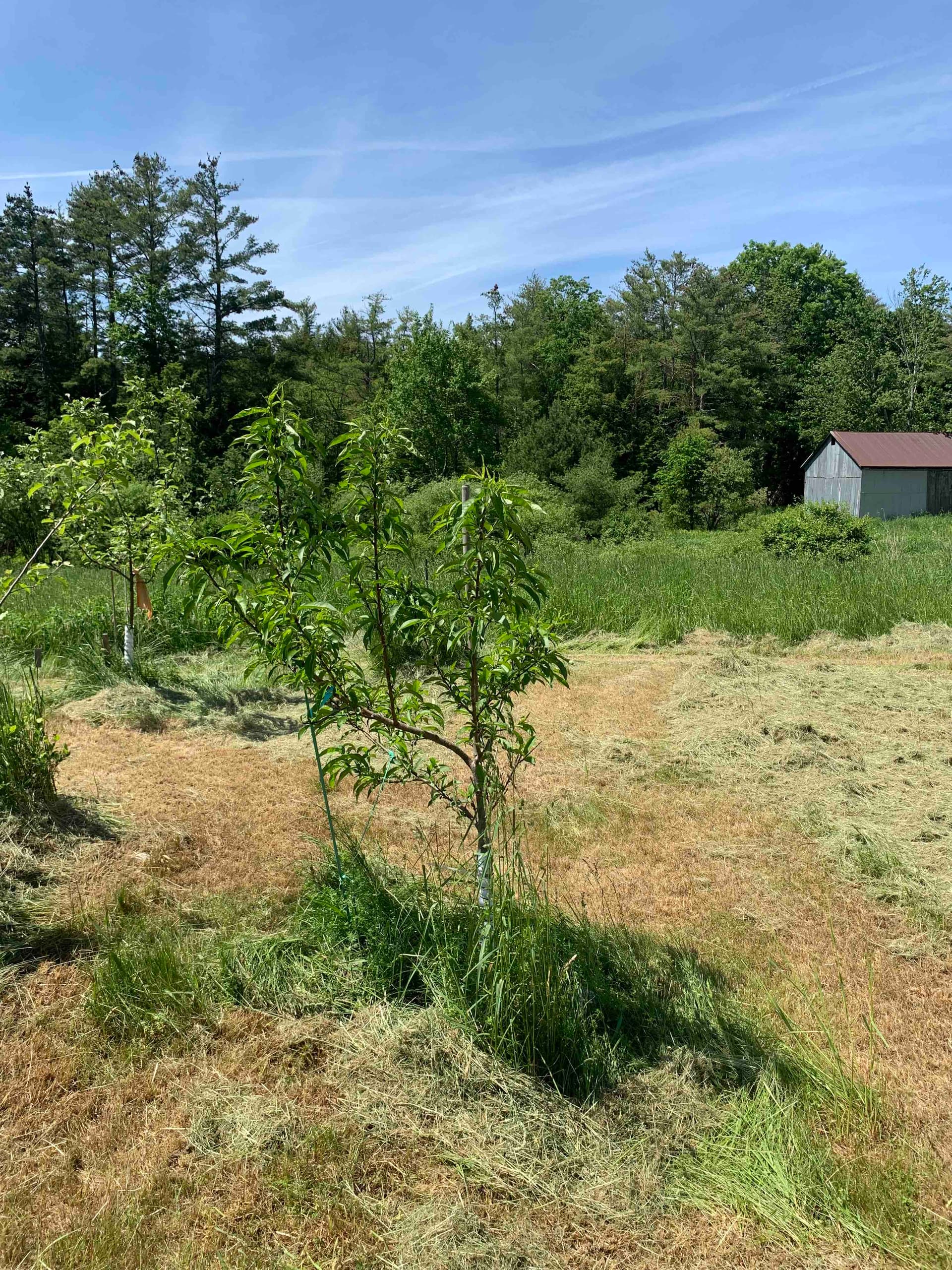 18"+ sounds like a good height to start training the new branches, my riding mower broke last fall and I just repaired it two weeks ago. Grass grows 4-5ft by June in this pasture no problem if you let it so those low branches would just spell trouble.