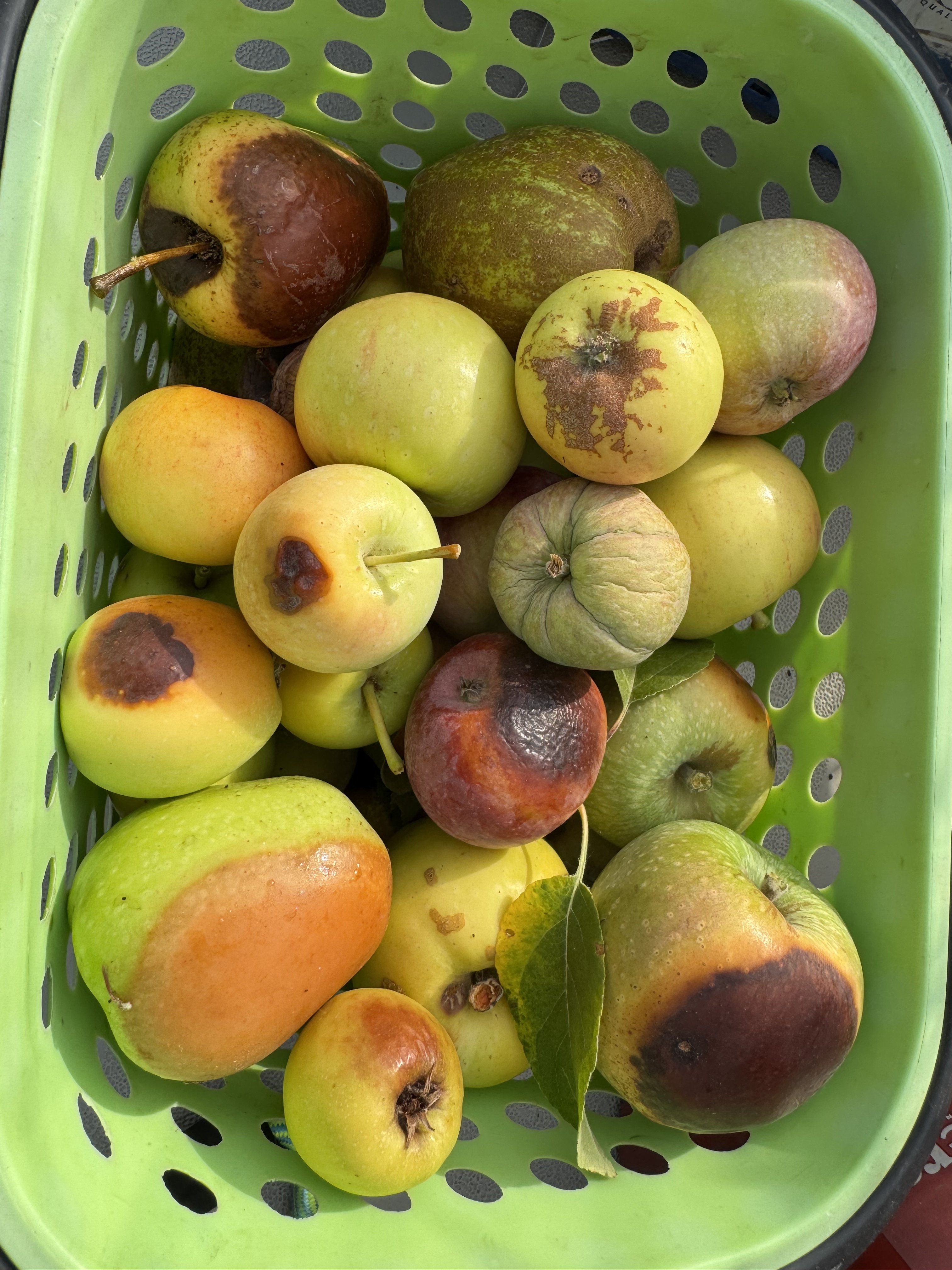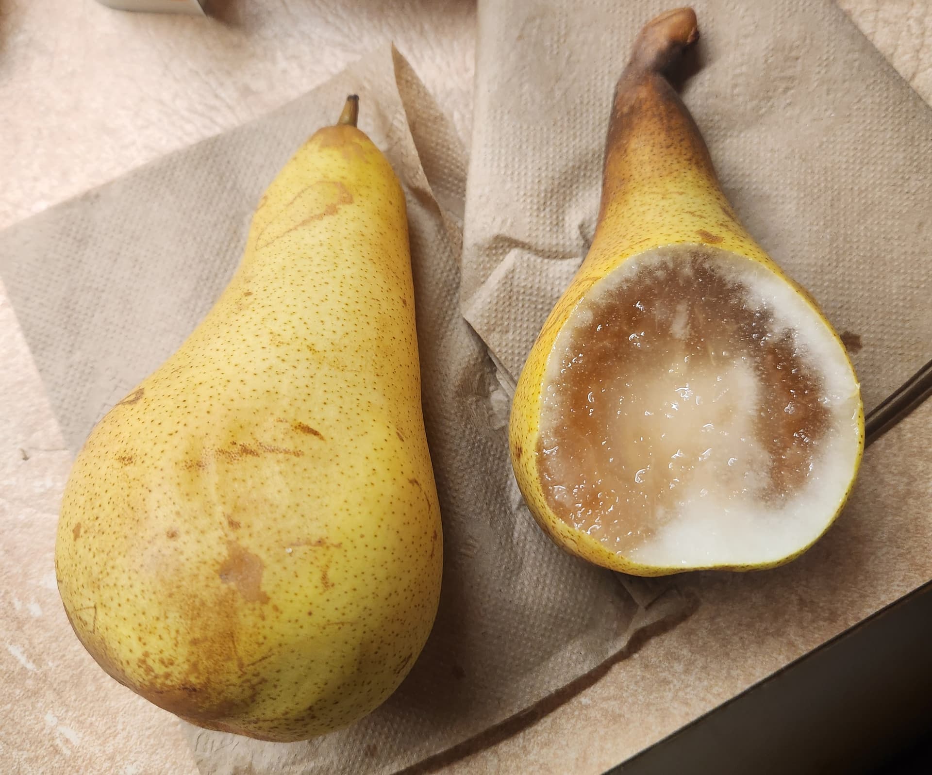 Here’s what the pears look like that have sunburn, sunscald. Look great from the outside but squishy when they are picked.
