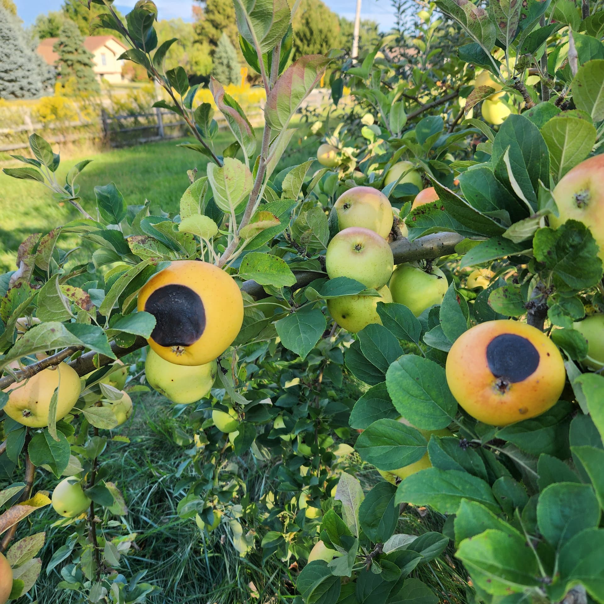 I would appreciate any help to identify the black spots on my apples this year. I have not had this issue with any of my apple trees before. This is the only variety I have that has the spots on them- Winter Banana.