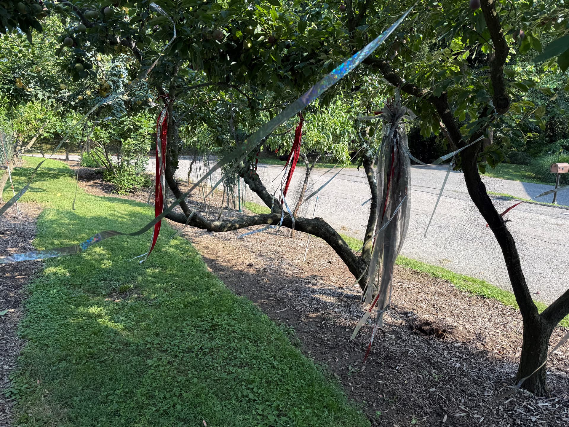 I don’t know how much netting is needed or how much it needs to be fluffed up (have it not just close to the trunk). The earlier ones I used more netting and fluffed it up. Here is an earlier picture I took of some bird scares but if you zoom in you can see the fluffed up netting on the trunks here: