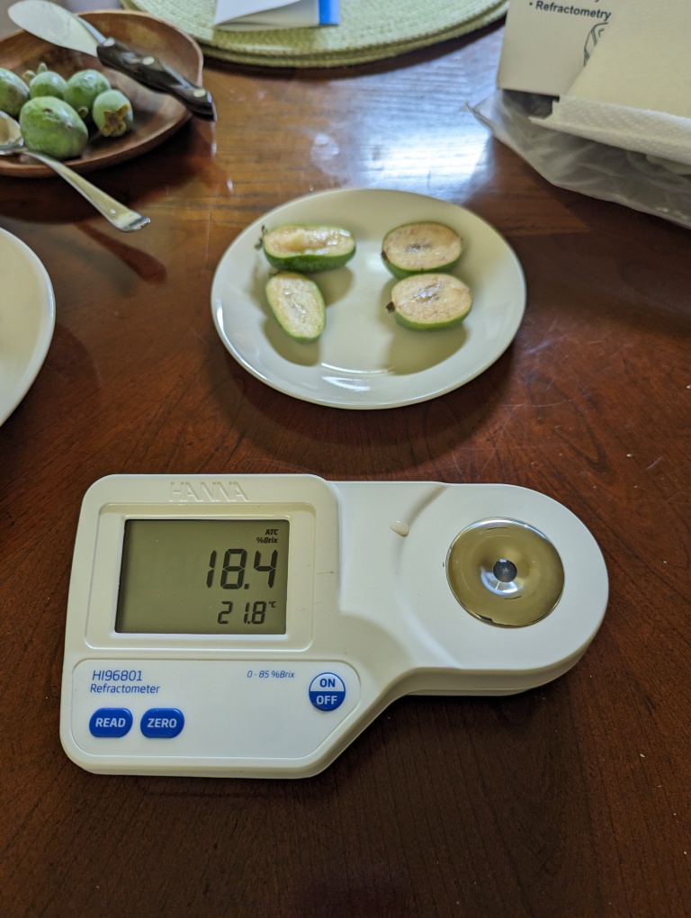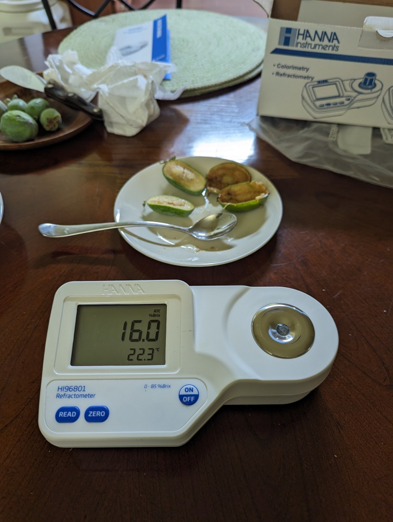 Larry, good question. Ripe feijoa are like those fruit gusher candies. It has the sweet gel filling in the middle. That’s probably where the juice came from. The gritty flesh seems to be where the acid resides. I’m curious how much sugar it holds.
