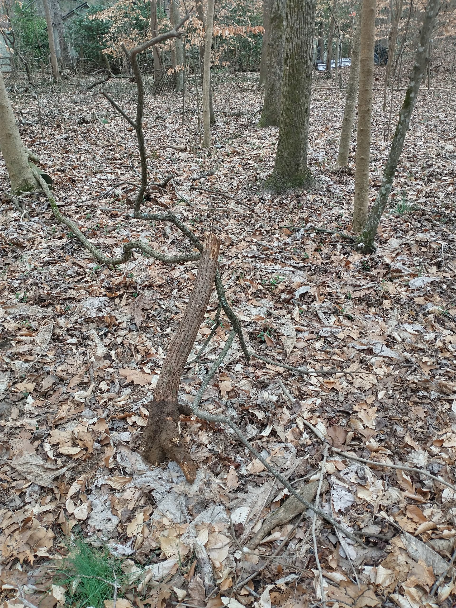 The smallest of the three had a shelf fungus growing on it. The tree was so small that I decided to try and push it over and I succeeded. The trunk broke a couple feet up from the ground, and I wrestled the stump out of the ground. It did not have the distinctive scent that I am accustomed to with sassafras, but it has been dead for a while. It did have a gentle, somewhat spicy scent. Based on the bit of branching that was still attached to the top of that trunk I would suggest that it is a deciduous tree.