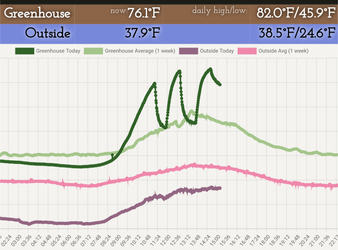 Bottomed out just under 25°F here last night, but the greenhouse is loving this sun… cooling fans had to kick in a couple times today.