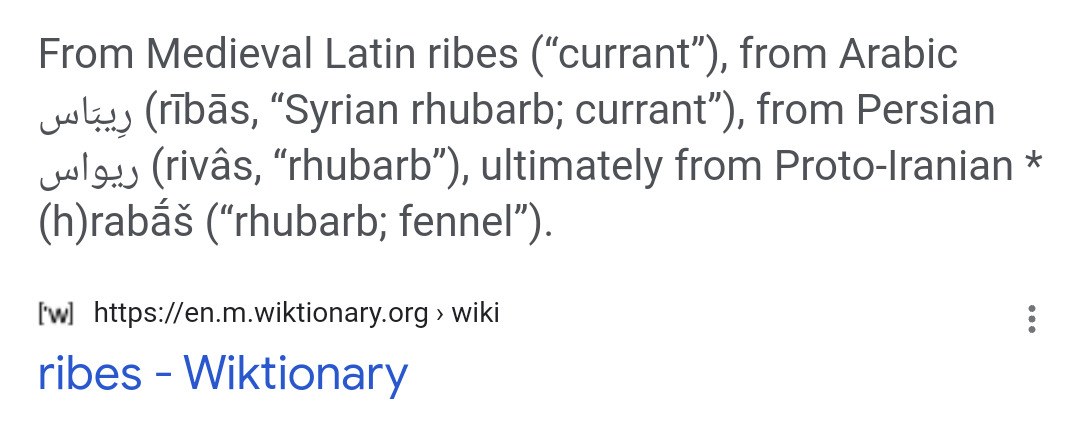 I read that the genus includes gooseberries along with currants. I suppose he means that he grows both. Interesting that it’s a proto Iranian word. I’d be curious to see if you can identify ribes in any tapestries or paintings of that era. Of course the modern meaning of the nomenclature is probably much different now. When reading the etymology links that Winn posted I notice the term rhubarb pops up as Syrian ribes. That seems like another rabbit hole to explore.