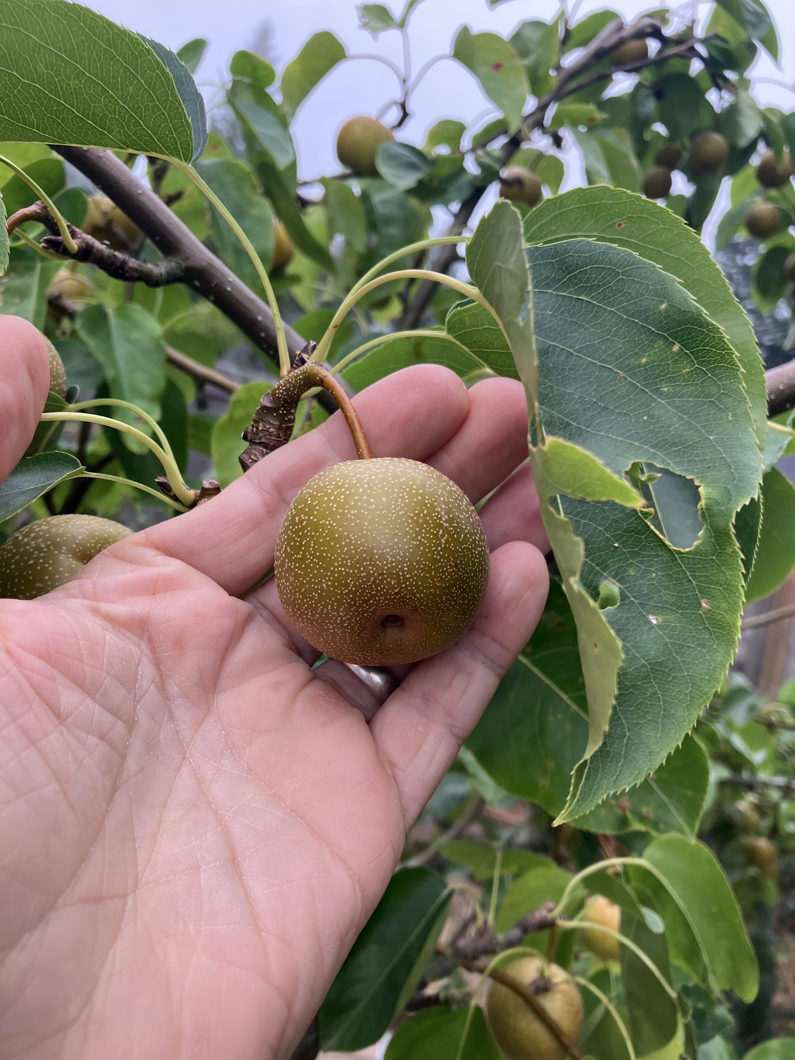 And, I do have a lot of fruit - but they are the size of golf balls. Some are already ripening so I know that they aren’t going to get much bigger. The odd thing is, the fruit size has been steadily decreasing with age. The tree is about 8 years old now since brought home from the nursery (it was a 4 way graft w/Chojuro, Nijisseiki, Shinseiki and Shinko but I got rid of the Shinko because it had excessive rust). Once upon a time when it was young it gave me apple sized fruit that were quite good but the fruit is consistently getting smaller and less tasty every year.