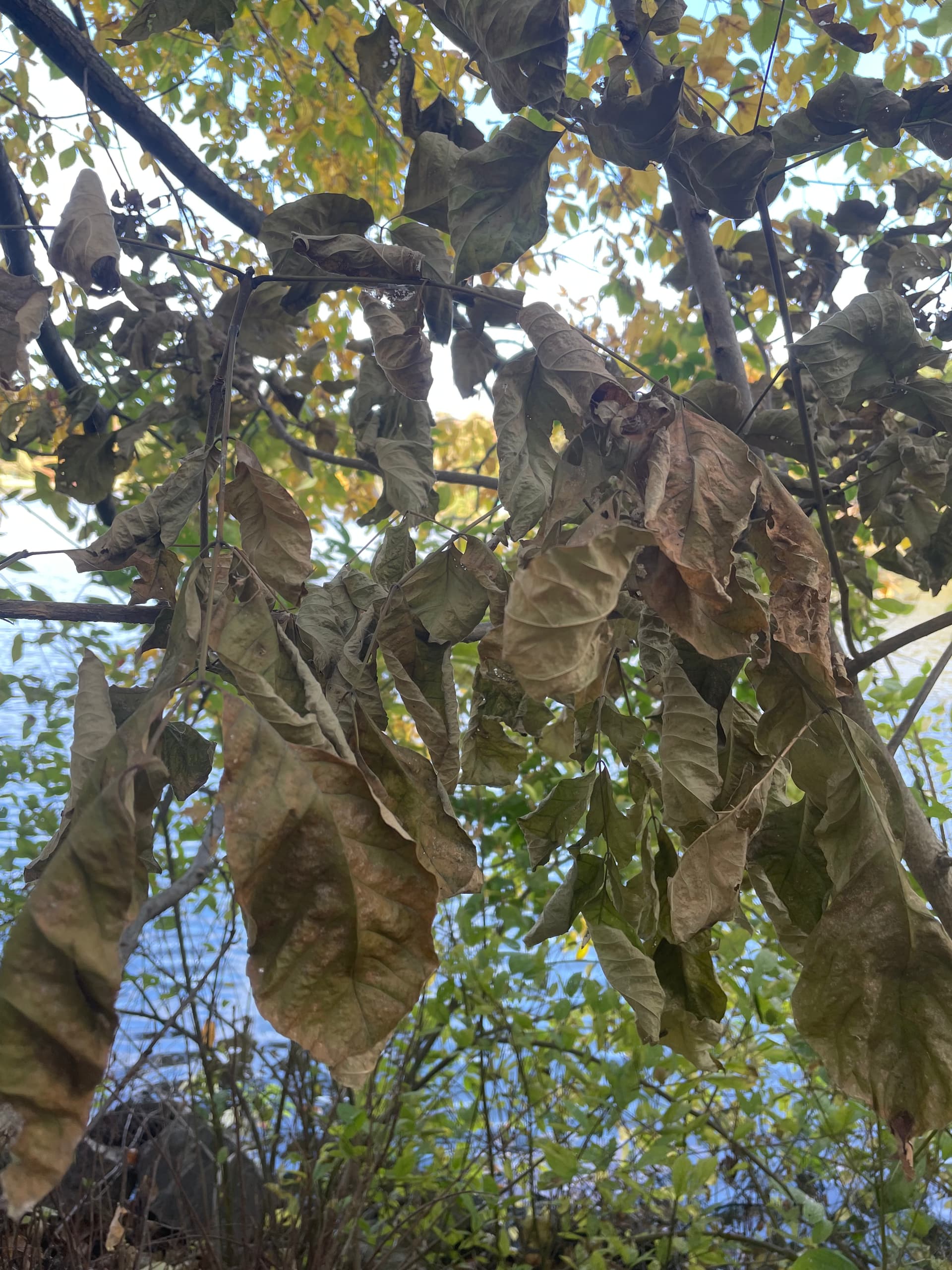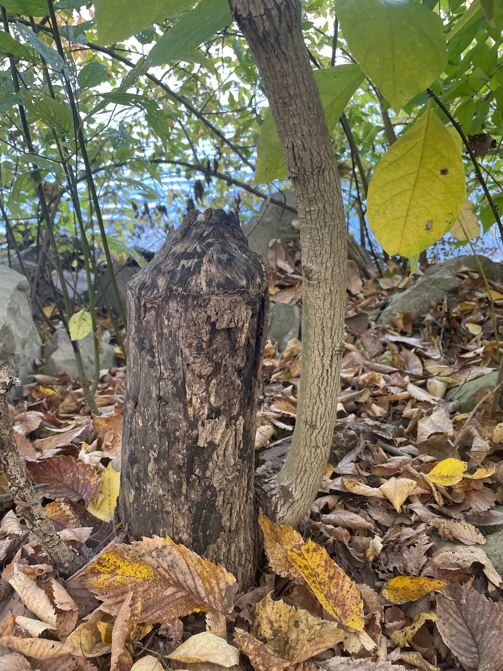 Oh, that is good news. There are paw paw trees all over this park (despite my misidentification here I had a grocery bag full in September) and I thought that was what that leaf shape, the gray bark and being next to the water all added up to. So, is the little green, healthy plant next to it a paw paw seedling?