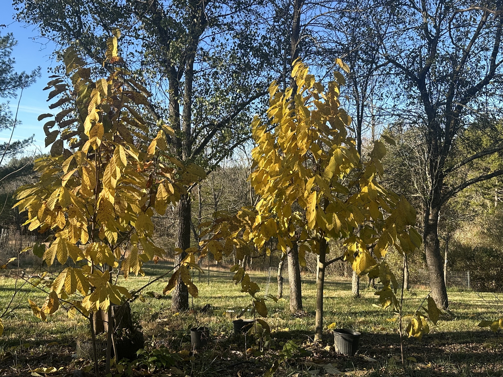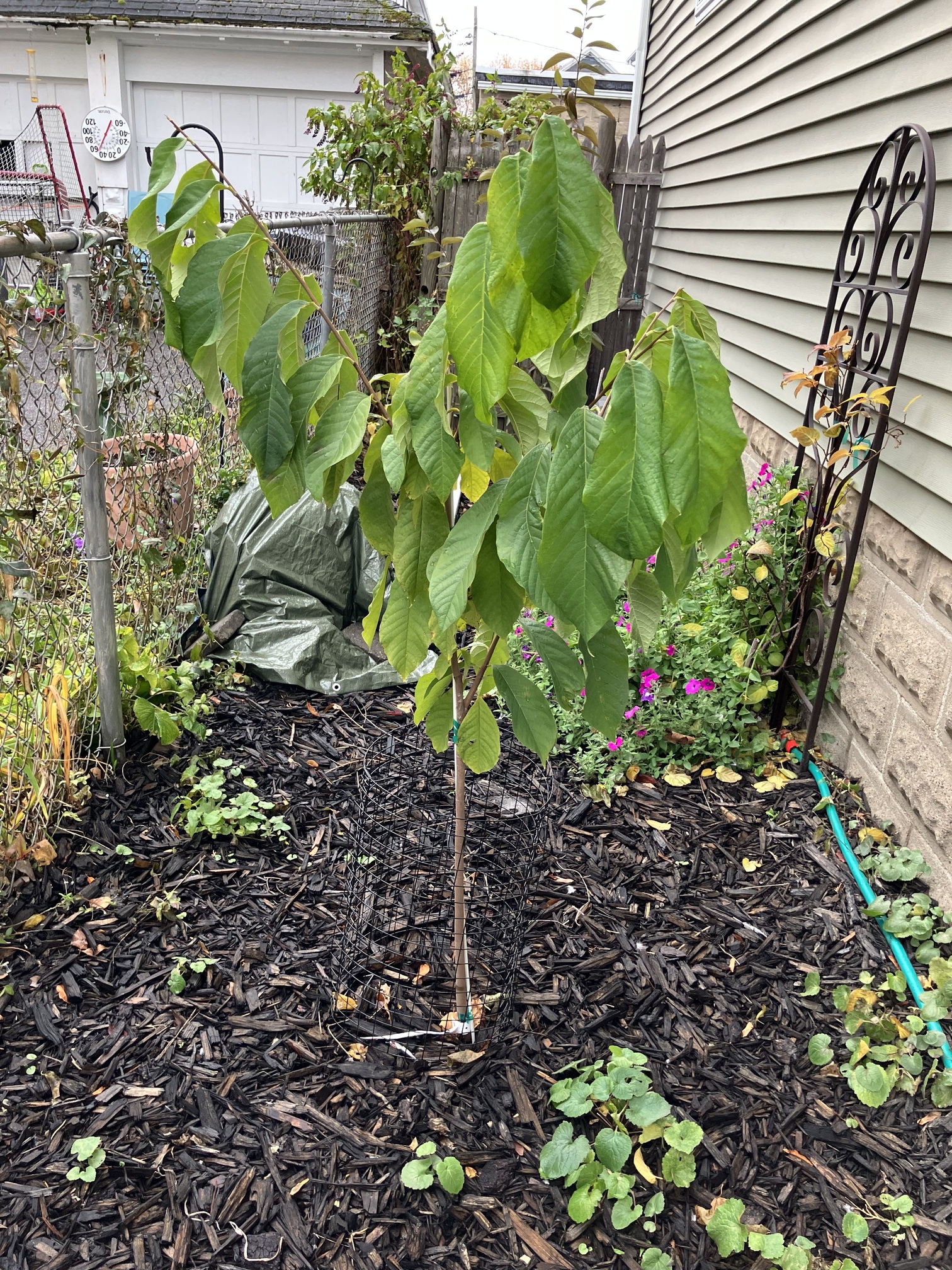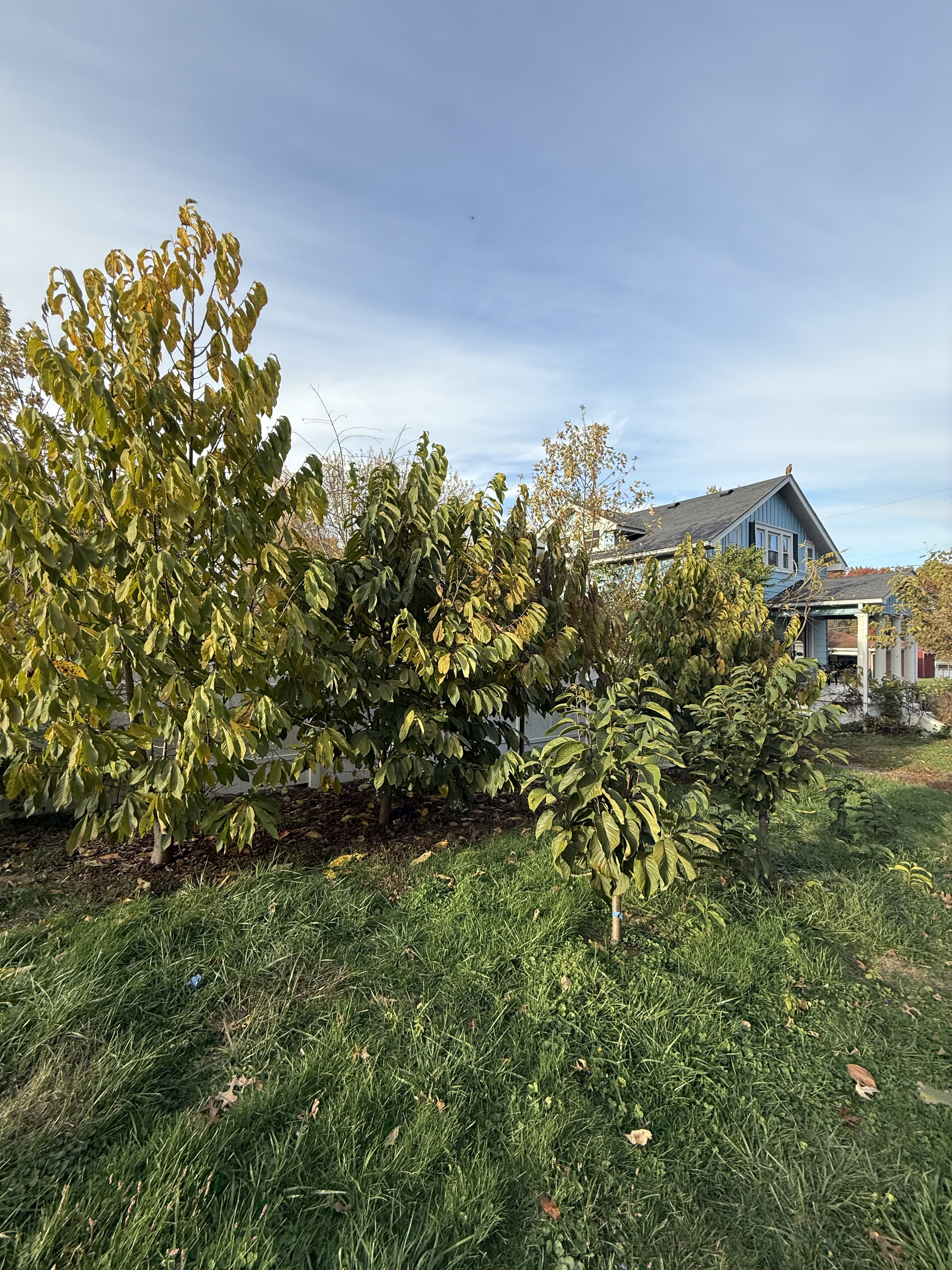 I have one neighbor with three trees that have all gone, yellow, and most other trees in my neighborhood have changed color and dropped leaves. But my Kentucky, legend has just a few yellow leaves, the sprouted one has none, and my Kentucky state seedlings are a little bit more turned, but not very. My David’s candy persimmon and even my hearty banana are all robust. However, my hearty kiwi has lost all leaves.