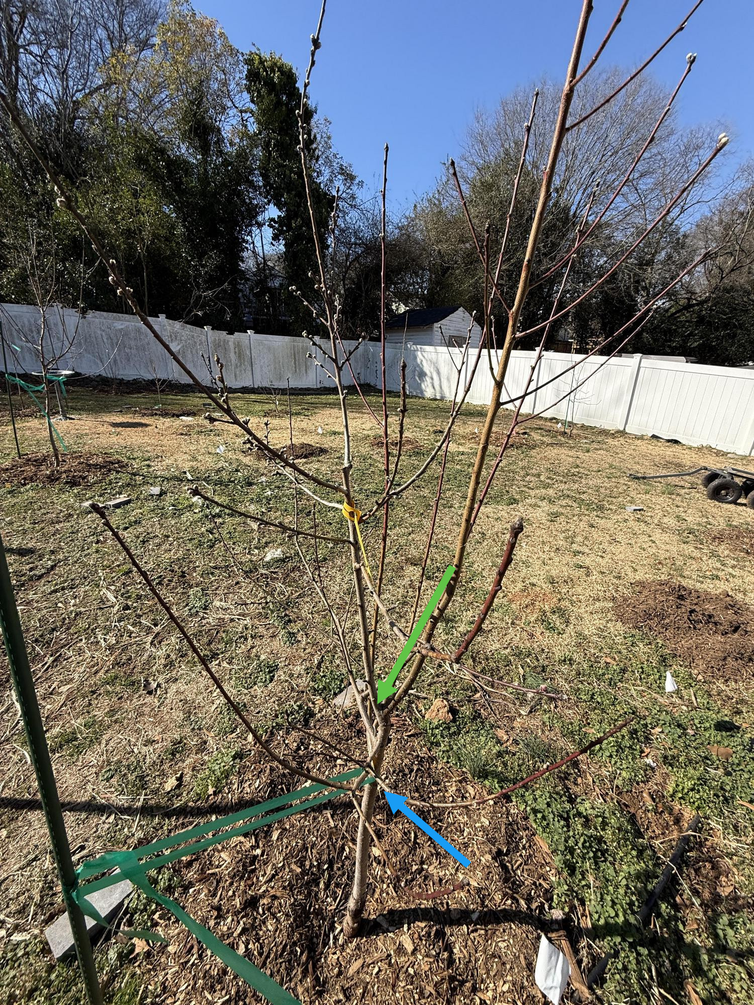 How it looks now, just under 1 year later, im left wondering should i even prune it at green where i wanted to now or leave it as modified central leader?