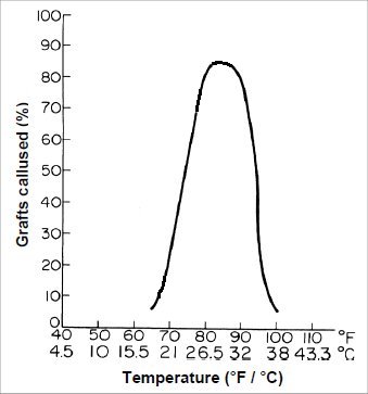 … Once upon a time I found a graph of peach callus rates, I can’t find it now but here is a similar one. Just subtract about 10F from this and you will get what the peach callous temps look like. You can see that when it gets too cold (at the graft, not the air) you get no callus. Too hot is also just as bad, above 85F gets too hot for peaches.