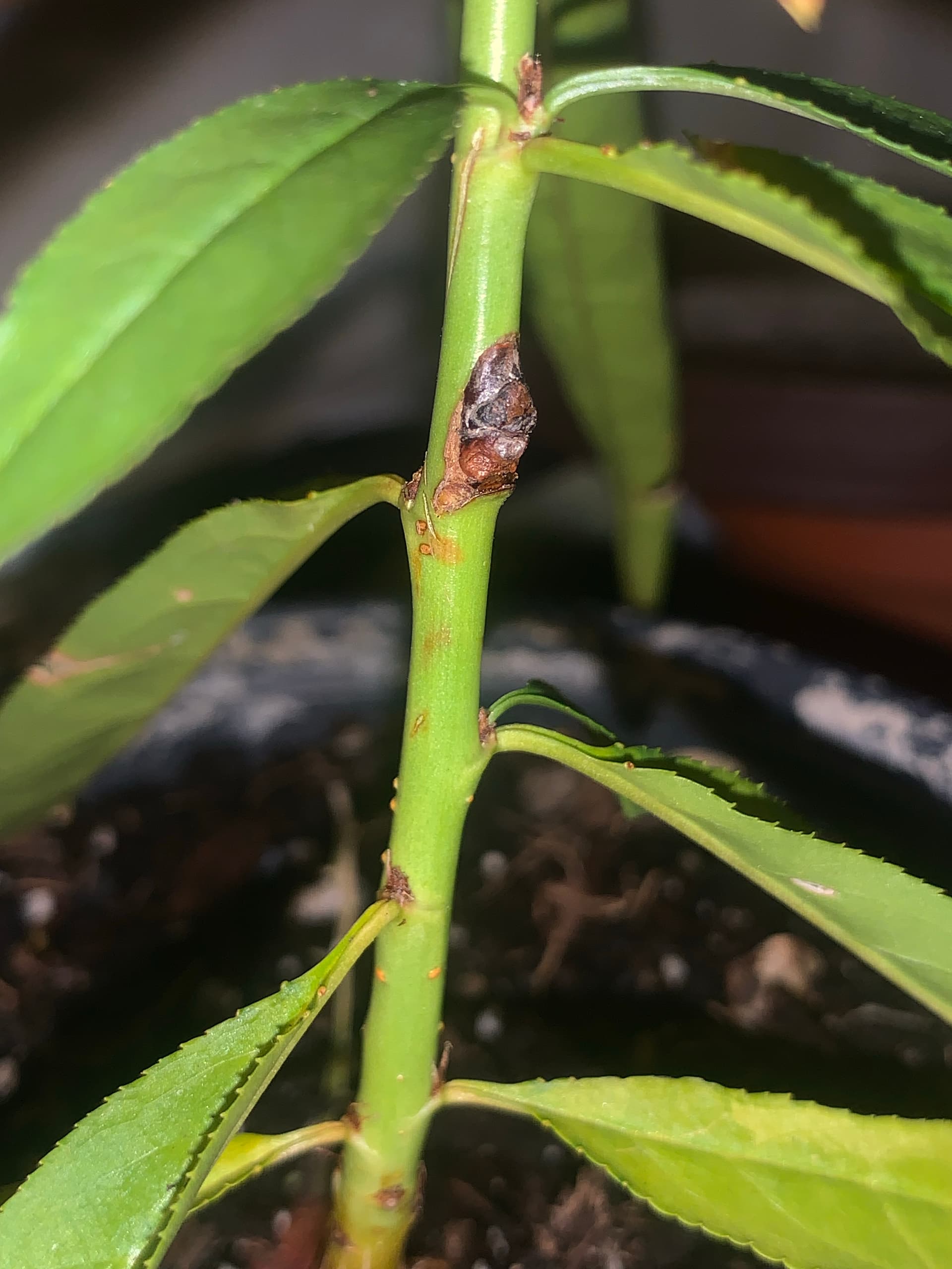 Anyway I am impatient. Here is a sugar pearls apricot on a 2 monthish old Lovell seedling. I have been experimenting with very young seedling rootstocks and it seems they will callus and join with chip buds at a very young age and within 14 days or so. Have not yet had a success but it seems feasible… should one cut growth above the bud in this case or let the rootstock grow out a few more months?