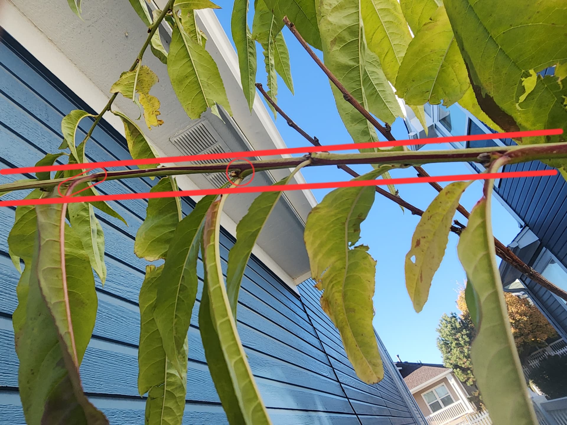 This plant gives you a chance to develop Starting point of skeleton at your eye level. Peaches are quite tough and by removing all branches, leaving 4 and pruining these branches even further to half will reduce burden on smaller root system.