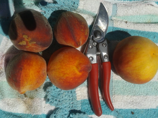 I took a pic today of the last of my Early Crawfords. They are smaller than Baby Crawfords but both varieties taste very good. I didn’t have a banana, so I used my pruners for size. The four peaches together are Early Crawford. The peach by itself is a Madison.