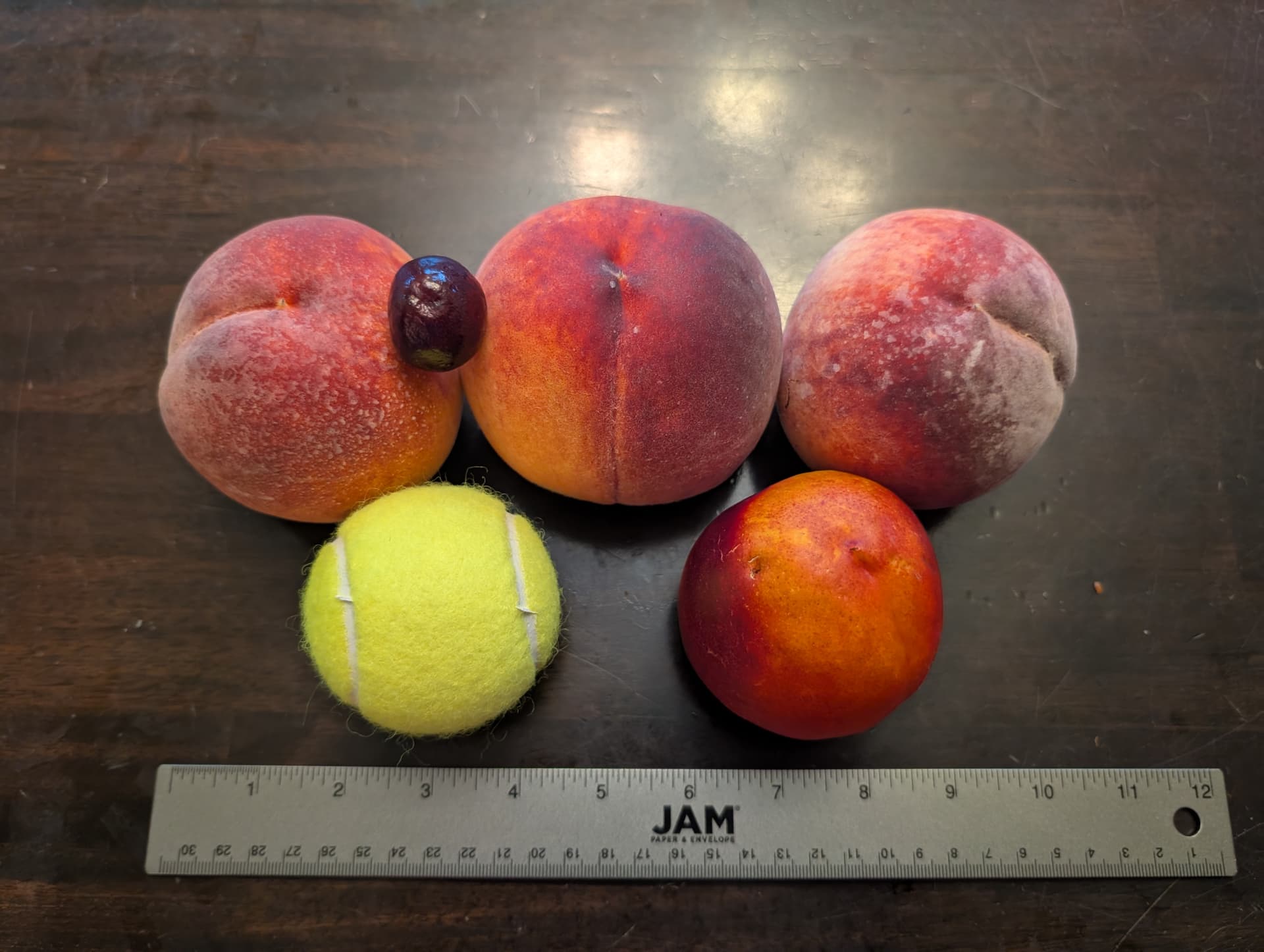 Pictures include a tennis ball, cherry, and store bought nectarine (bottom right) for comparison.