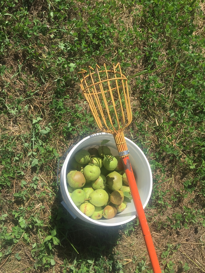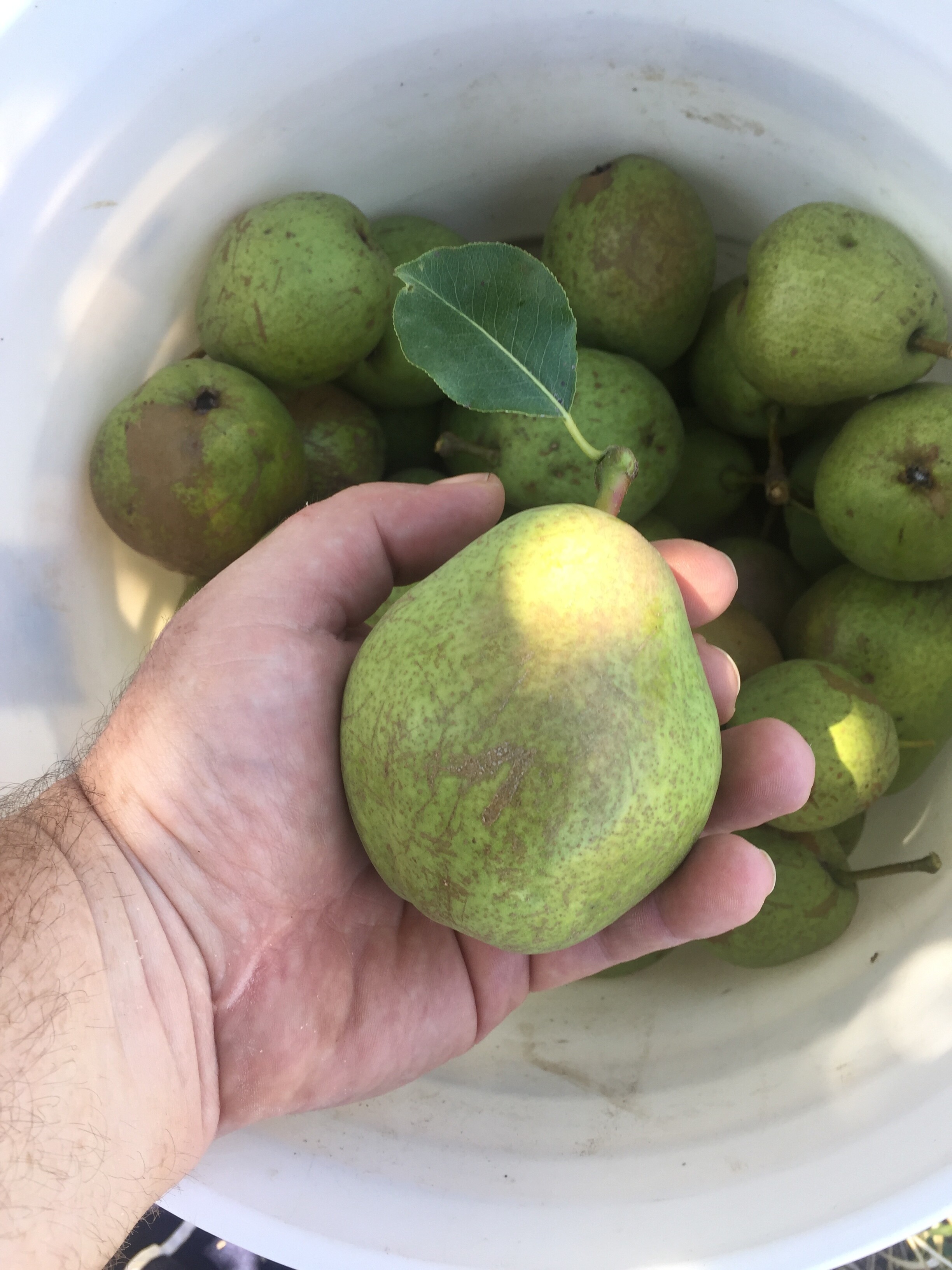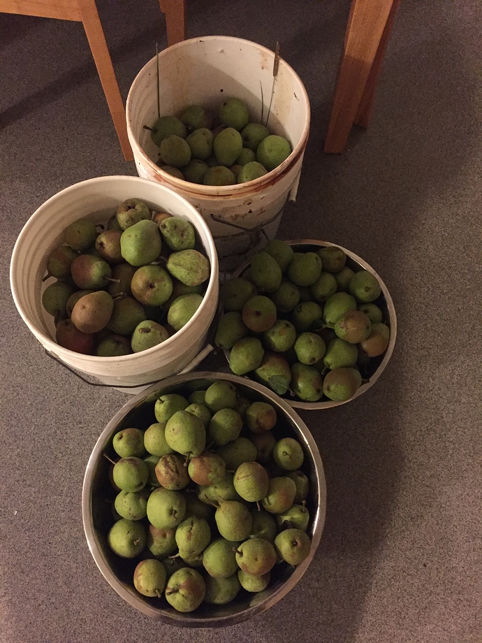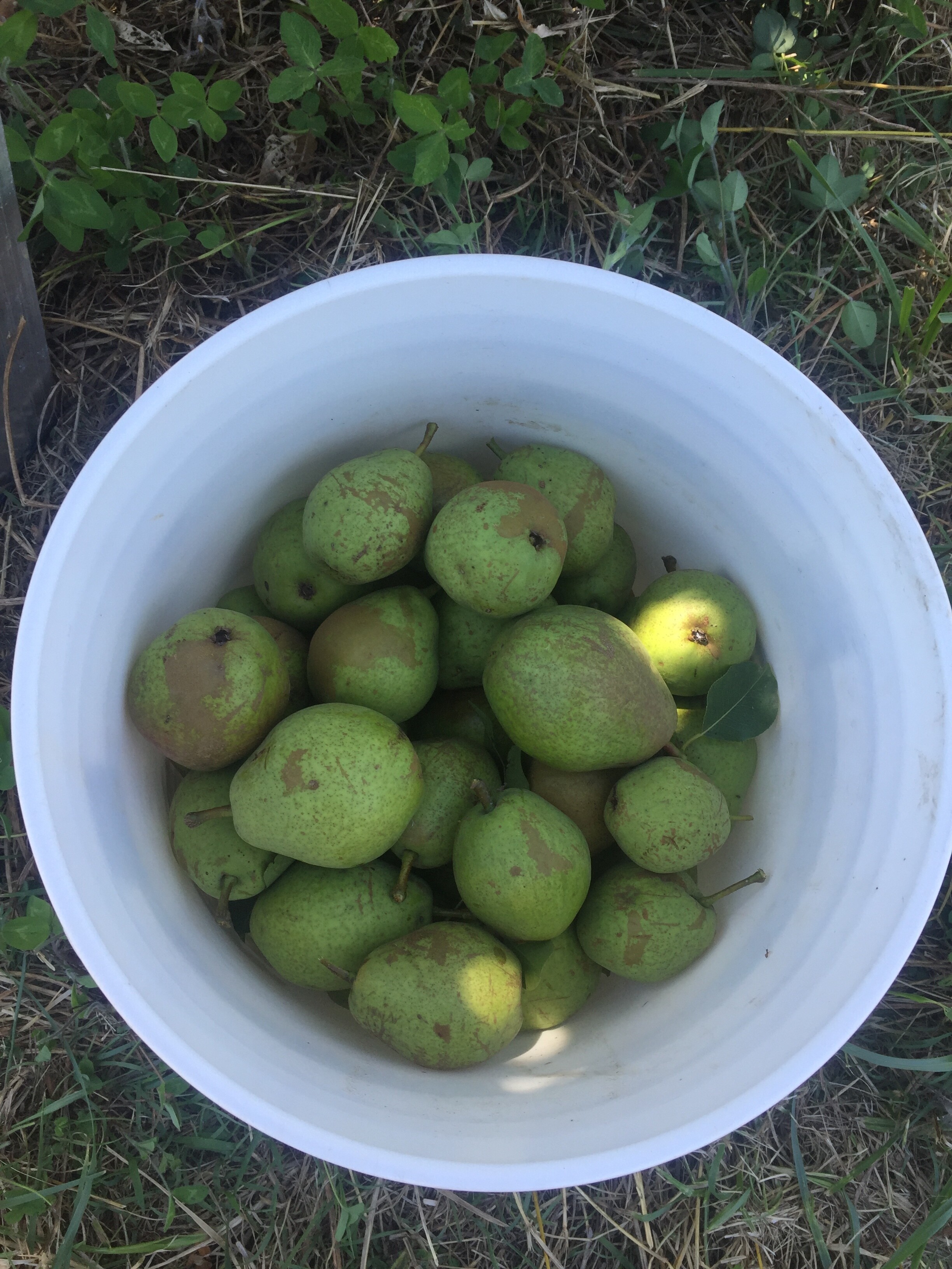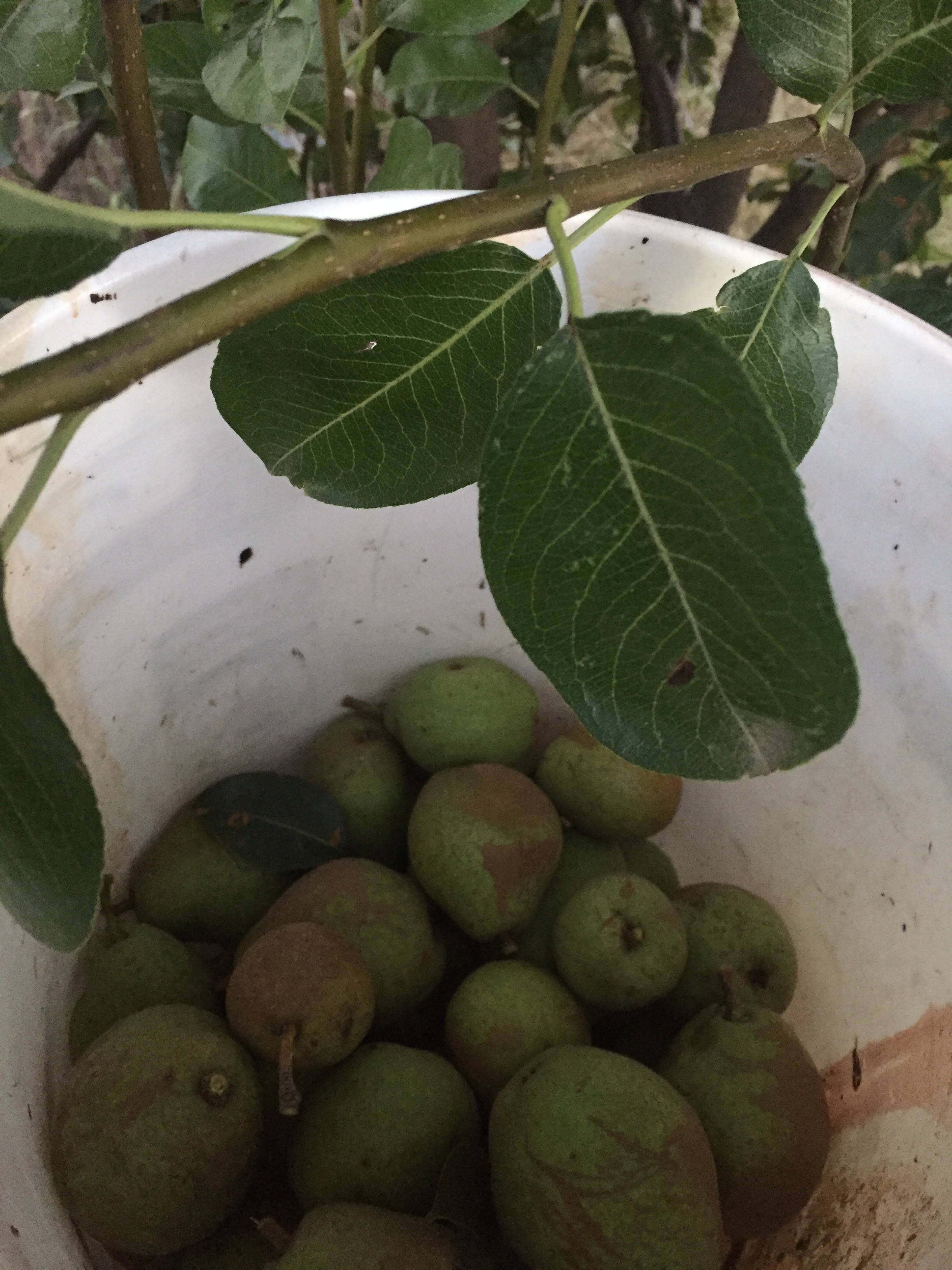 The 2017 harvest is beginning! These pears easily break off with a tilt test. We have a large rain storm coming in tomorrow and the winds would have dropped these pears. Tree number 1 is a 8 year old improved kieffer. The tree is light this year due to dicey spring weather. Total harvest is 3/4 5 gallon bucket of pears. Loss to varmints, insects, birds, disease = 0. Total Spray used = 0. Typically these pears ripen later than others not ripe yet so we cannot always go by the calendar.