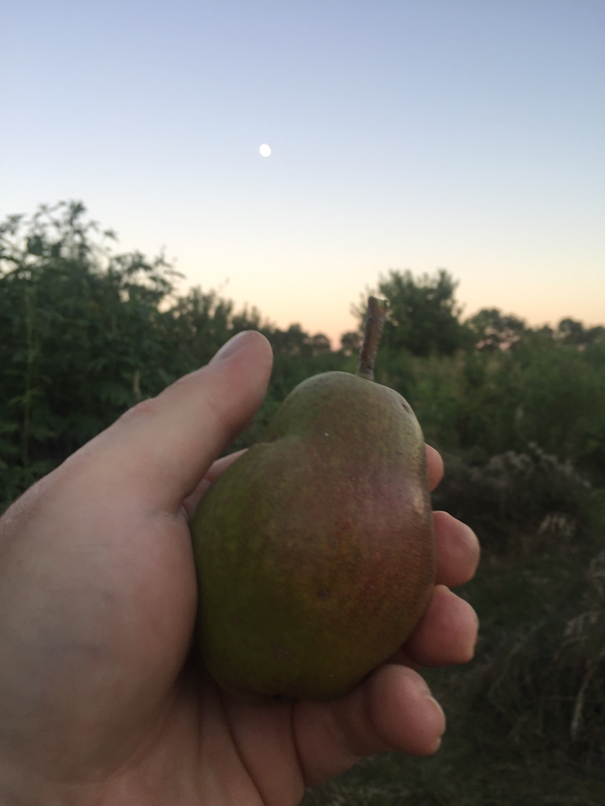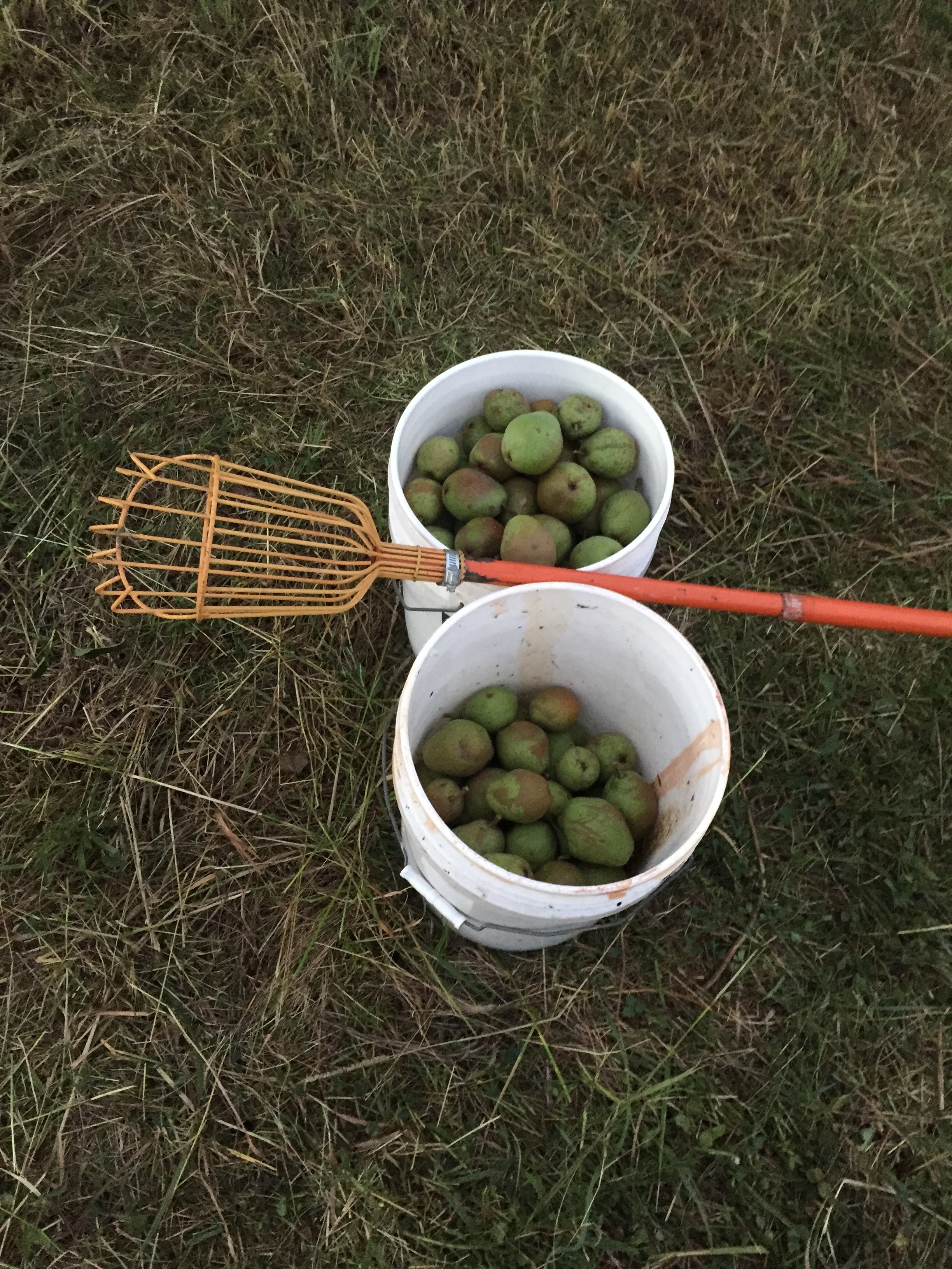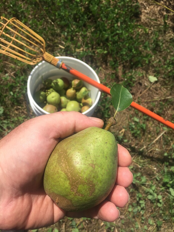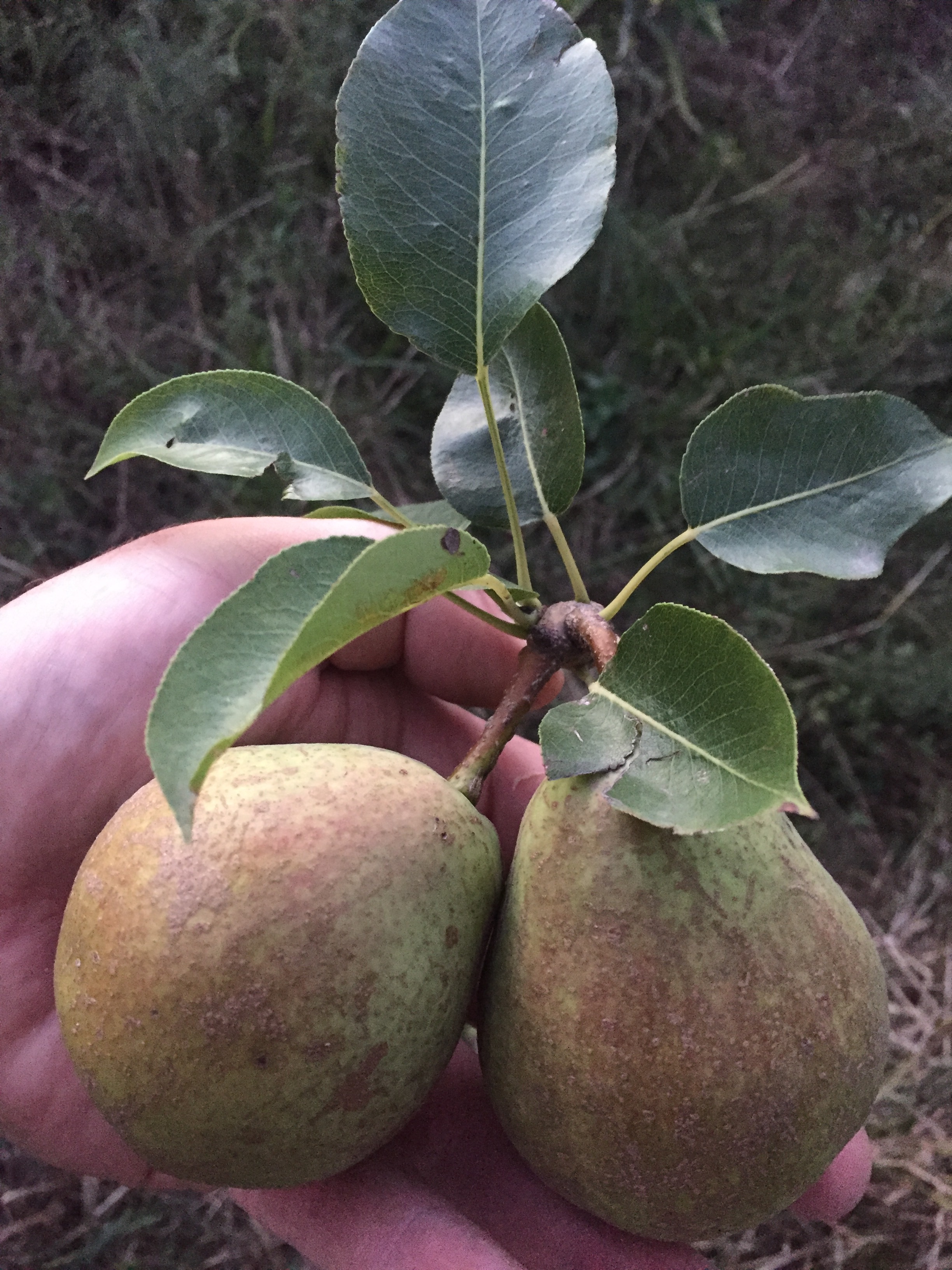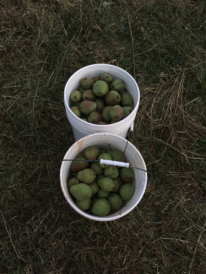 The 2017 harvest is beginning! These pears easily break off with a tilt test. We have a large rain storm coming in tomorrow and the winds would have dropped these pears. Tree number 1 is a 8 year old improved kieffer. The tree is light this year due to dicey spring weather. Total harvest is 3/4 5 gallon bucket of pears. Loss to varmints, insects, birds, disease = 0. Total Spray used = 0. Typically these pears ripen later than others not ripe yet so we cannot always go by the calendar.