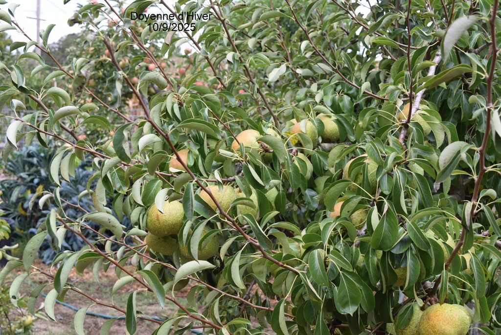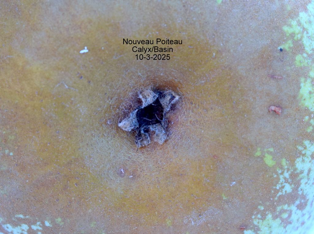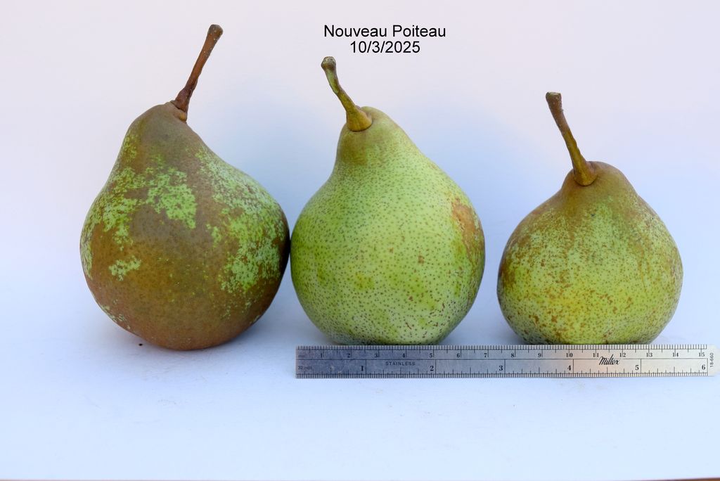 Nouveau Poiteau was partially picked on October 3, 2025, but I’m still picking them on October 9. This is a Van Mons pear dating to 1927. It has been used as a pollinator for Comice orchards in England. Morgan says it is still green when ripe, but is a good pear. She says pick early October and eat in November. But it is stored commercially for several months.
