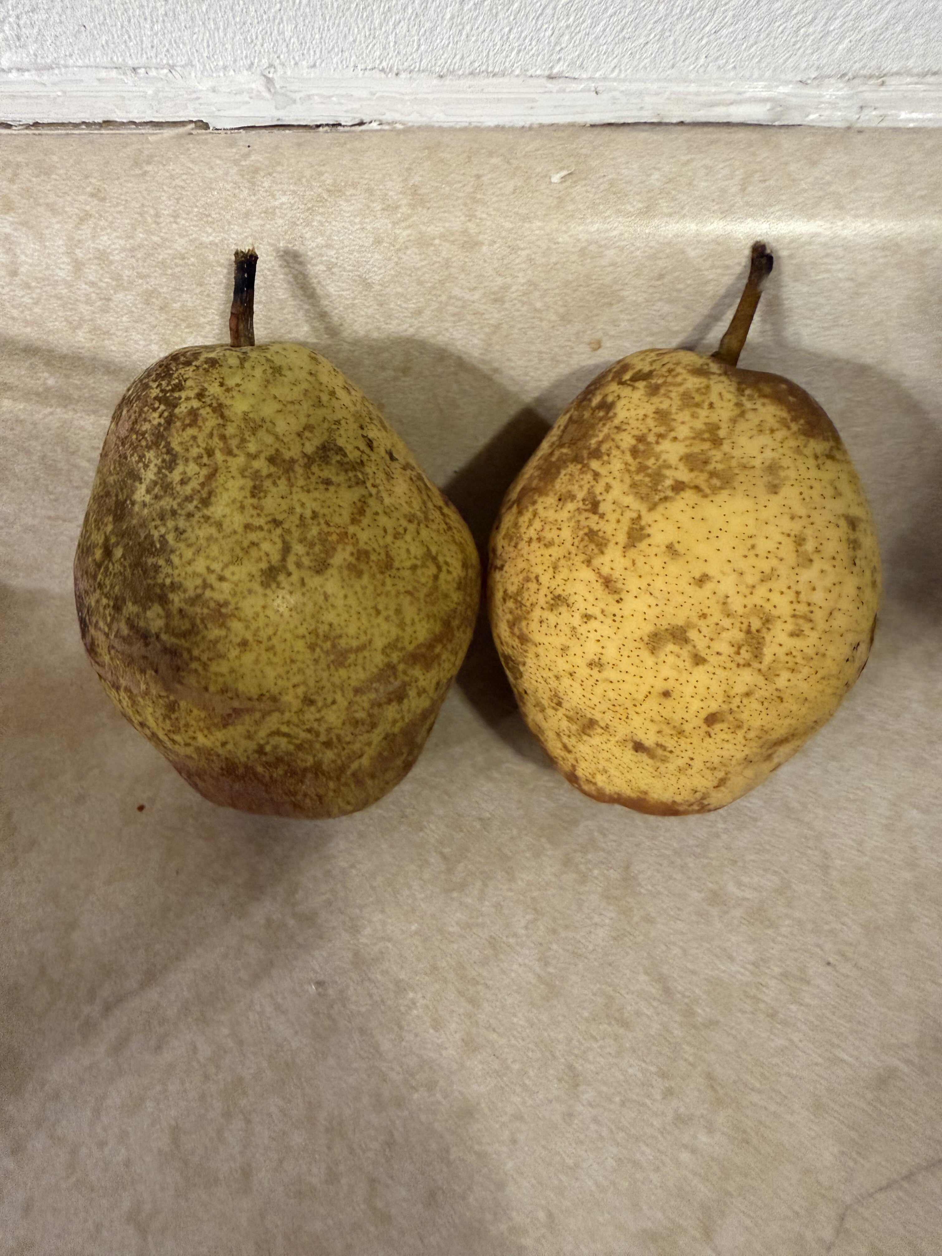 Bartlett Pears from my neighbors tree (I have it newly grafted on a Callery rootstock). It spent 2 weeks in the fridge and 4 days on the counter. They were perfect!