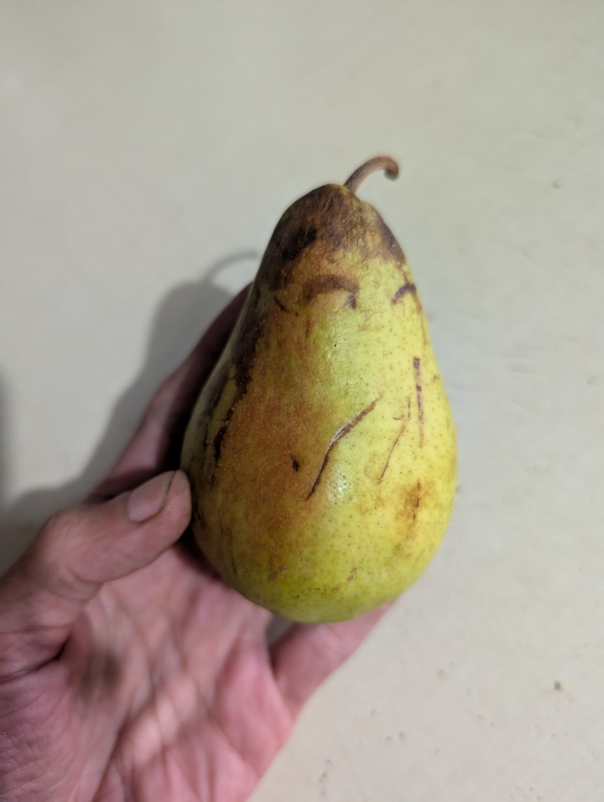"The stem.—Varying as little as any other character of the pear, the stem is much used in identification. It may be long and slender, as in the Beurré Bose; short and thick, as in Doyenné du Comice; fleshy, as in Louise Bonne de Jersey; clubbed, when enlarged at the end; and lipped when the flesh forms a protuberance under which the stem is inserted. The stems of pears are often set obliquely as in Beurré Clairgeau; or are crooked or curved as in Howell. In a few varieties the stems are channeled. The stems of some pears have distinguishing colors, those of others are pubescent. In some pears, as Souvenir d’Espéren, there are bud-like projections on the stem.
