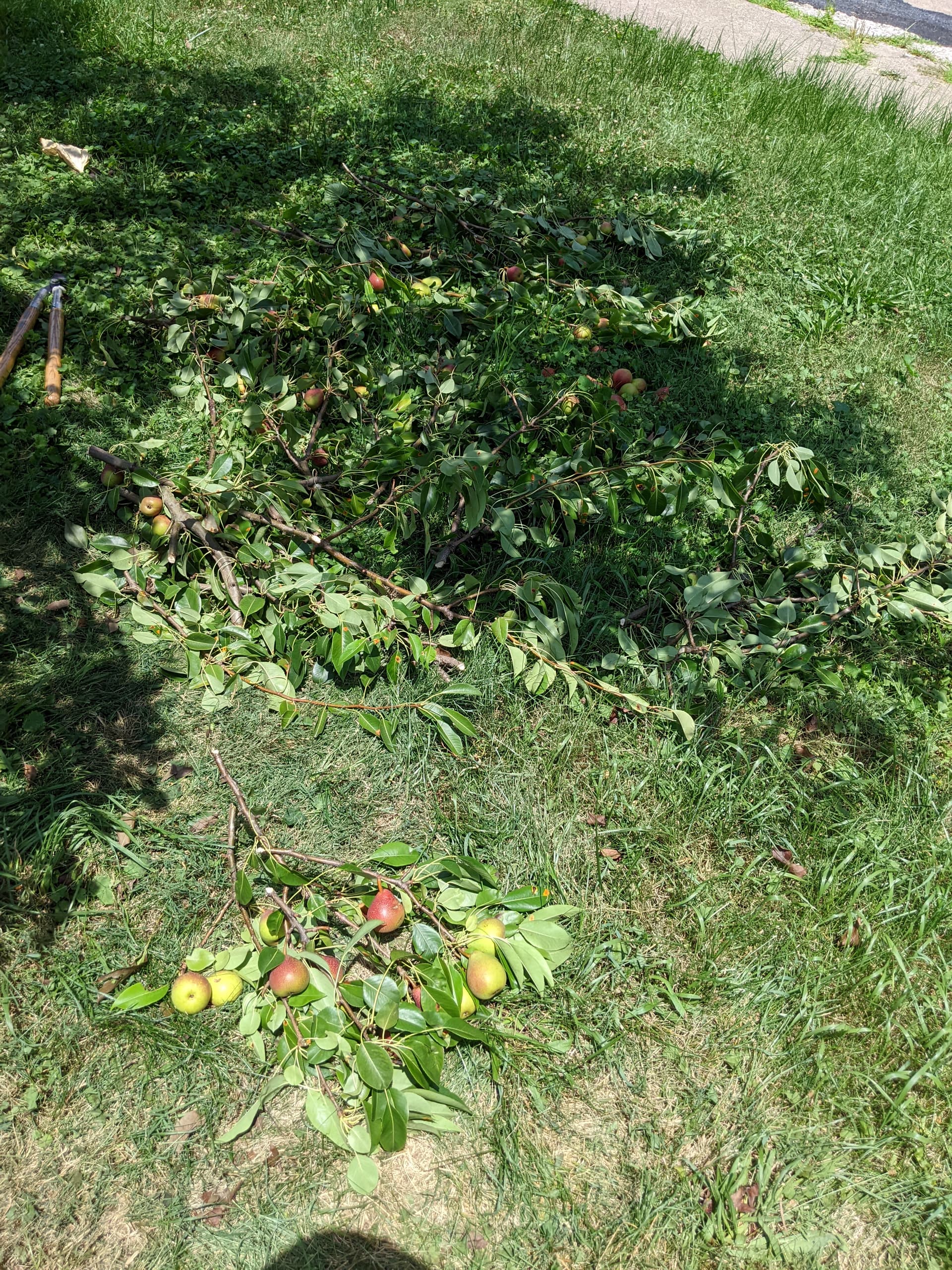 I got to taking the broken branches down. First de-fruiting the branches, then cutting the branch in sections starting with the ends before I got to the largest/thickest part towards the break.