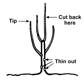 At planting, prune the trees back to single whips 24 to 30 in. from the ground line. After a single growing season, your tree should look similar to the tree in Figure 1. Prune off any limbs that are less than 18 in. from the ground, leaving four to six limbs to be the scaffolds (main fruiting limbs on a mature tree). Figure 2 illustrates what Figure 1 should look like after pruning.