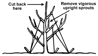 After the second season, tie down the lower scaffolds to a 45-degree angle to help open up the tree to light. Prune out crossing, broken and/or diseased limbs and also vigorous upright (vertical) sprouts that may develop along the limb.