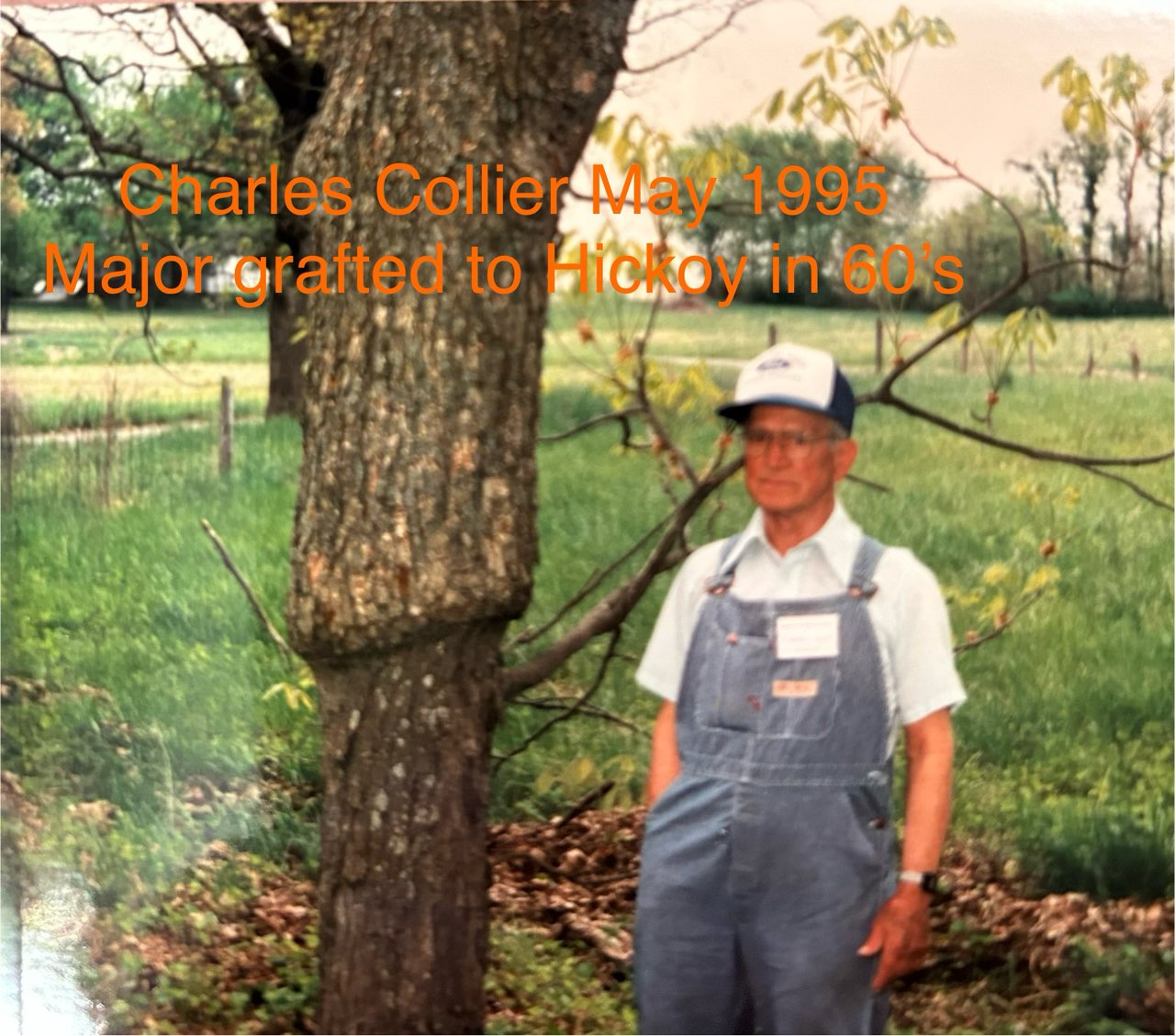 Visited a friend’s pecan orchard over in far western KY this past summer. Her father started planting/grafting pecans in the early 1960s. Photo is of her father, in 1995, with a ‘Major’ pecan that he grafted onto a pignut hickory (C.glabra) growing in the hog lot, almost on the edge of a small pond, sometime in the 1960s. The tree is still alive and bearing - and still has a low branch of pignut, below the graft union.
