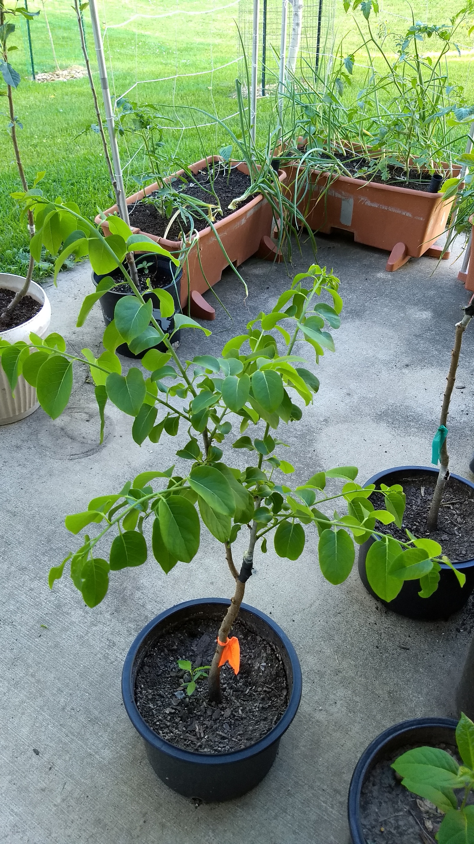 Once I was convinced the grafts took, I transplanted them to 3 gal rootbuilder II containers and kept them on my deck for the summer. By this spring I had learned to catch psylla and treat it before it could cause too much damage. Here is a picture of one that I took on July 11th, so it has grown a bit since then: