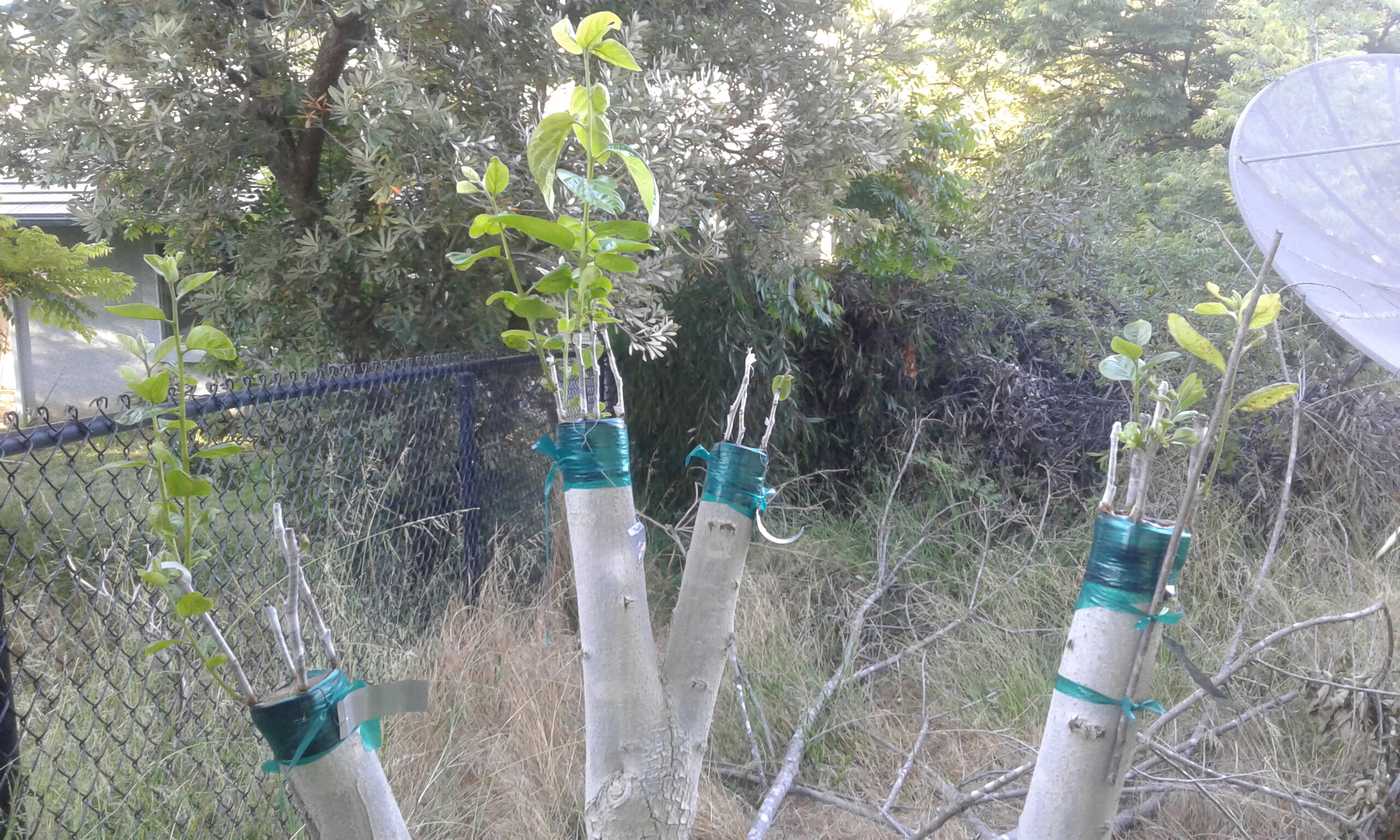 Large fat green buds are now emerging from the Giant Fuyu bark grafts that were made 24 days ago. I’ll remove the lunch bag placed over the top when I see a sizable leaf.
