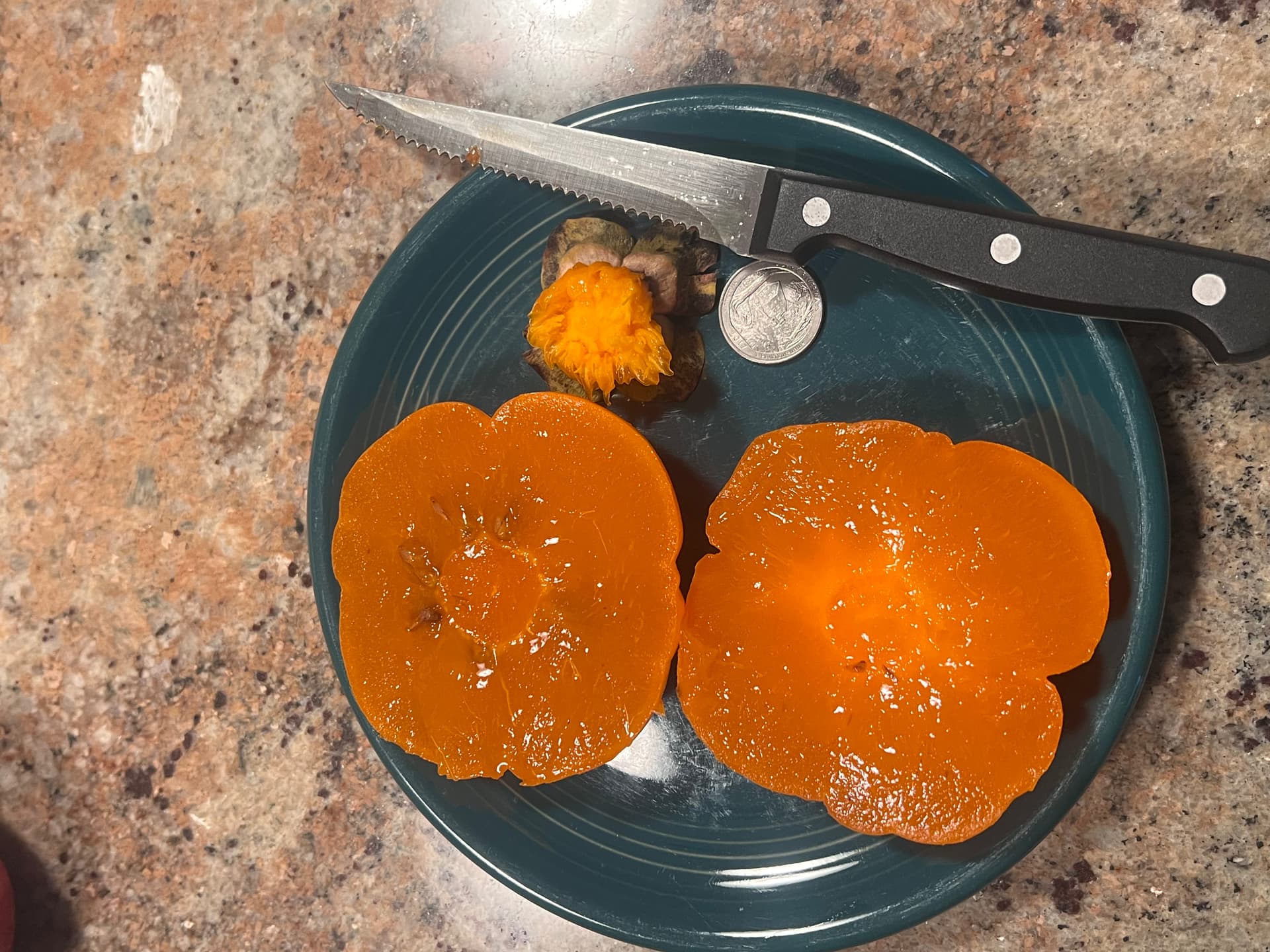 Last year I had a considerable range in quality in my persimmons – from delicious to meh – and I wasn’t sure if it was due to how much time they ripened outside vs. inside, something intrinsic to the fruit itself (perhaps more sun exposure, more dedicated leaves/fruit, etc.), or just my young trees being fickle.