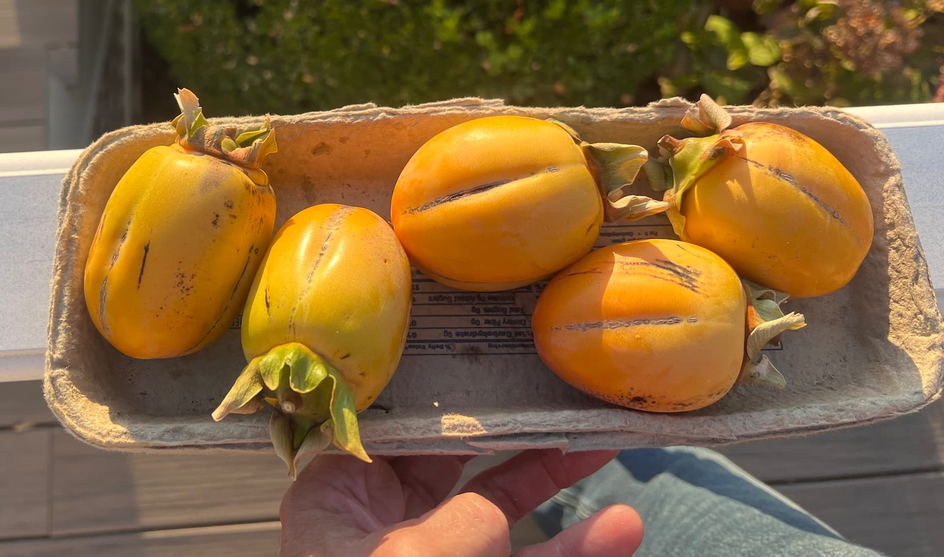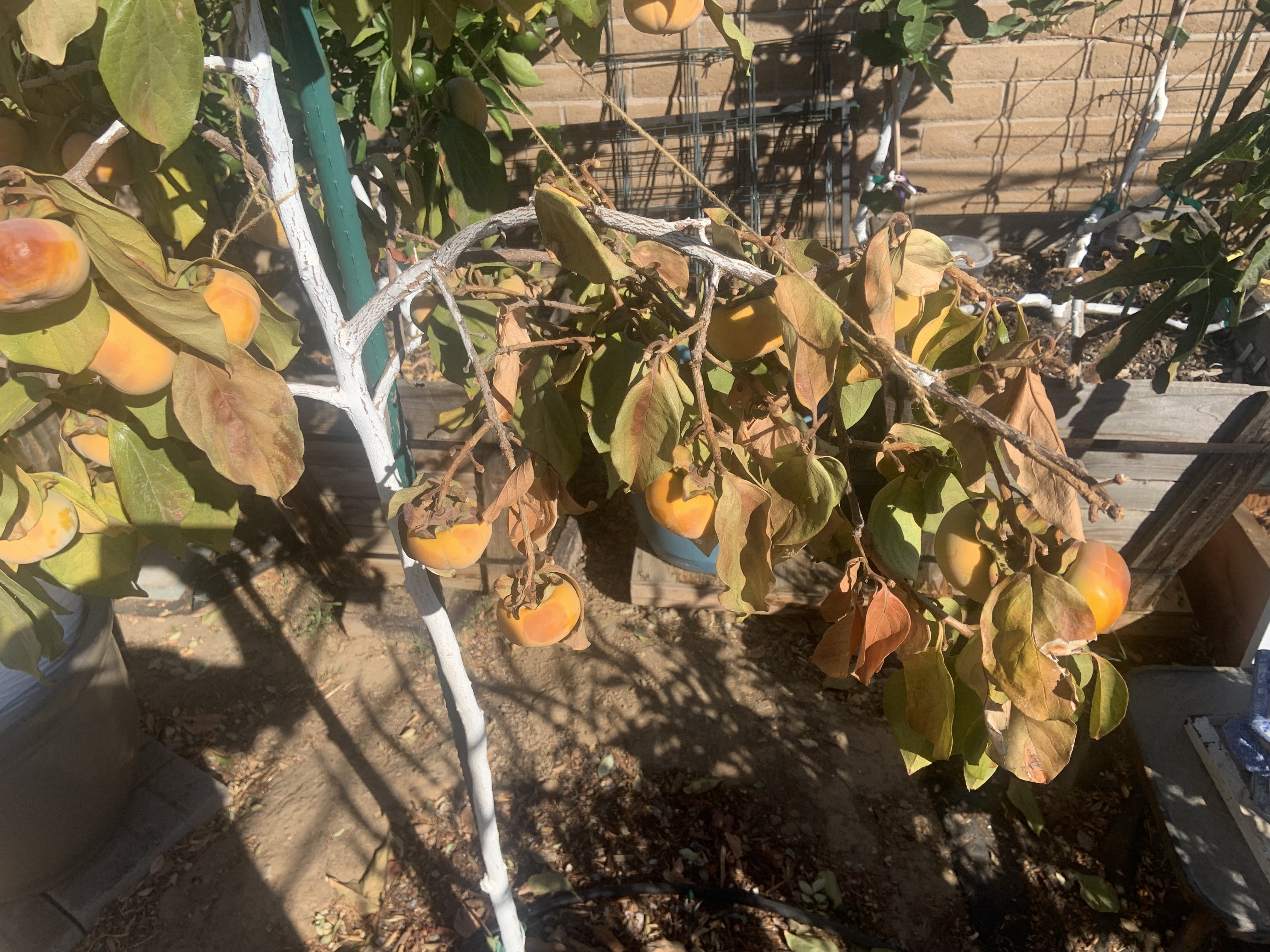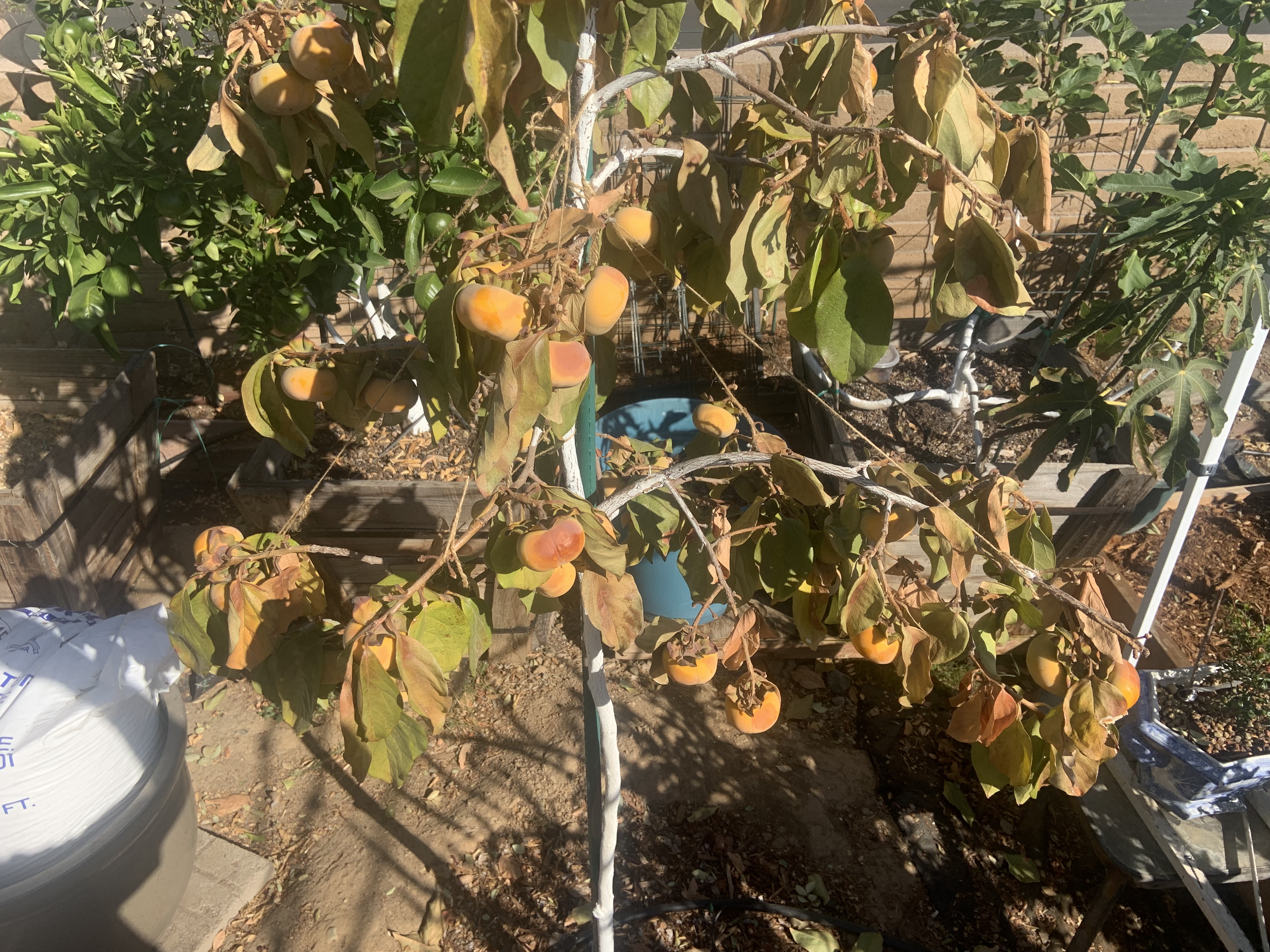 These are the last Saijo persimmons on my potted tree. I’ll let them finish ripening indoors. It’ll take just a few days. I’ve already eaten a half dozen or so, which were very goods.