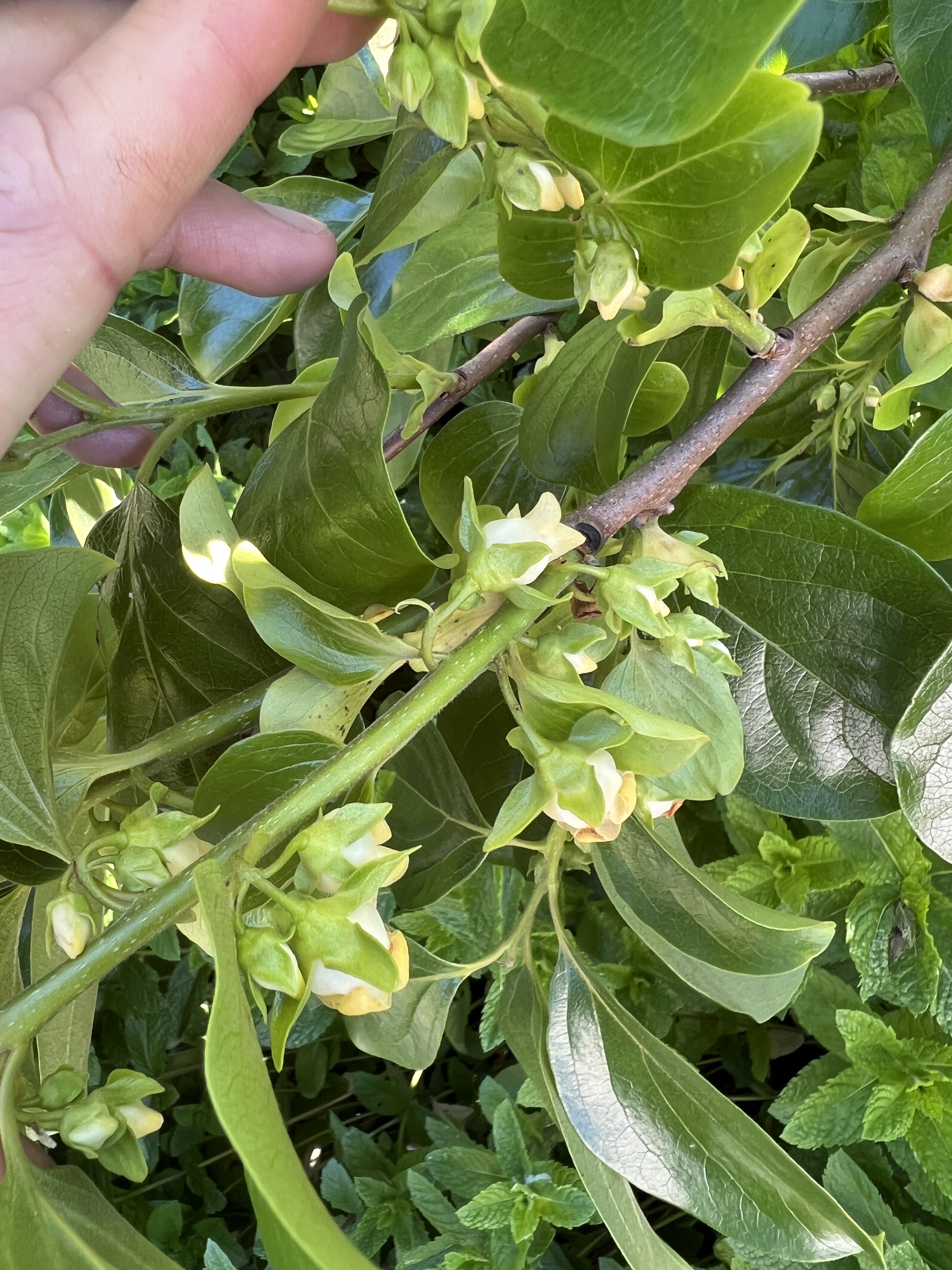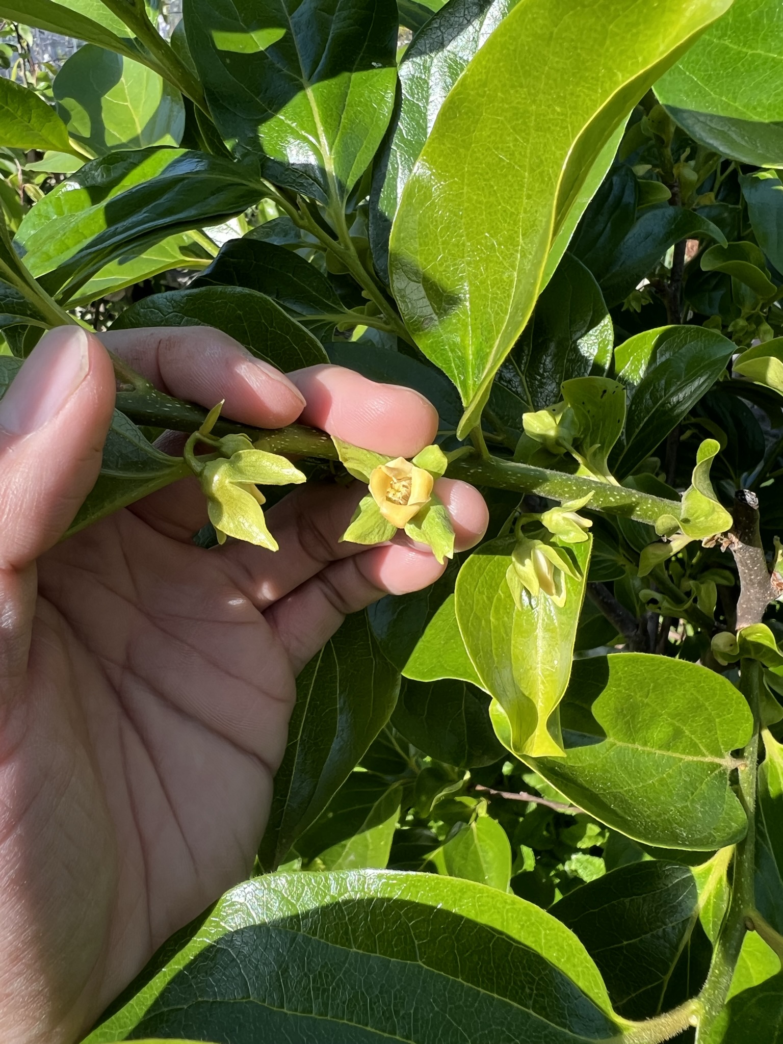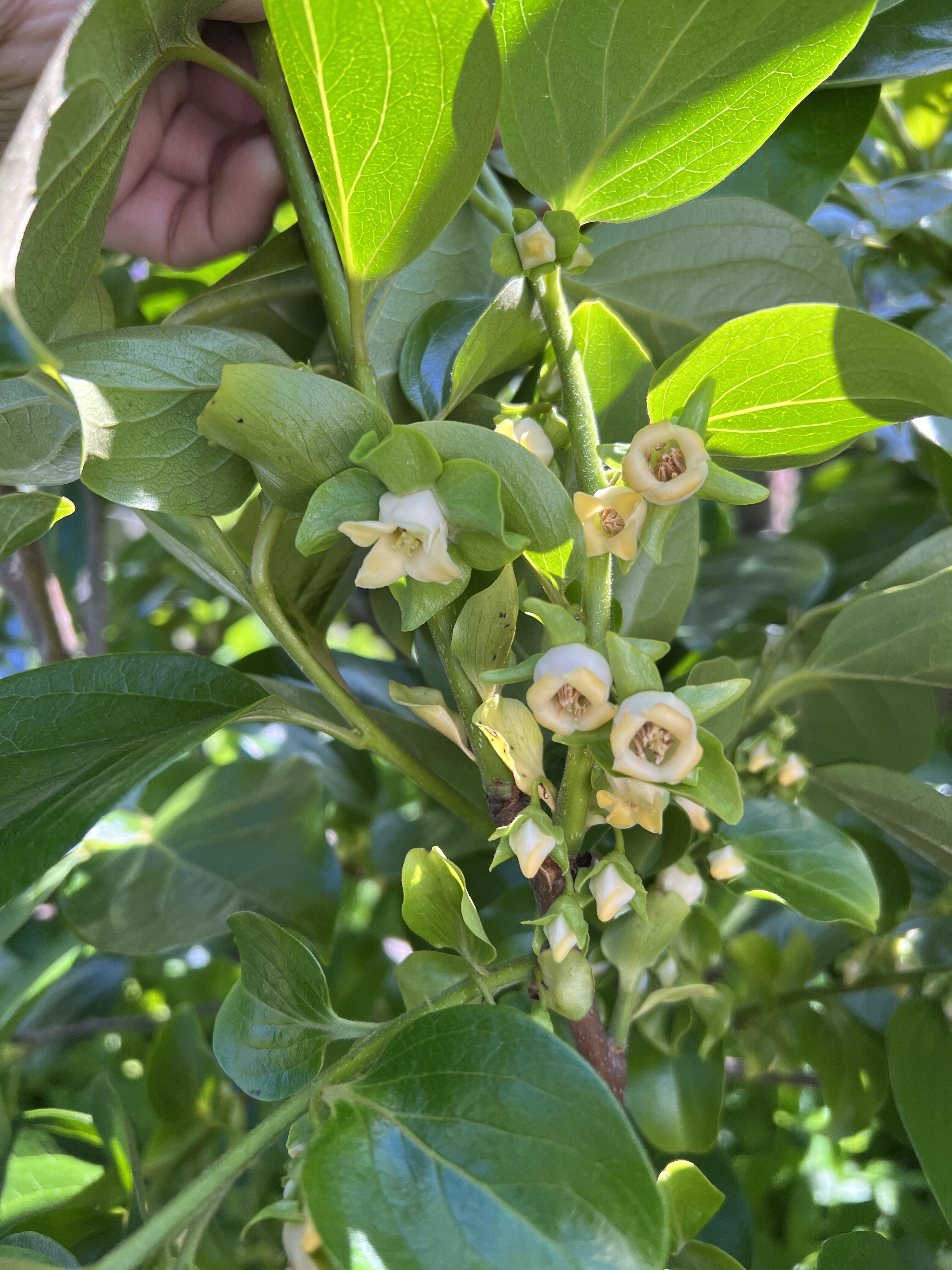Asian persimmons are in full bloom here. Just a few flowers (male and female) on my California Maru. Chocolate has a couple hundred male flowers and three females ![]()