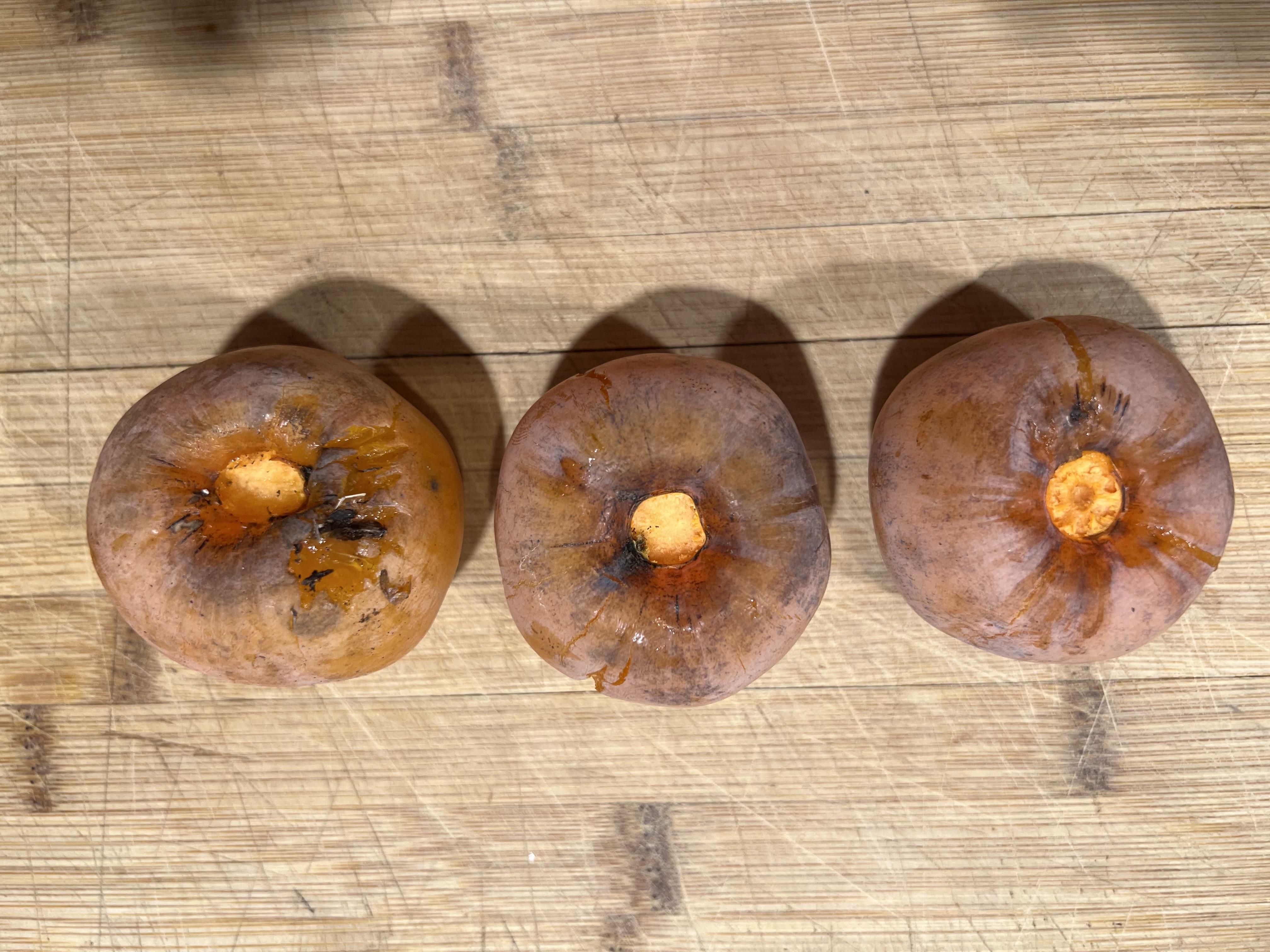 The smaller fruit fell off the tree, pale orange but with soft flesh. The larger fruit was in similar condition, a bit deeper orange, starting to split, so I picked it.