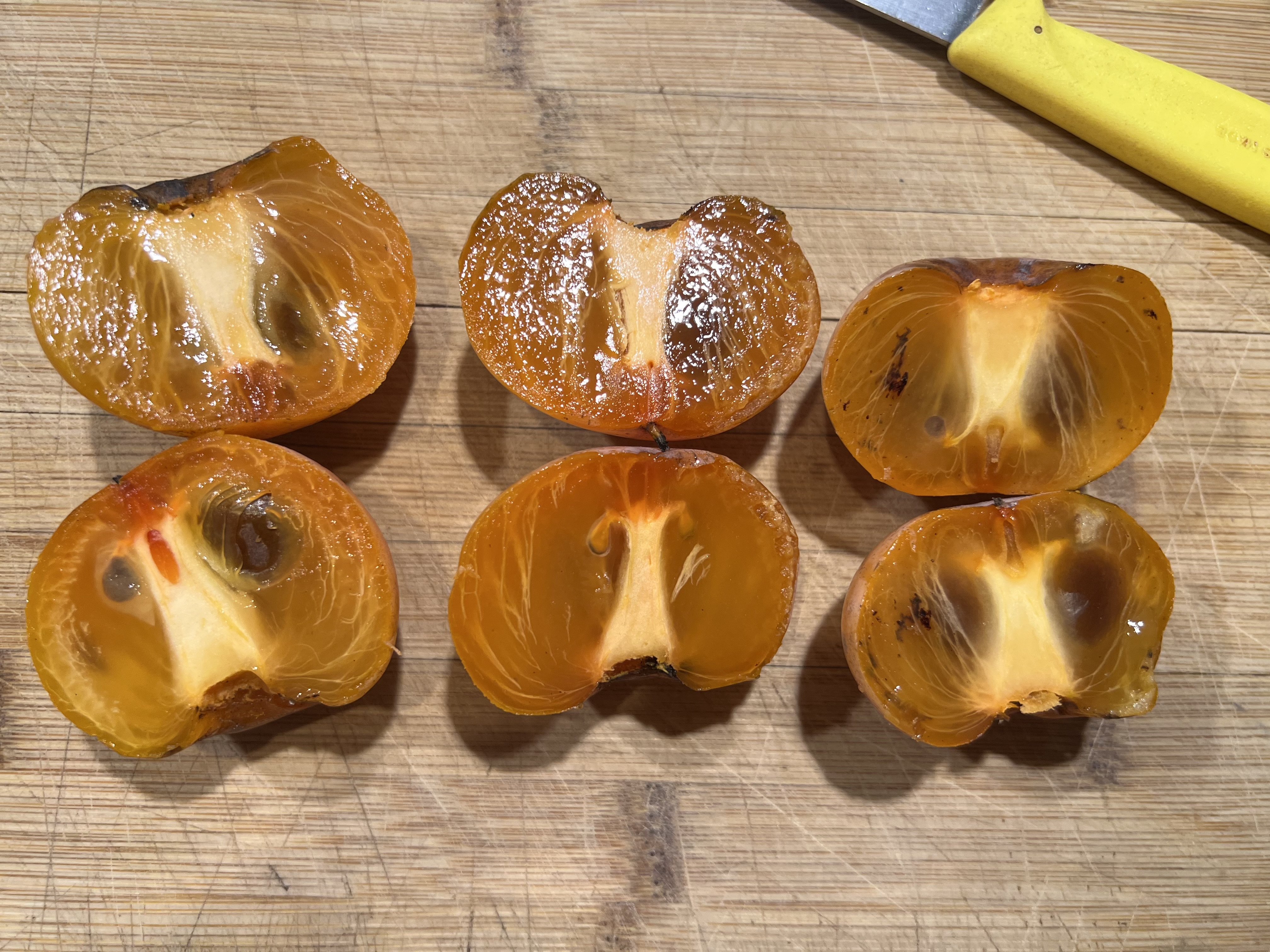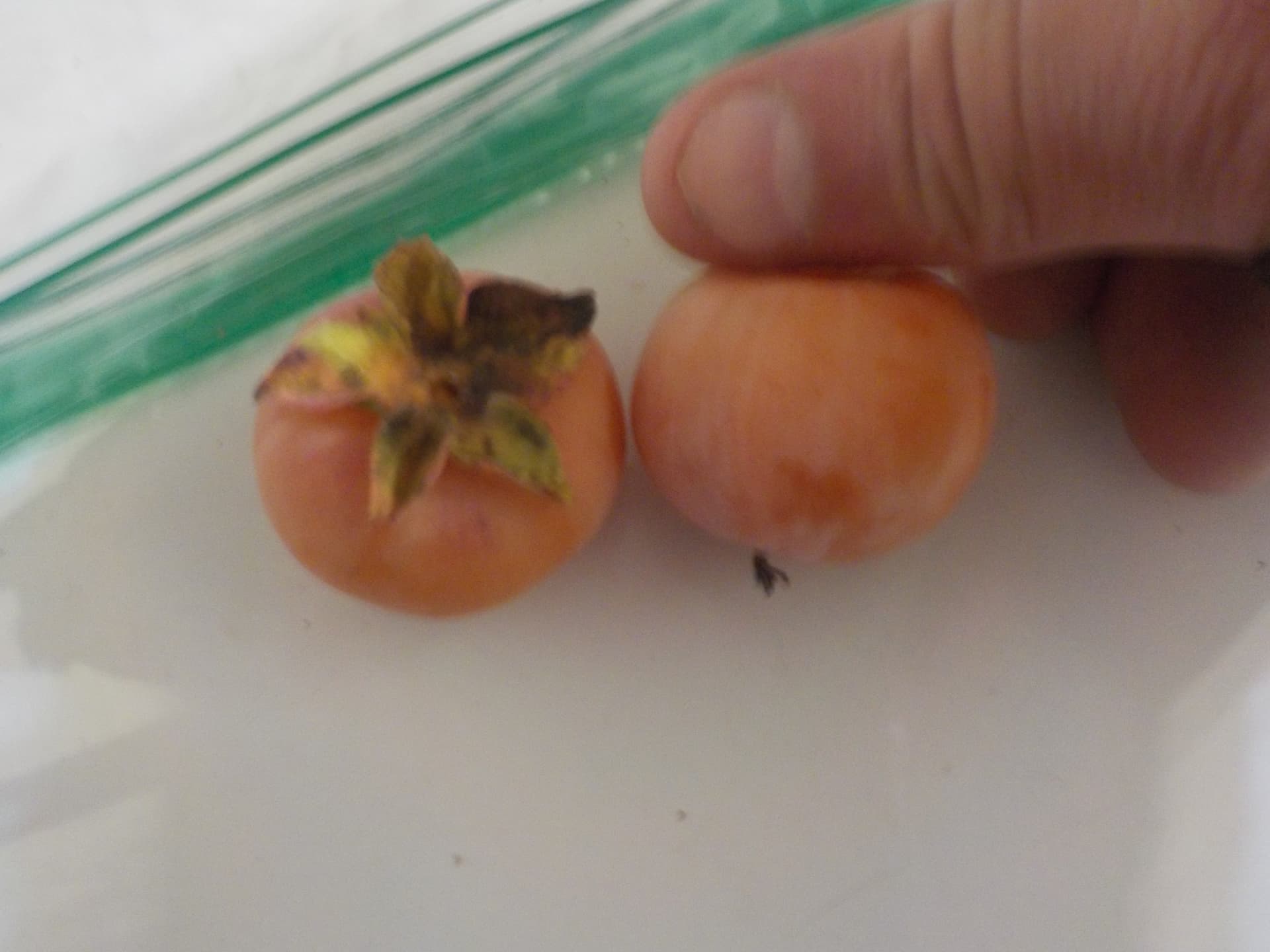 All were seeded, with Prok and H-63a having the most seeds and this time LD only having 2. I don’t think this is indicative of any long-term likelihood of one or the other varieties being more likely to have seeds. H-63a is on the Prok tree, which is quite large at this point with a hundreds of flowers this spring so I think it just brought more pollinators. In previous years with a lot fewer fruit Prok was more likely to have only 3-4 seeds per fruit. The H-63a tree is in the backyard and a much smaller tree. That said, if it does turn out one or the other of the varieties is most likely to have fewer seeds that would be a point in its favor. I have no idea where the male tree is relative to my trees, so it is clear that native persimmons can be pollinated by male trees fairly far away.