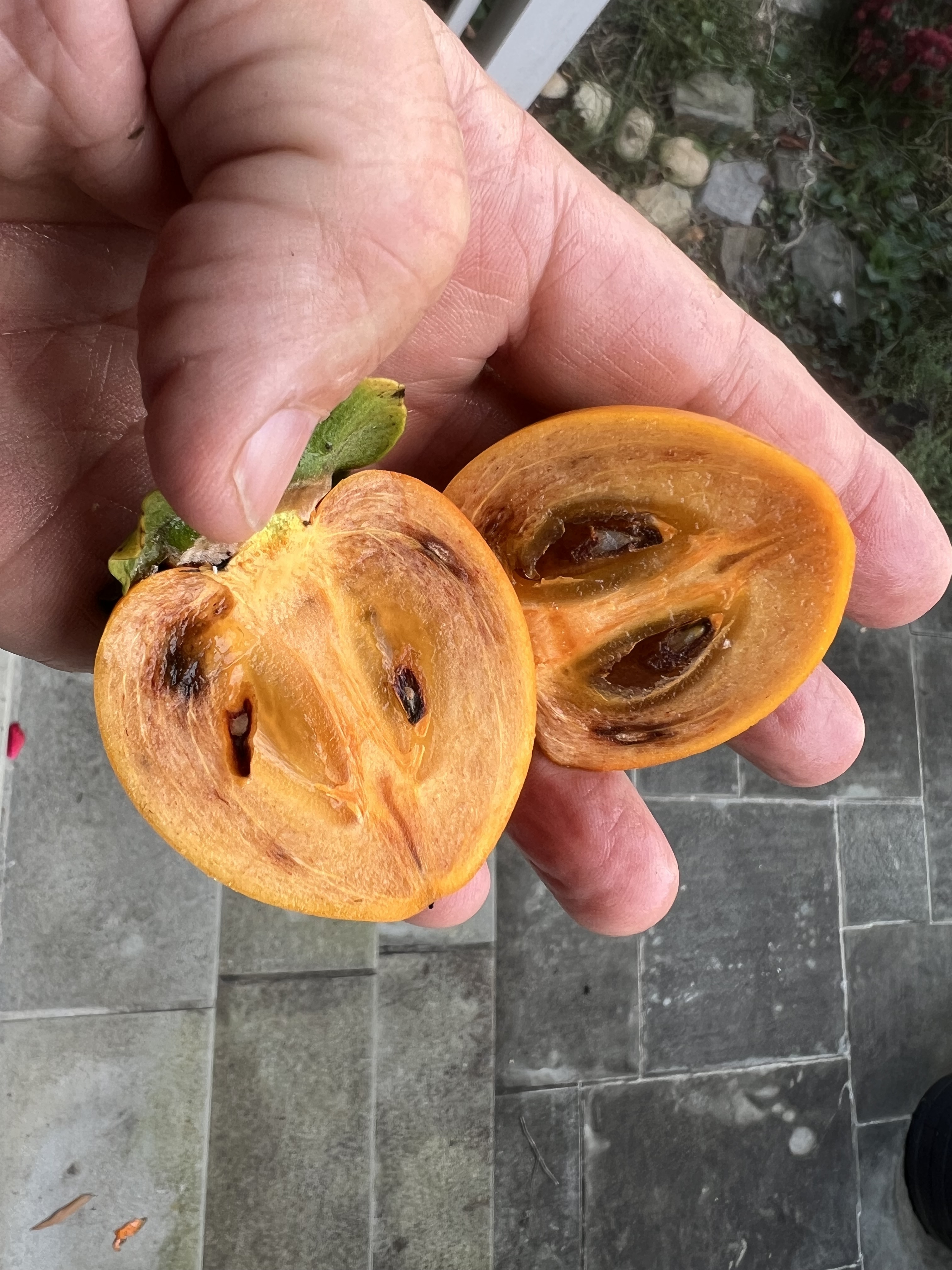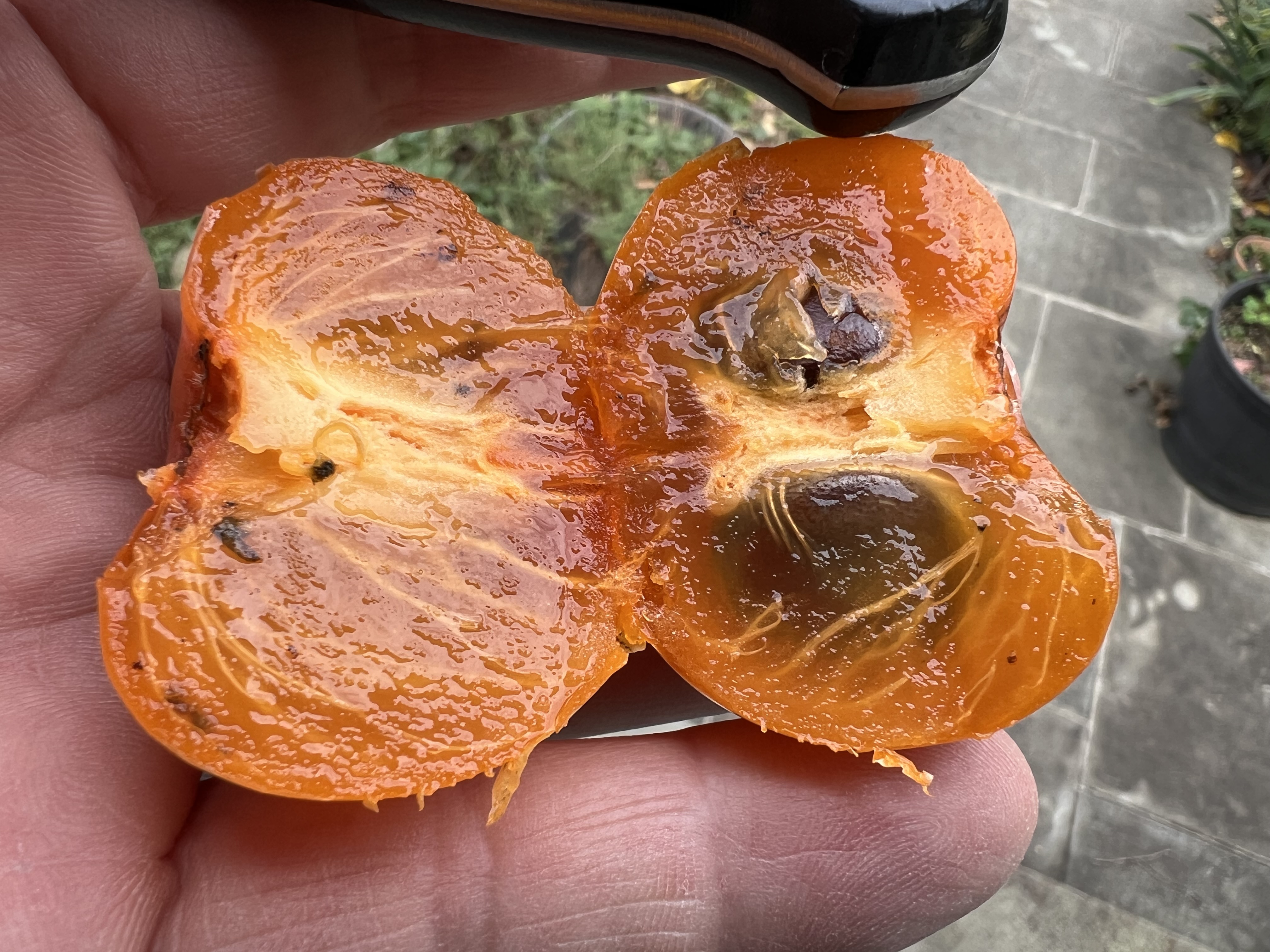 @ramv – Just to provide more data, I picked this not quite ripe (and slightly damaged) Izu persimmon from a young tree. As you can see, it is seeded – there’s a Nishimura Wase nearby.