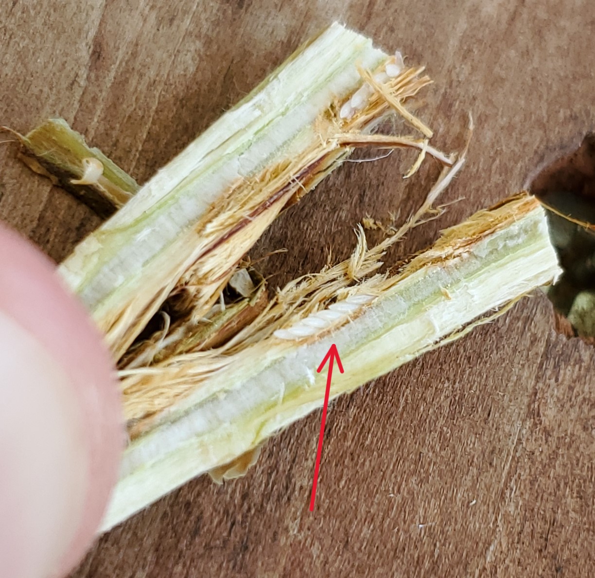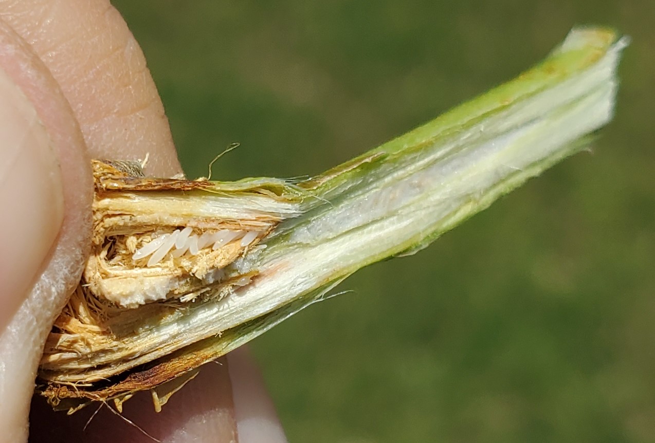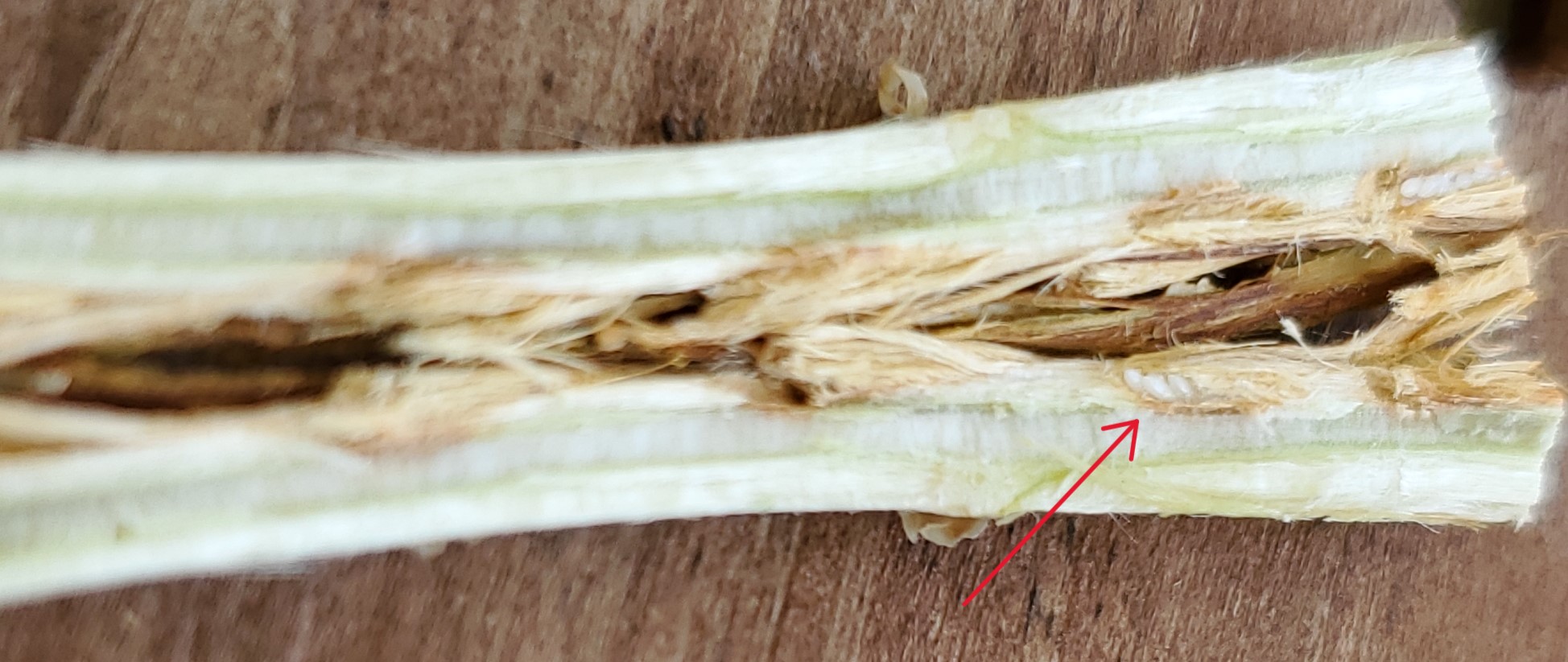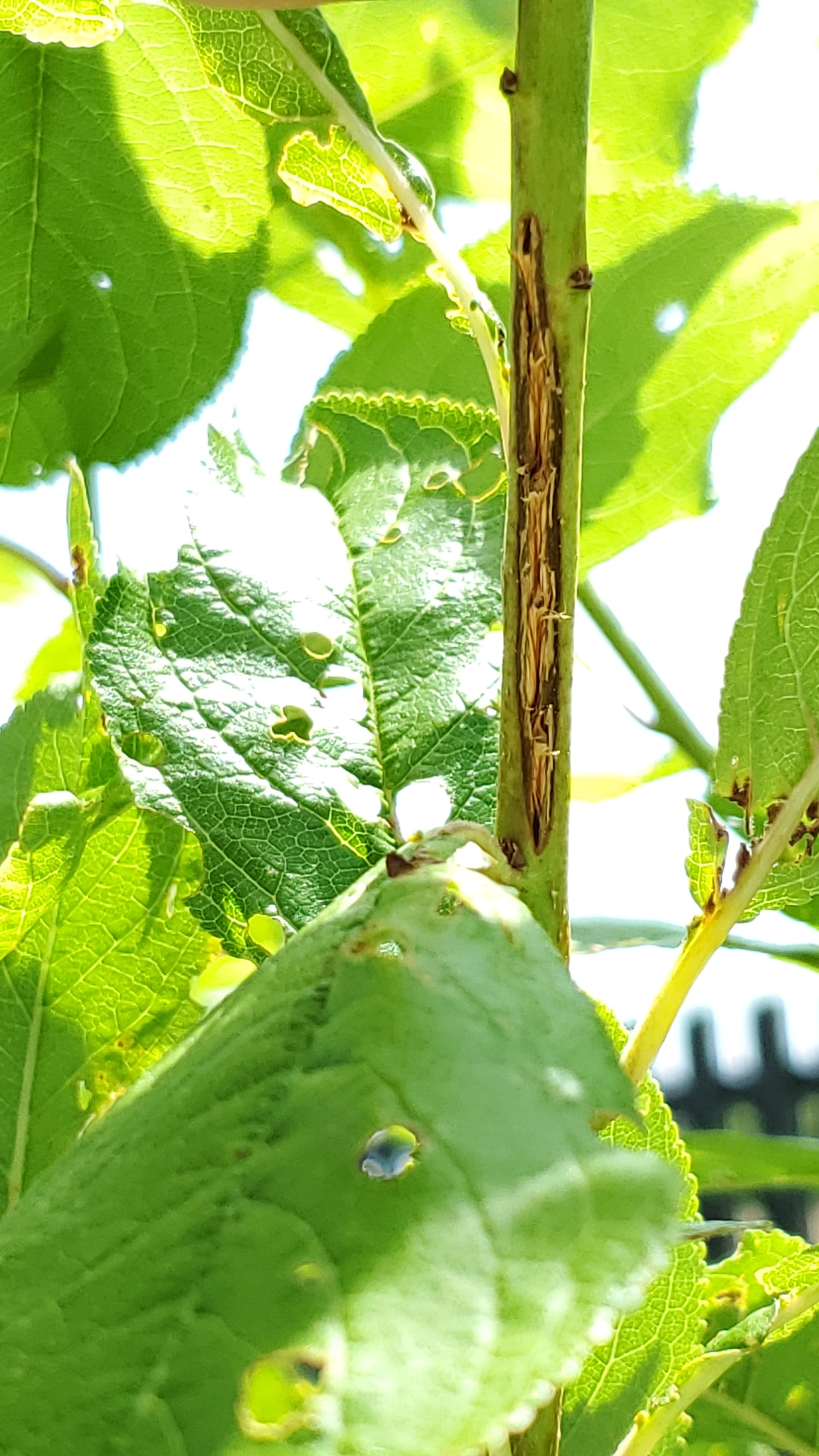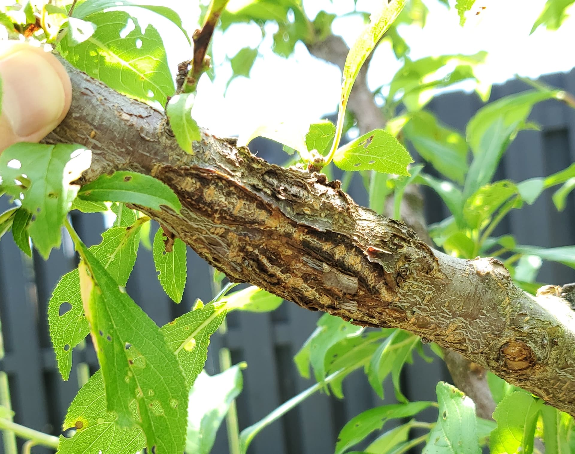 I am in Northern Alabama (8a) and have been dealing with some sort of pest in my Santa Rosa plum for the past two year (it is only two years old). Last year, I thought it was bacterial spot. All the leaves got brown little holes and many of them fell off. I started to treat it with Spectracide Immunox (Myclobutanil) about halfway through the summer. Near the end of last summer I noticed the bark was peeling and cracking in many spots. I missed the boat this winter and did not treat any trees with copper/oil. Starting this spring I have done some Spectracide and Sevin a couple times. Things were relatively ok this spring but have started to get bad lately. The leaves are getting holes and the branches on the new growth are getting these large cracks/damage. I cut off one of the infected branches and cut it open. Inside the damaged part of the branch, I found a bunch of these little white larvae things that look like shinny small rice (they don’t really move but they seem like bad news). Any ideas of what this might be? All my googling and searching has left me stumped.