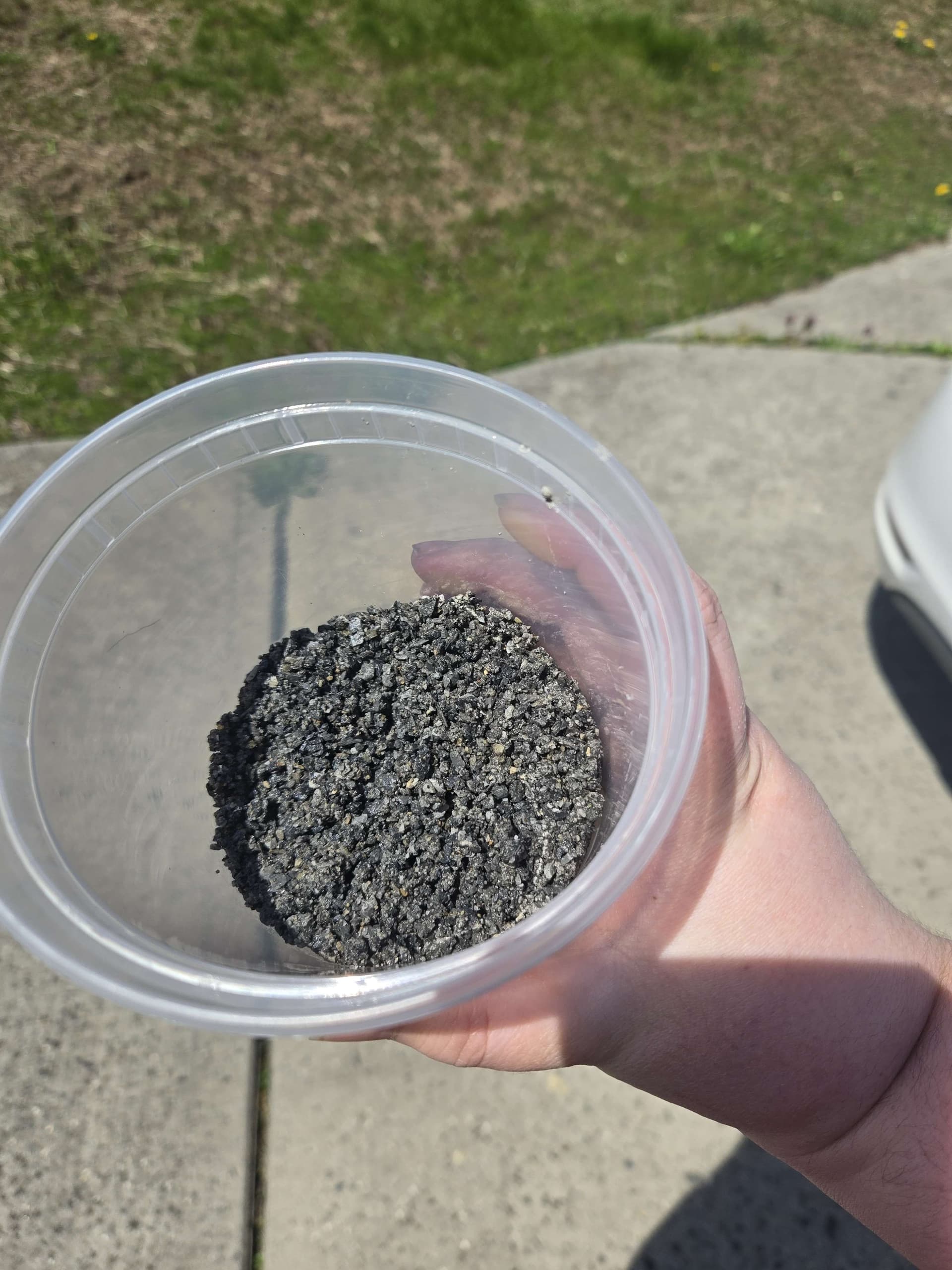 Maybe crushed dark micritic limestone, maybe literal old asphalt aggregate very weird though, never gotten anything but pure sandy “play sand” from home depot