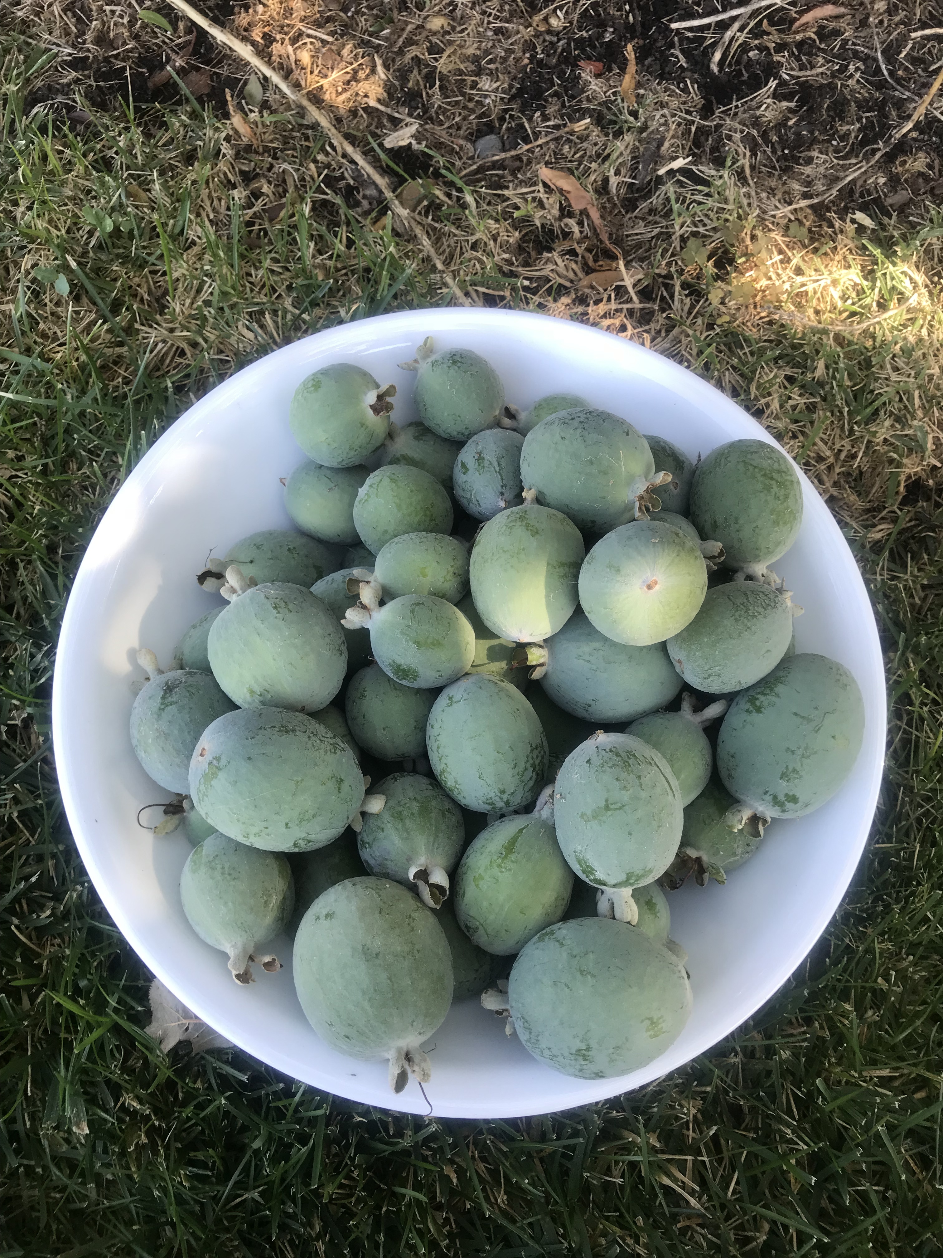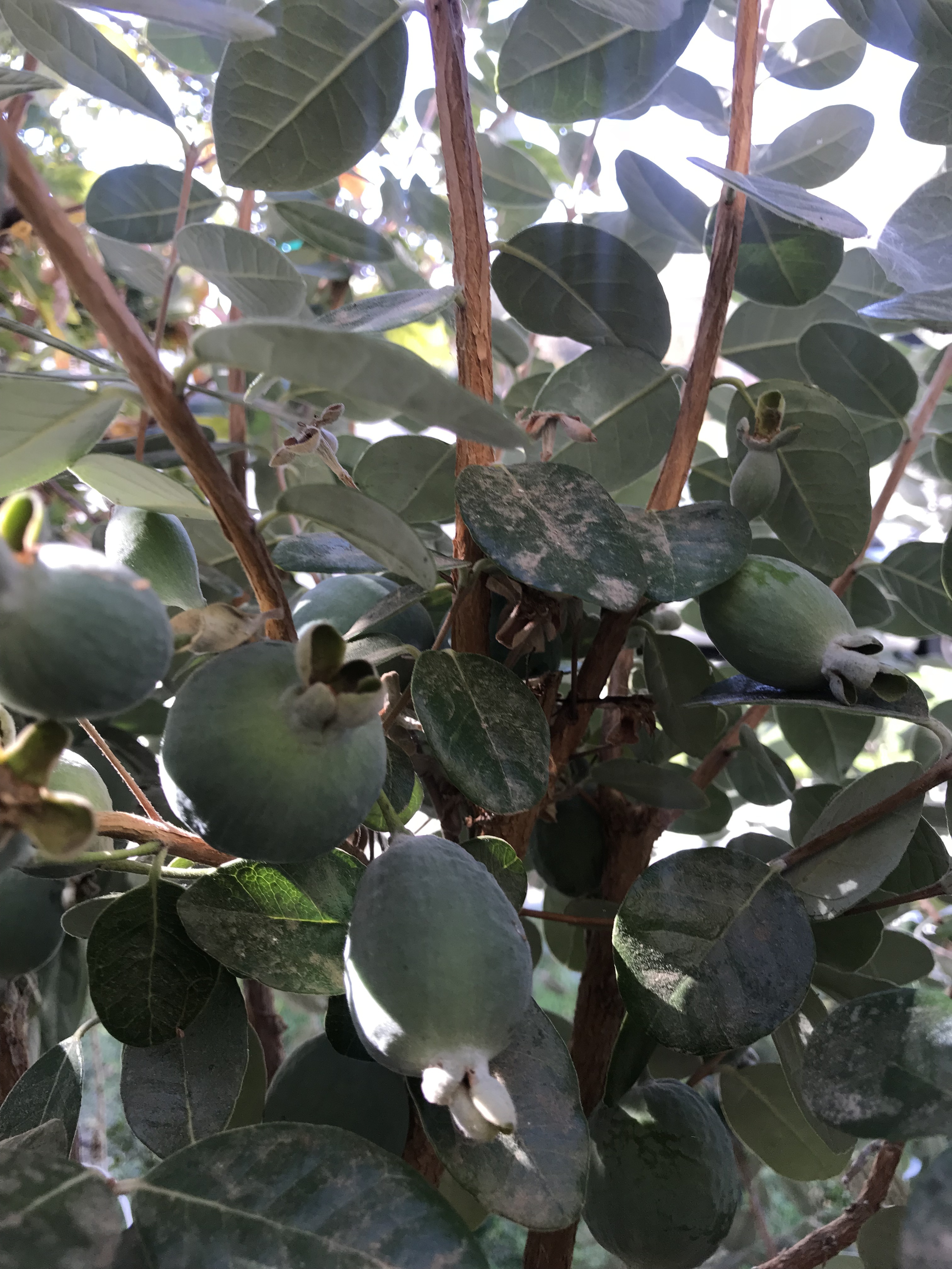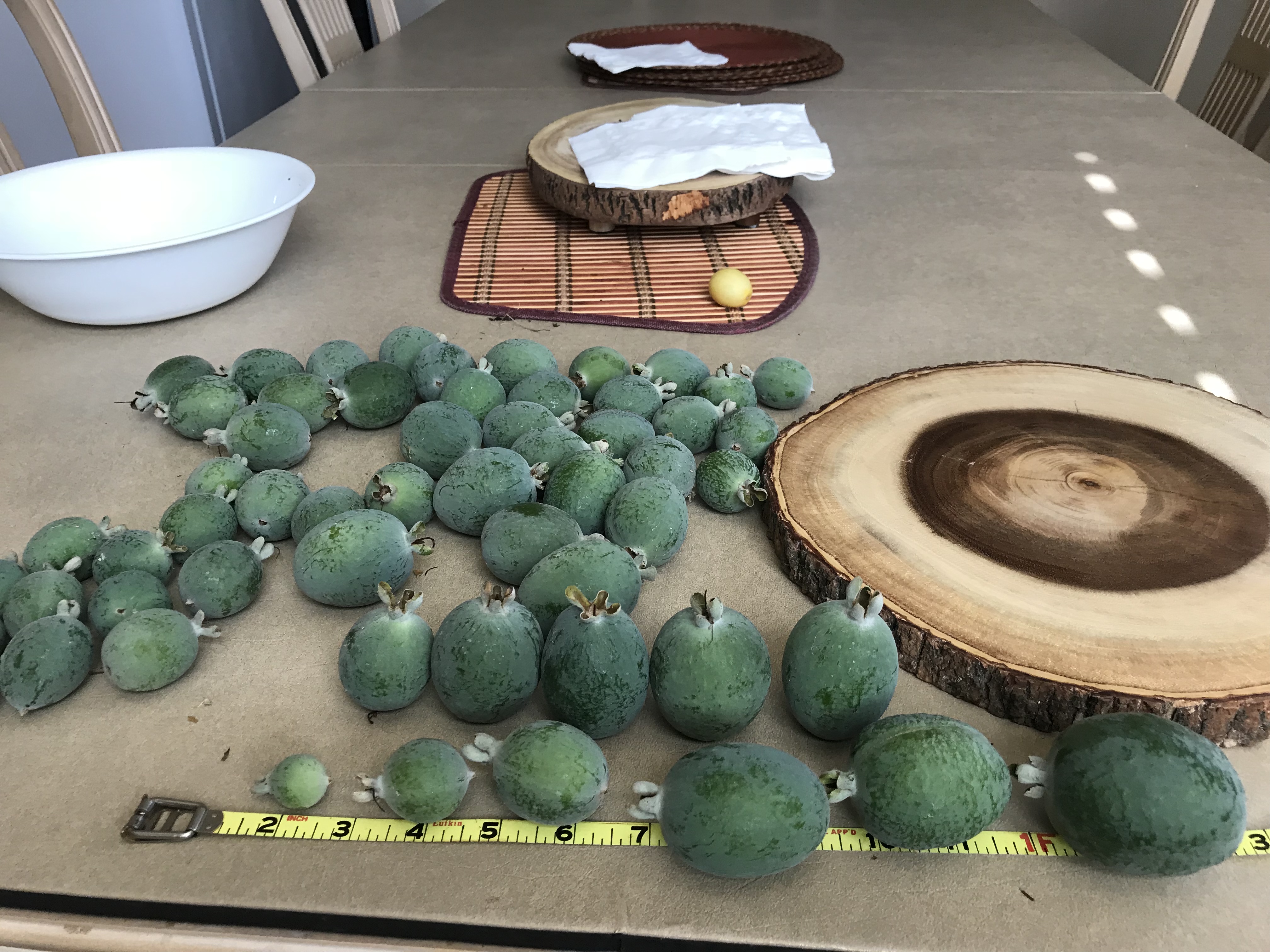 Seven different cultivars of fruits from my multi grafted pineapple guava shrub. I ate two of them and so I am showing only five. One of them has wonderful flavor and almost seedless texture. In my excitement, I didn’t match the fruit to the cultivar name.