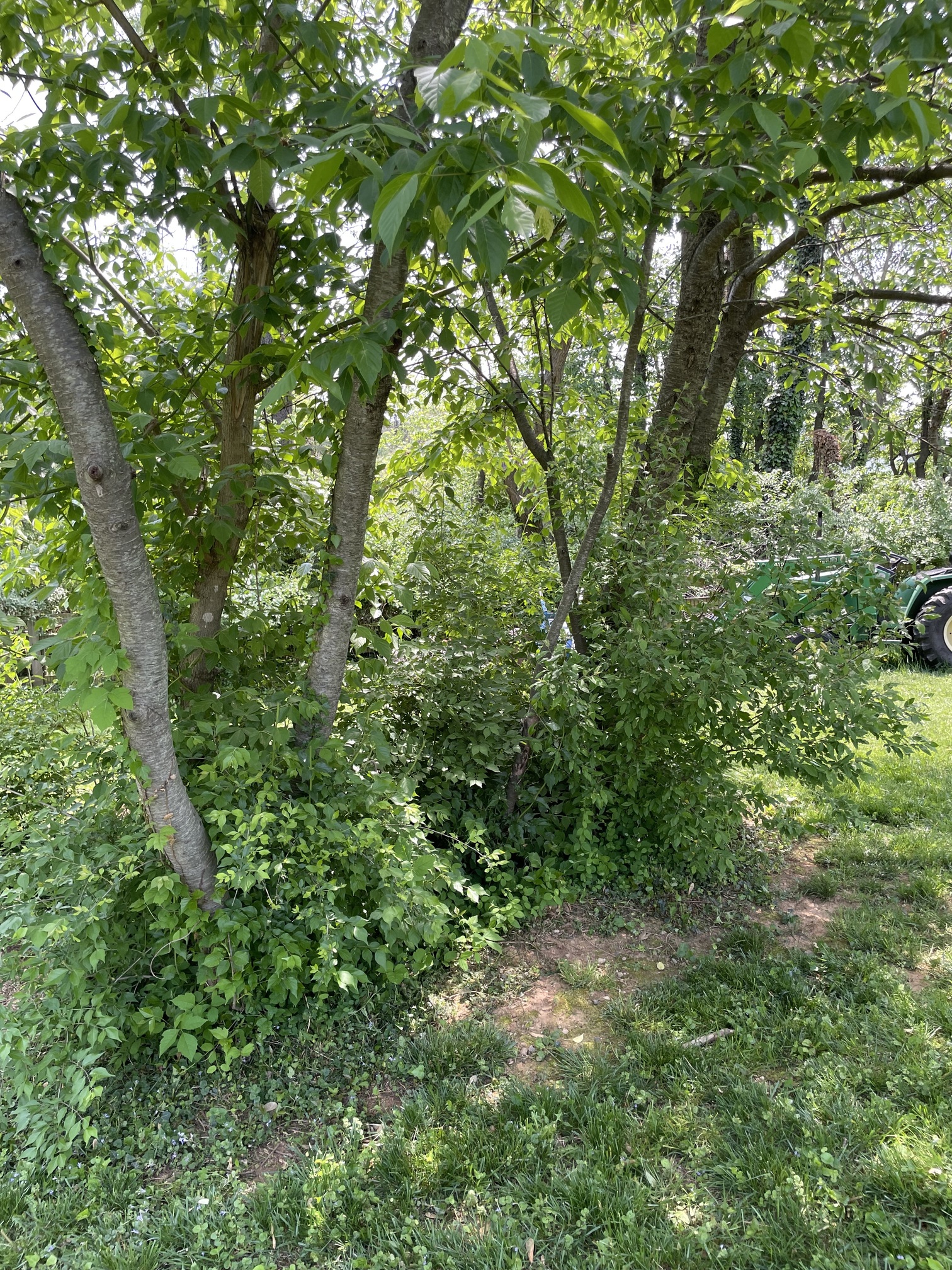 My little 1 acre lot is surrounded by fairly big mazzard cherry (prunus avium) trees (they play havoc with my pool each year when they drop fruit). I have a location that used to have a couple white pines on it that about six cherry trees volunteered and grew to 2-6 inch trunk. See picture. I wanted to thin them out to just a couple but started reading about grafting sweet and sour cherry onto them (cutting tree down to around 2-3 foot stump in the process). I have six trees in this spot and thought to take them all down next spring to 2-3 feet and graft 4-6 scion on each. Mix of sweet and sour. Depending on how they take, I would select at most three trees from the group (the three strongest) and remove the rest. I would then end up with a nice cluster of good cherries in my back yard proper.