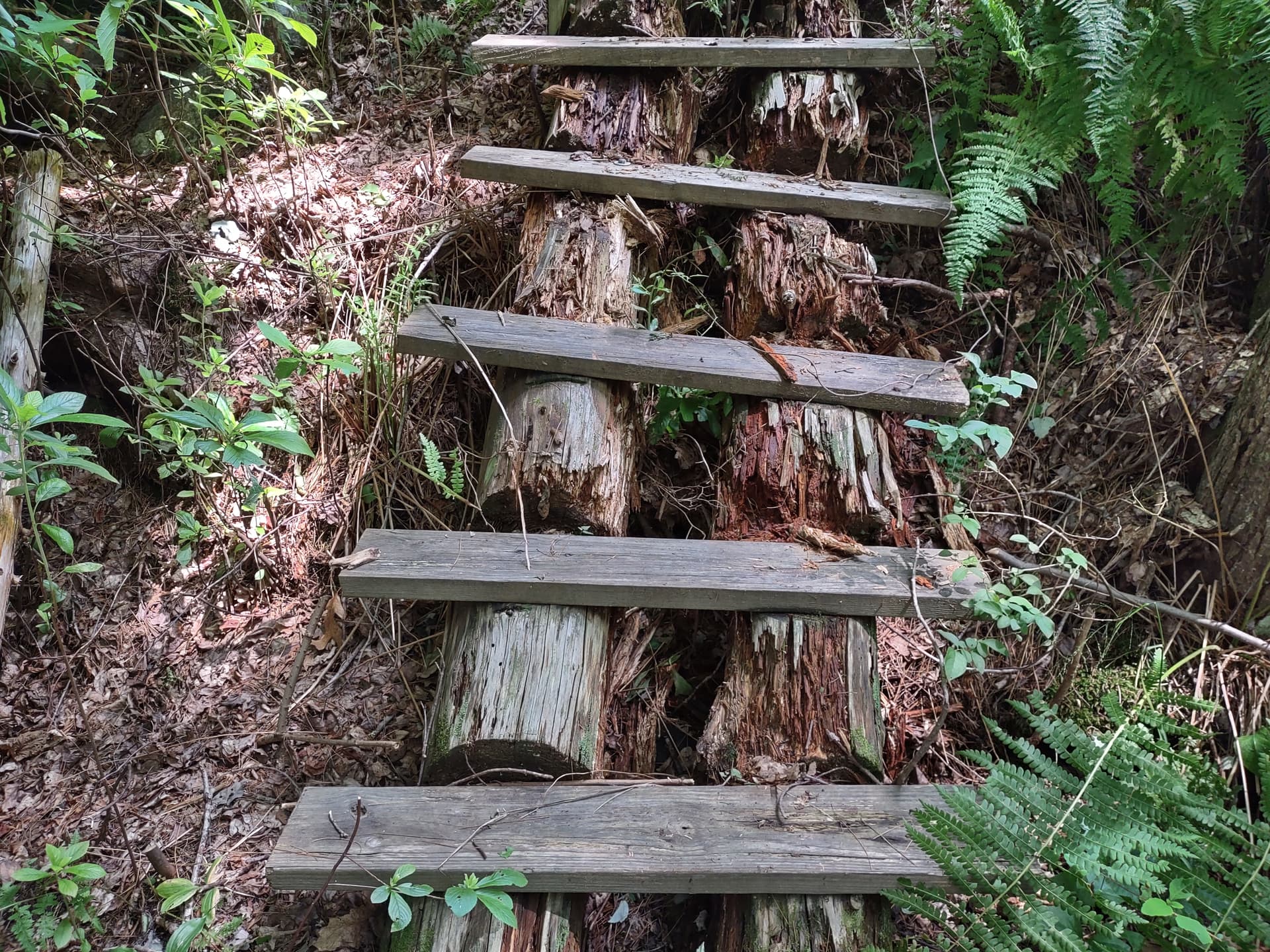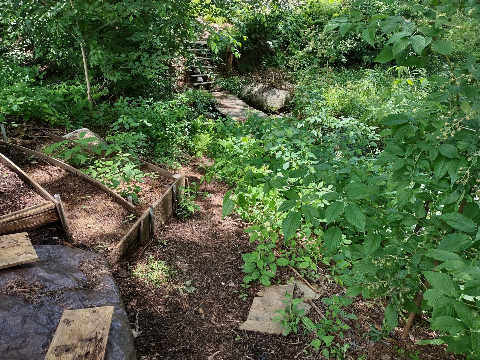 The way down from “main land”. This is not soil, it is 40 years of composted leaves and grass. Blackberries along the way.