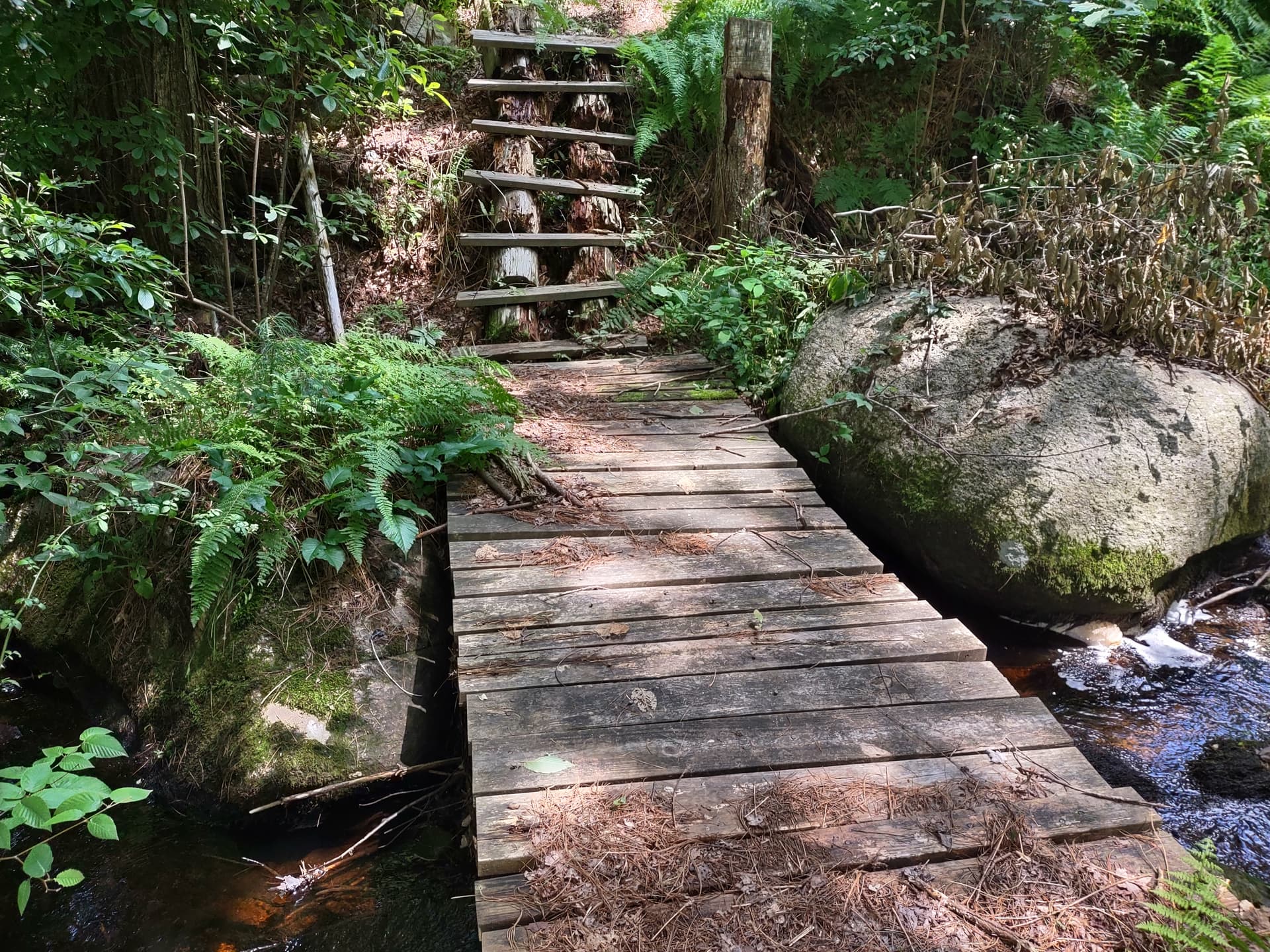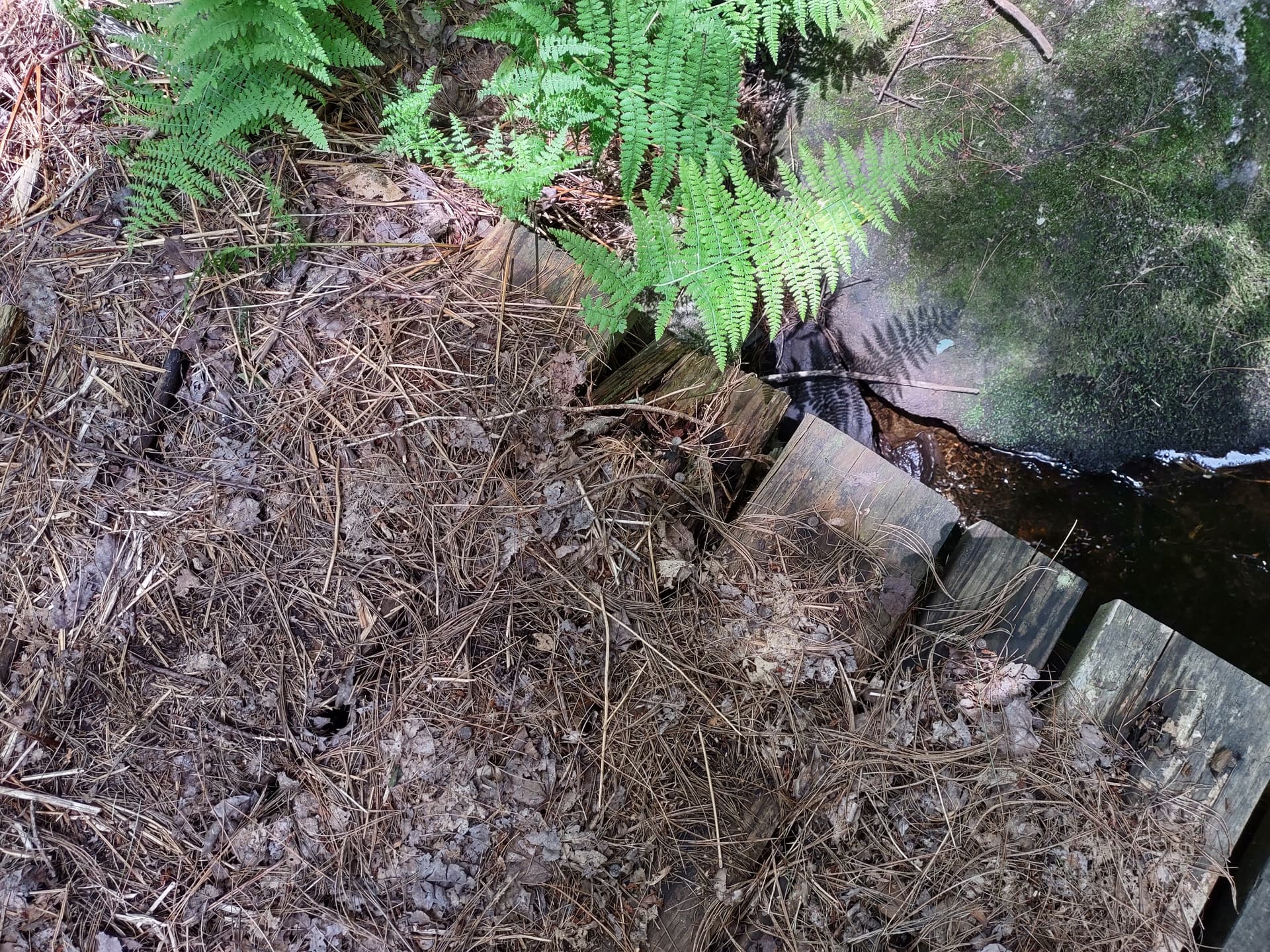 The ladder up is really dangerous. I understand, that the proper course of action is to make stable bridge and stairs first. But that would move my project in queue to 226th position, and I am not in agreement with that. If it would be possible to build the bridge on the top level shore to shore, so we can drive a bobcat through, I would make my husband to set a priority on the bridge project. But it is simply not possible. The shore of the main land side is compost, nothing to hold on to.