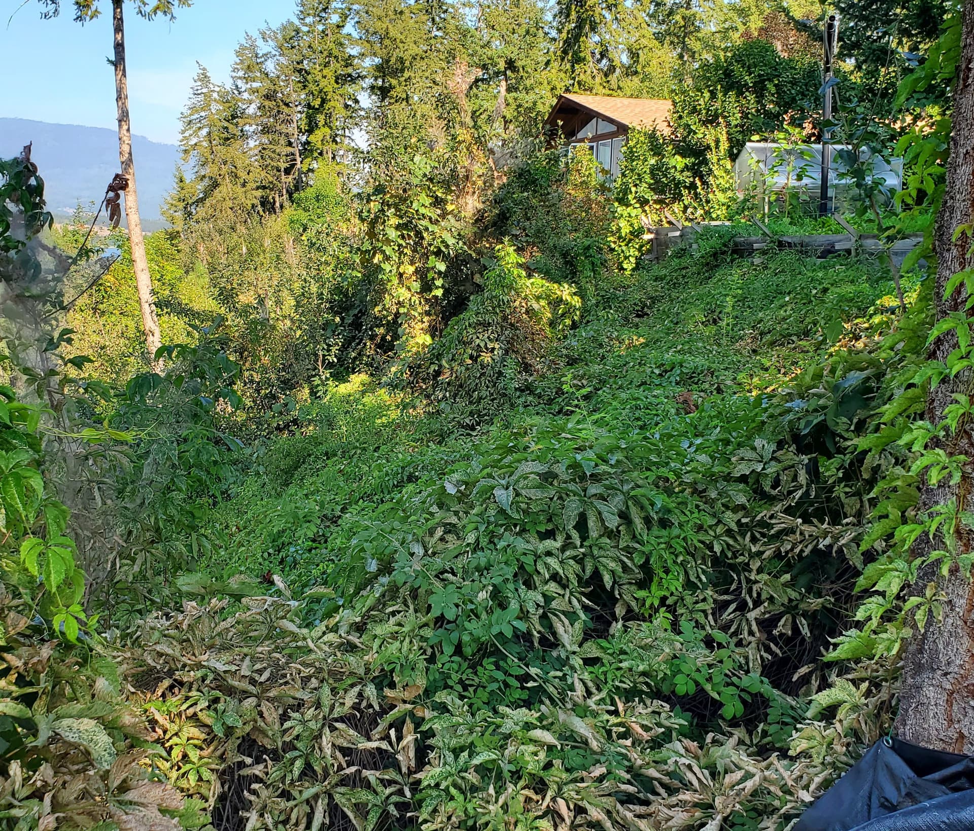 If you squint your eyes at the third picture you may notice there is a bench about 15 feet below the top of the slope. That’s where I eventually want to put a row of raspberry and blueberry bushes. To stabilize the slope and crowd out the weeds I’d like to put in some kind of bushy shrubs or trees that I can chop and drop to keep pruned and not block the neighbor’s view. Although that might still be a ton of work to keep the nighshade from taking over; it seems to have no issues with shade. I’m also considering that a deep rooted grass might be the best choice.