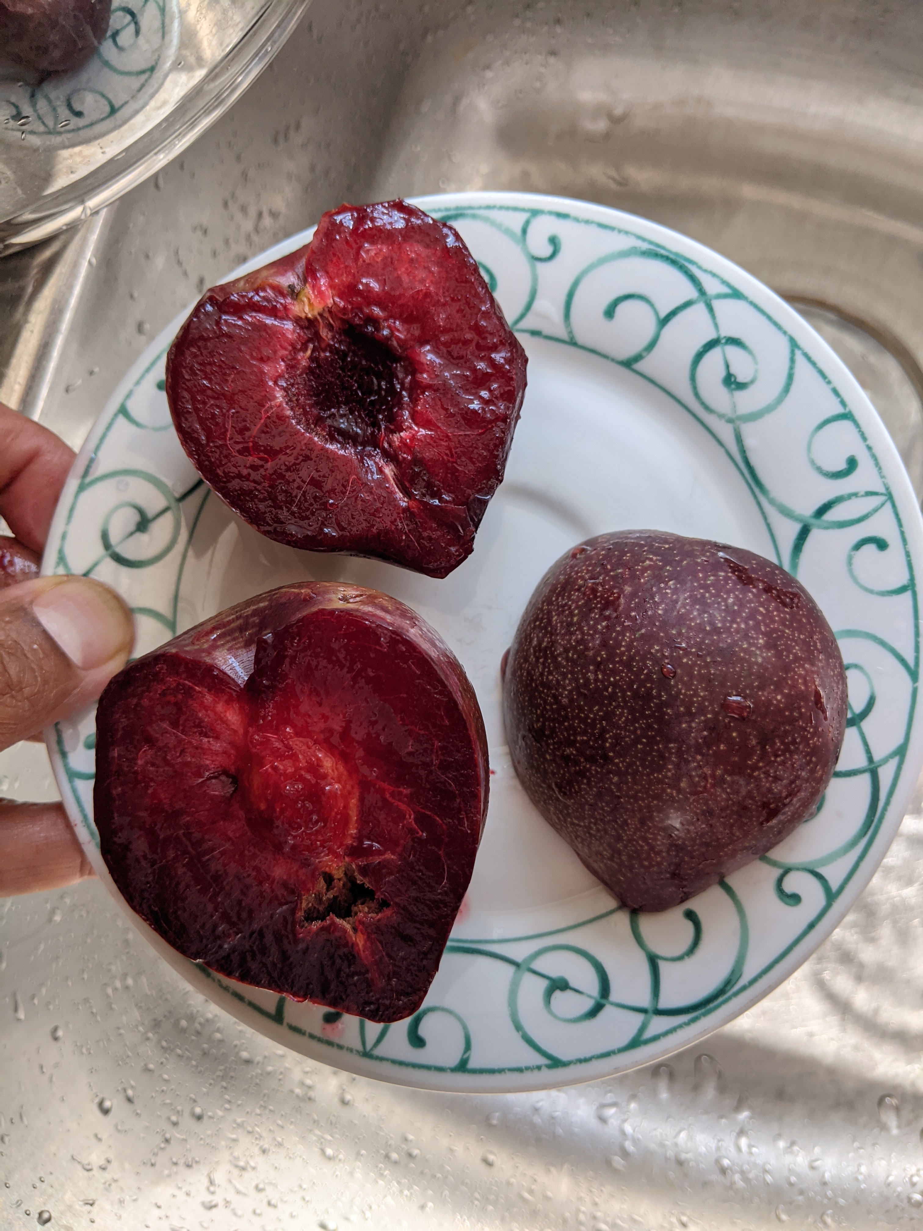 I’d bet a million dollars that is a pluot called Dragon Tears that is exclusively grown by Kingsburg Orchards for the retail grocery market. I got a tree several years ago by accident and I can tell you that when the first ripen they look like your first photo, and when the ripen more they look like your second photo. They have the tear shape, skin matches, and so does inside. THey are probably my favorite stone fruit ever but sadly my tree has a horrible case of black rot and is now dying from it. Here are 2 pics of Dragon Tears.