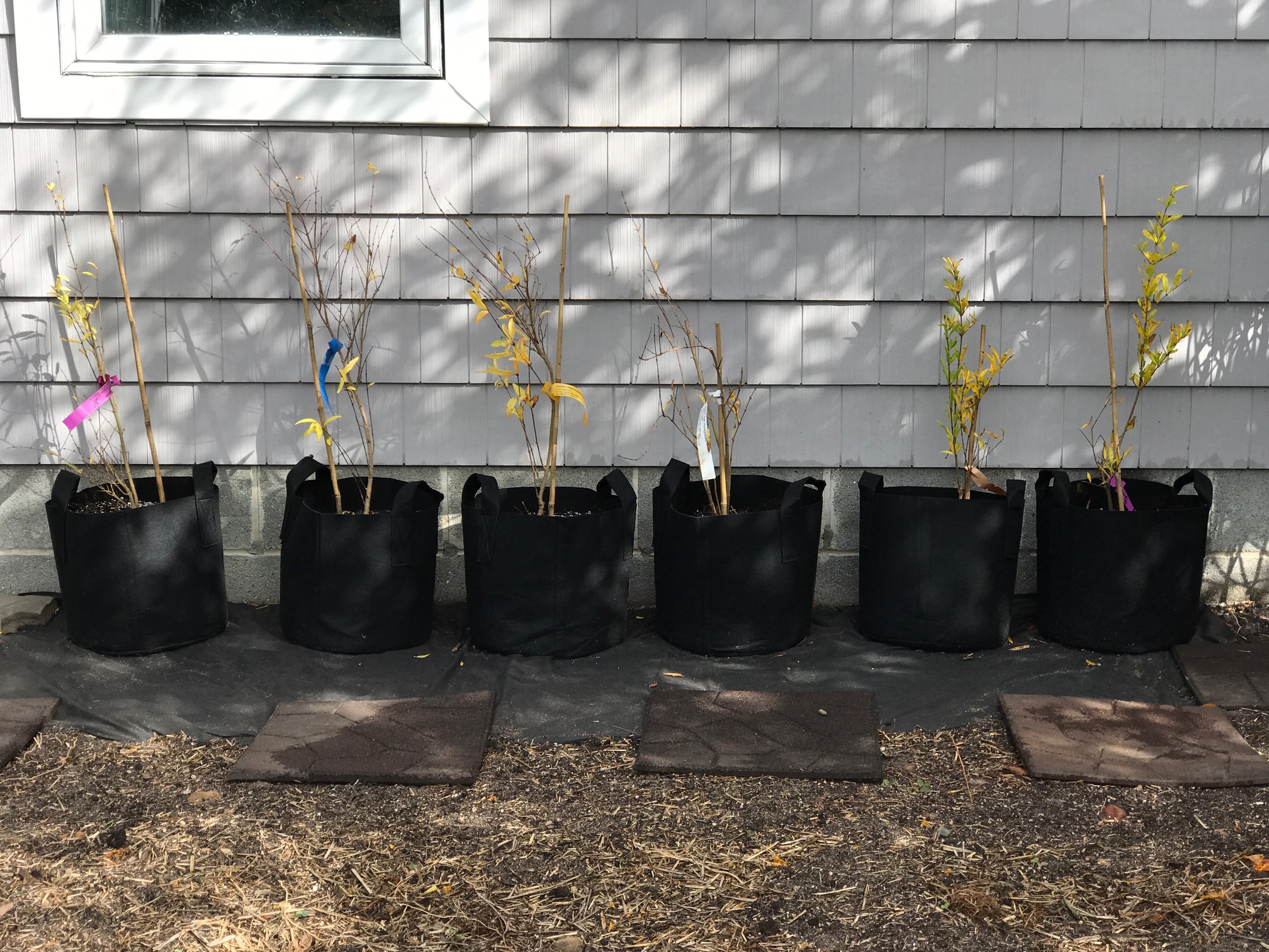 We will plant the 10 new trees ‘grove-style’ in 2 rows of 5. With 10 feet between. We’re going to start preparing the ‘holes’ this winter - so that we’ll be ready to drop them in, when they arrive in the spring. Some already arrived - from Rolling River. They were potted nicely, and I repotted them in 5 gal fabric pots. (by Gardzen) They are now resting for the winter, against a wall that faces south.