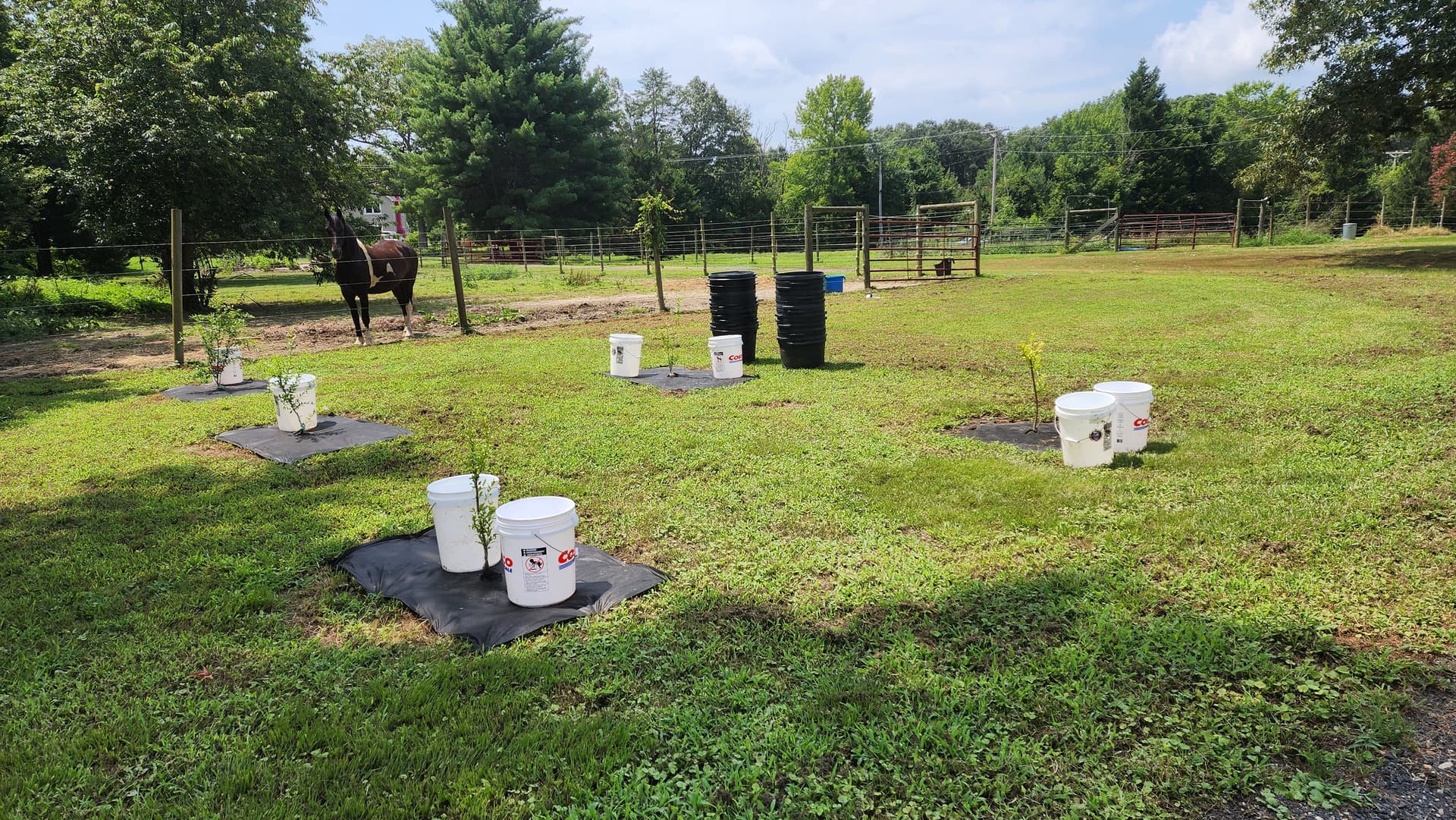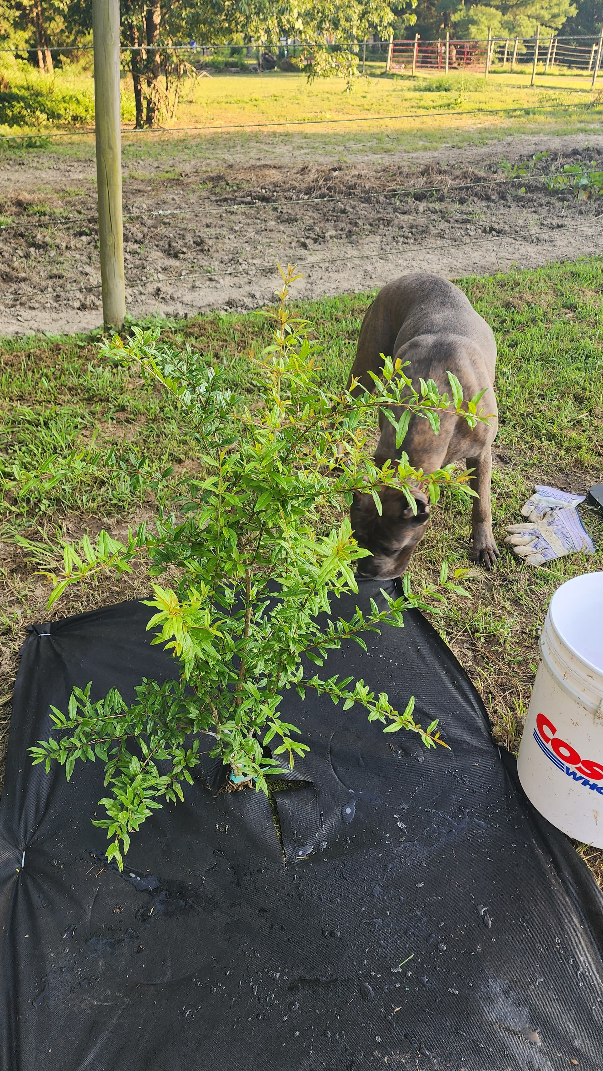 Pictures of the first mini orchard (featuring my Barock Pinto mare, Leentje) - Parfiankas are the two farthest back in the left row. Plus a closer pic of the bigger one with my Cane Corso for scale.