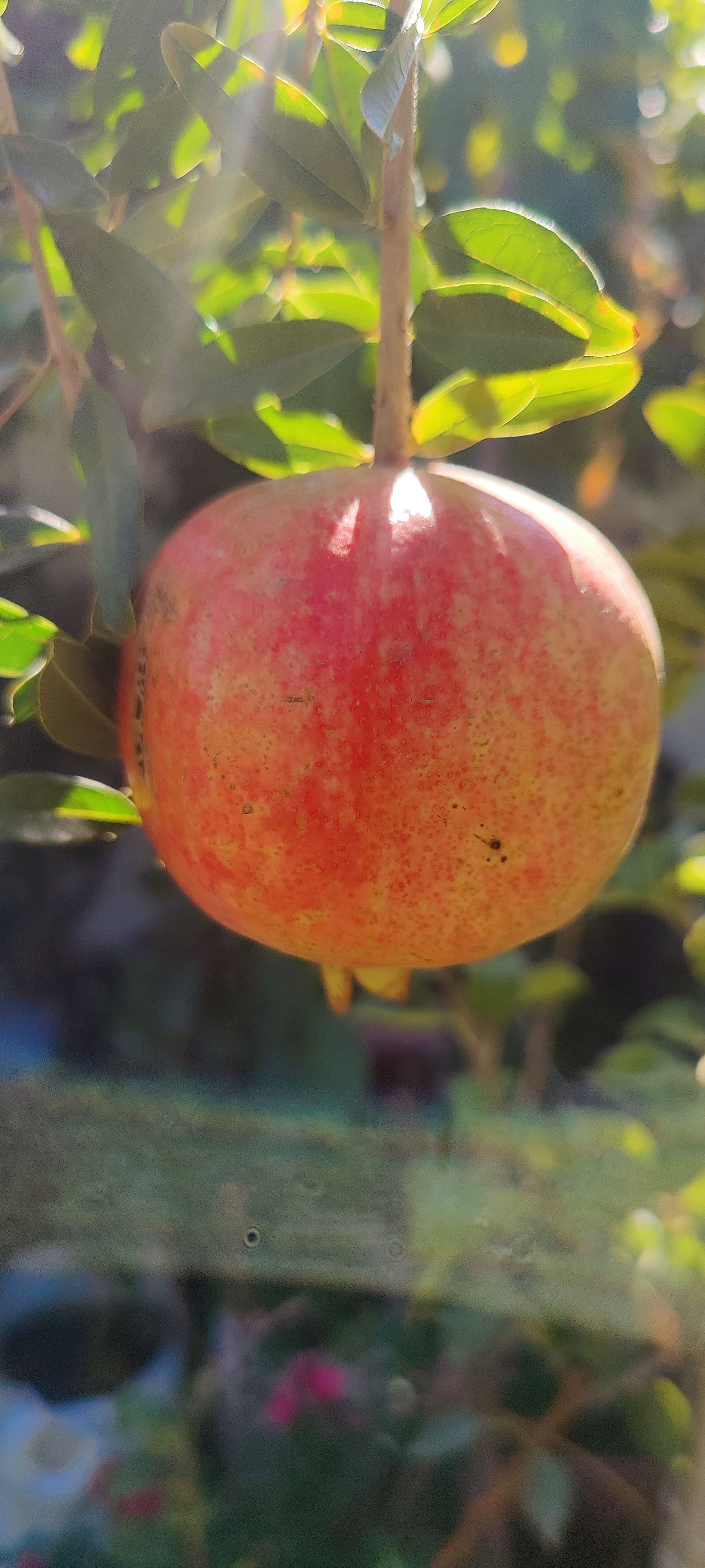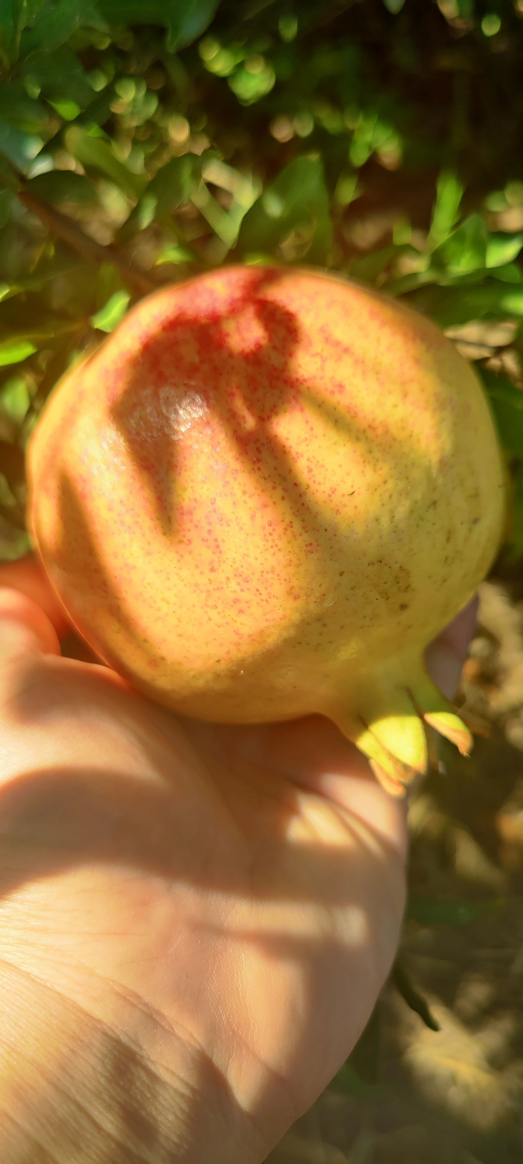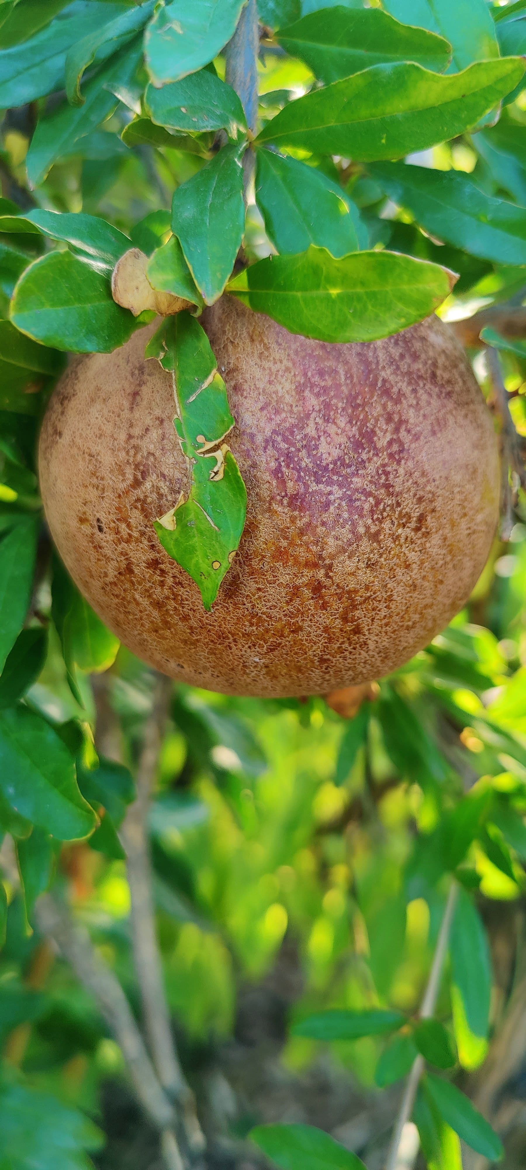 This pomegranate have a different color. Color looks bronze. It’s super sweet and stingy. There is only one fruit on the tree. Last year there was 4. It’s the 2nd time it produce fruit. It’s super red inside and very sweet.