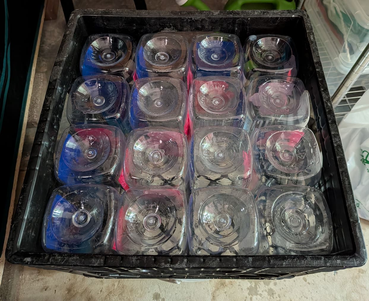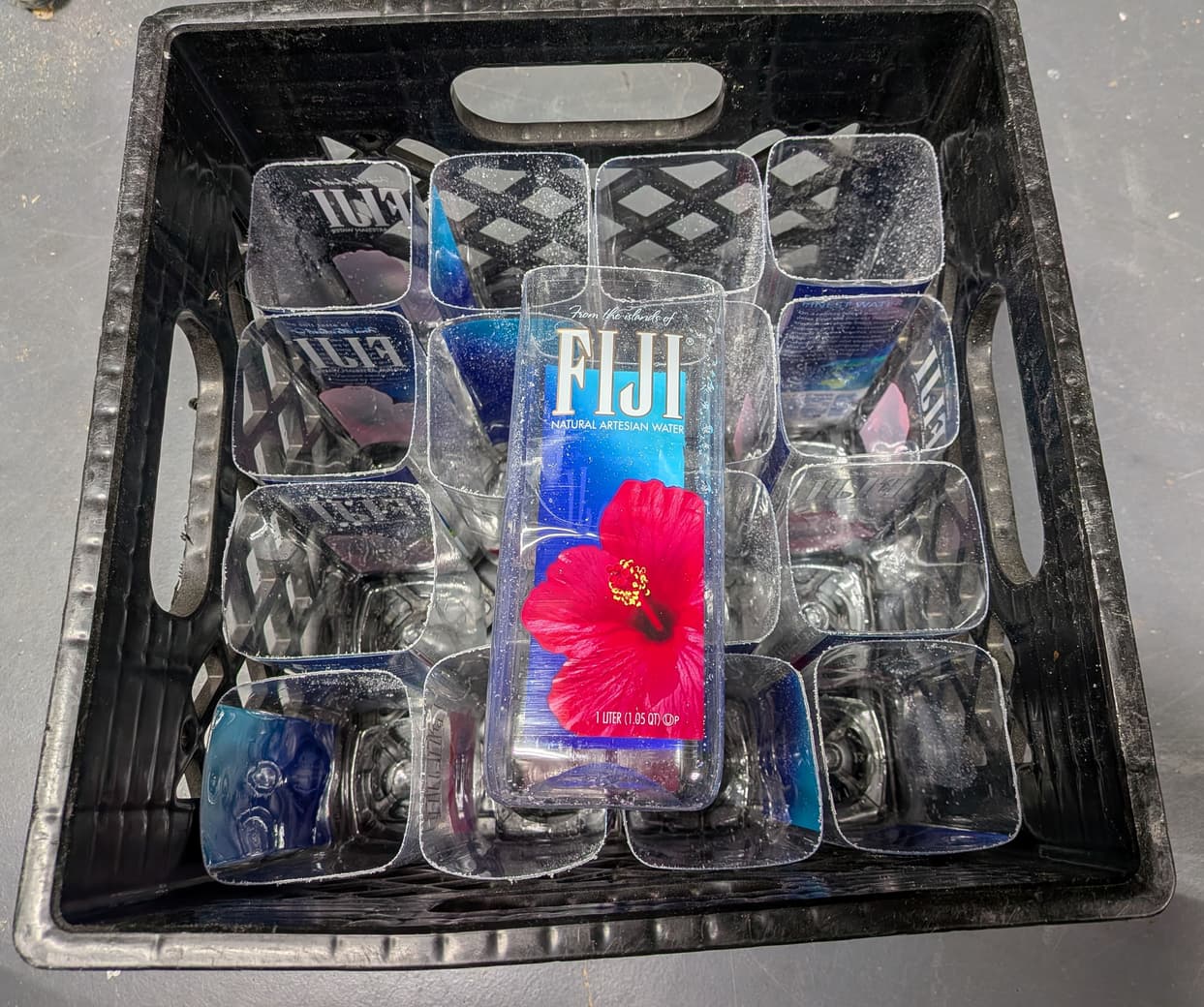 a buddy of mine drinks tons of fiji water. turns out they fit snugly 4x4 in milk crates. with the tops cut off they are 7" tall.