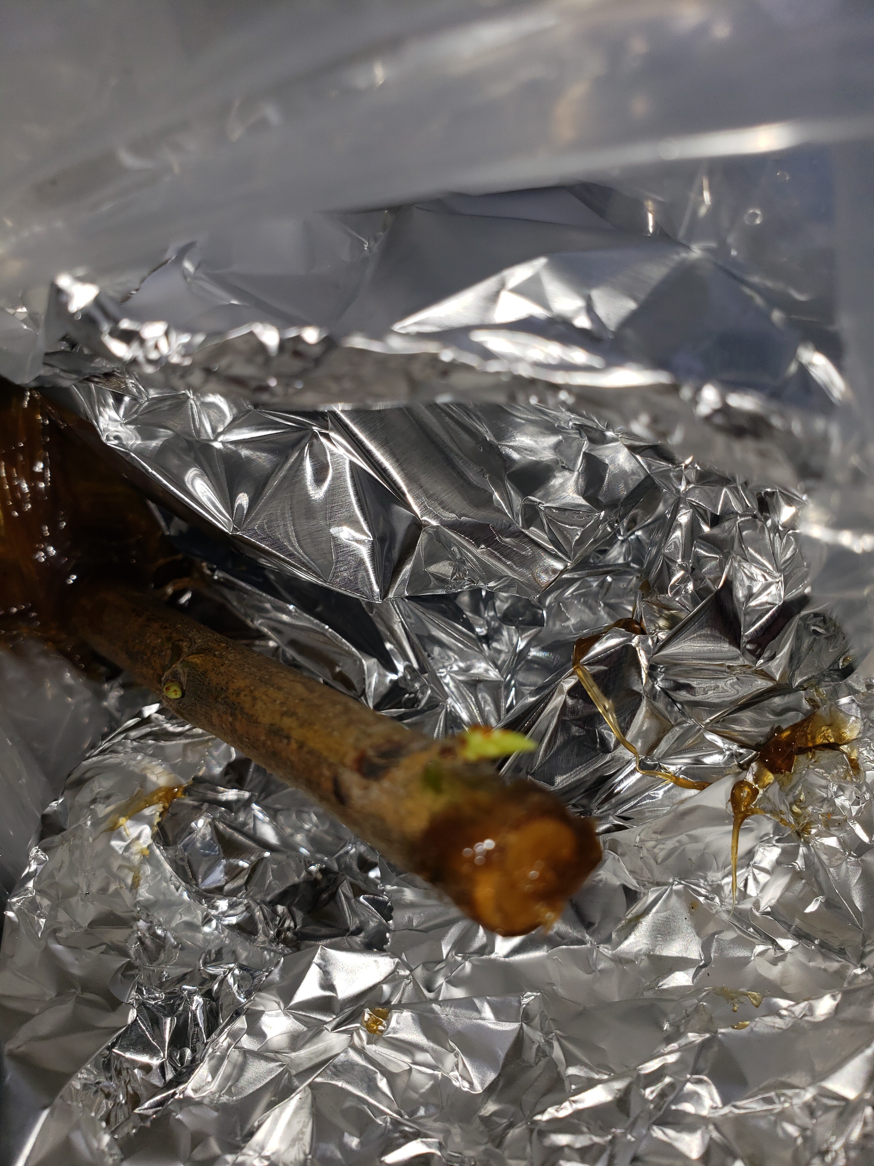 There wasn’t much growth on the tree, so there wasn’t much to harvest for potential scion. I cut 1 small branch off that I managed to make two drill grafts from.