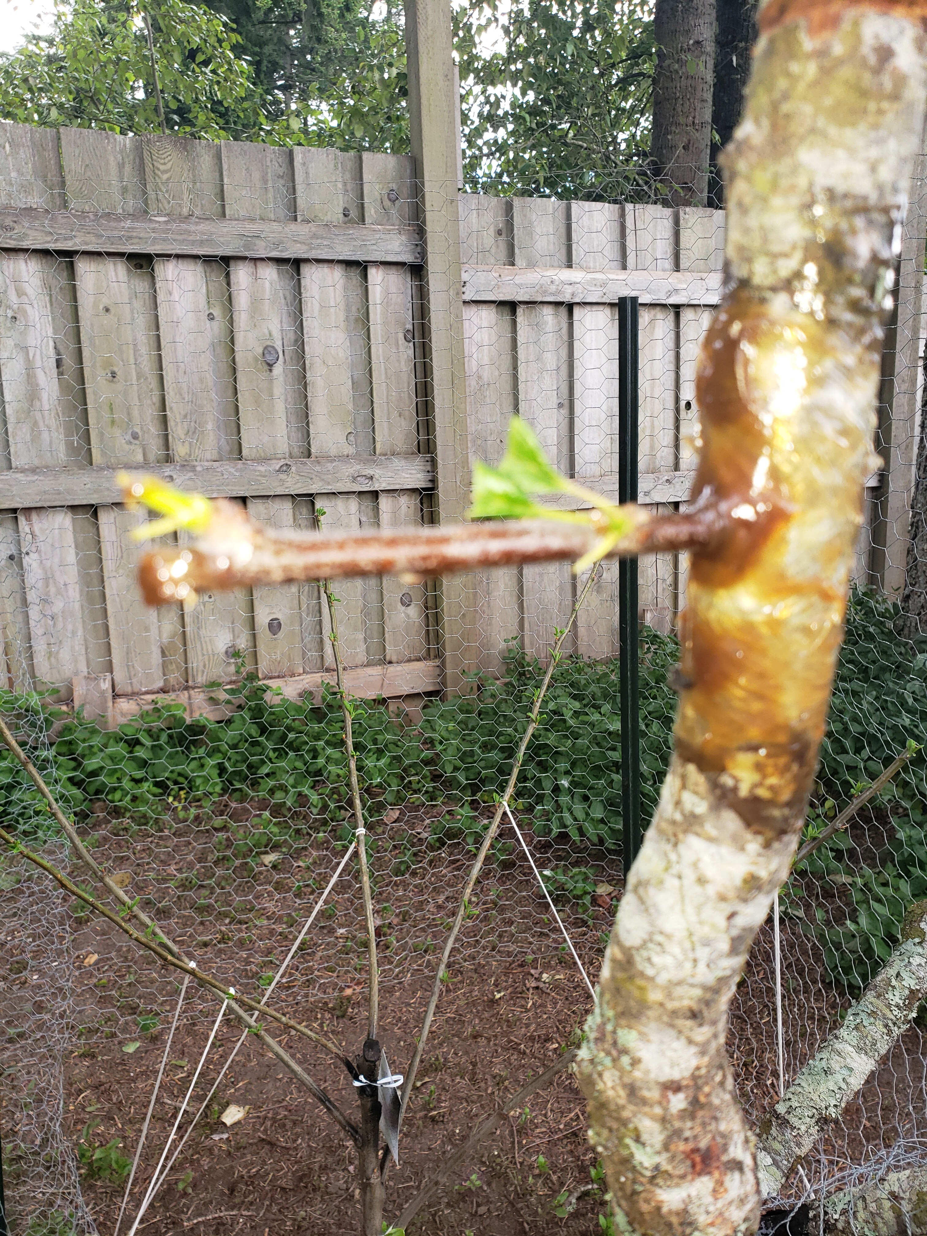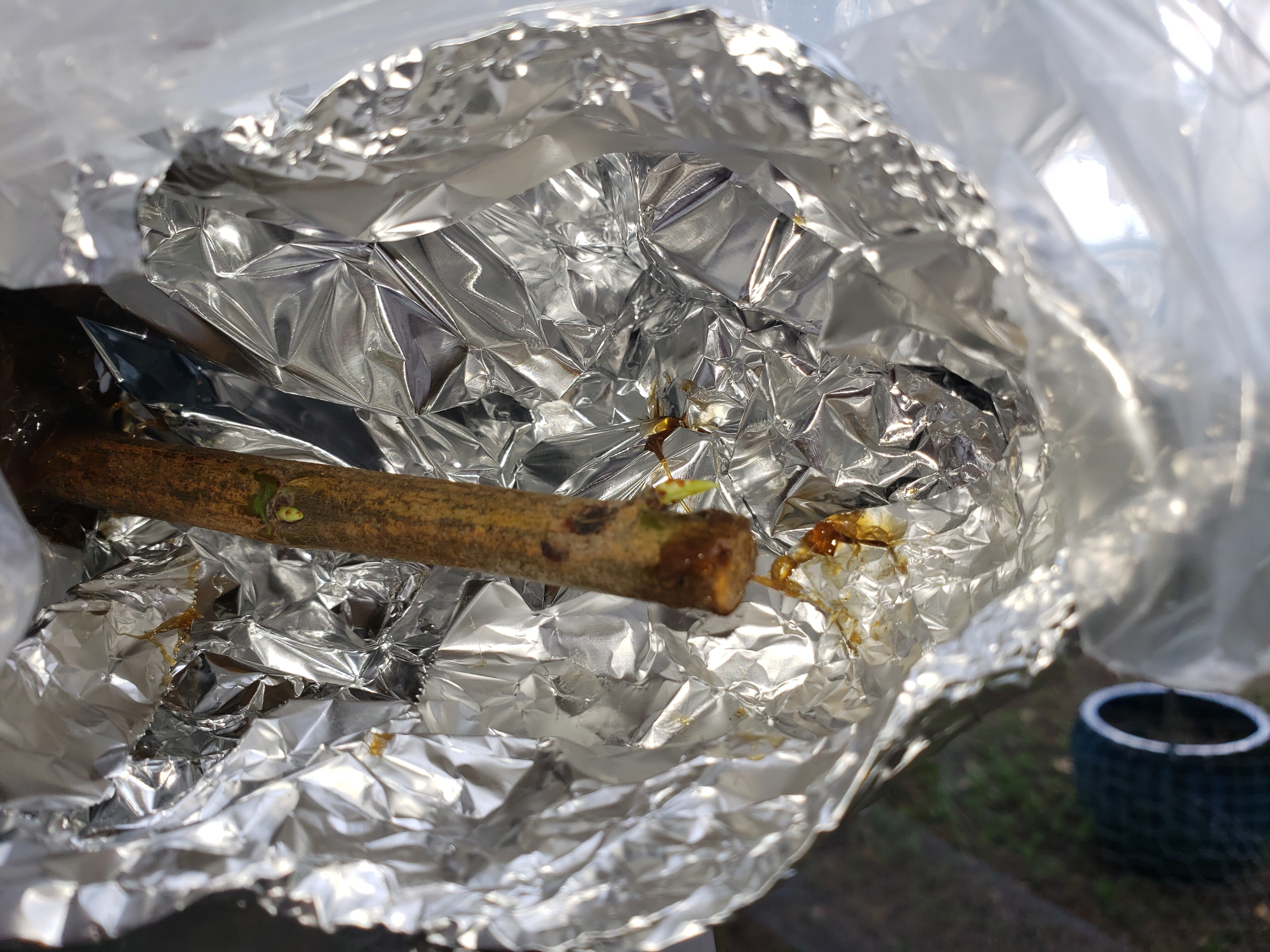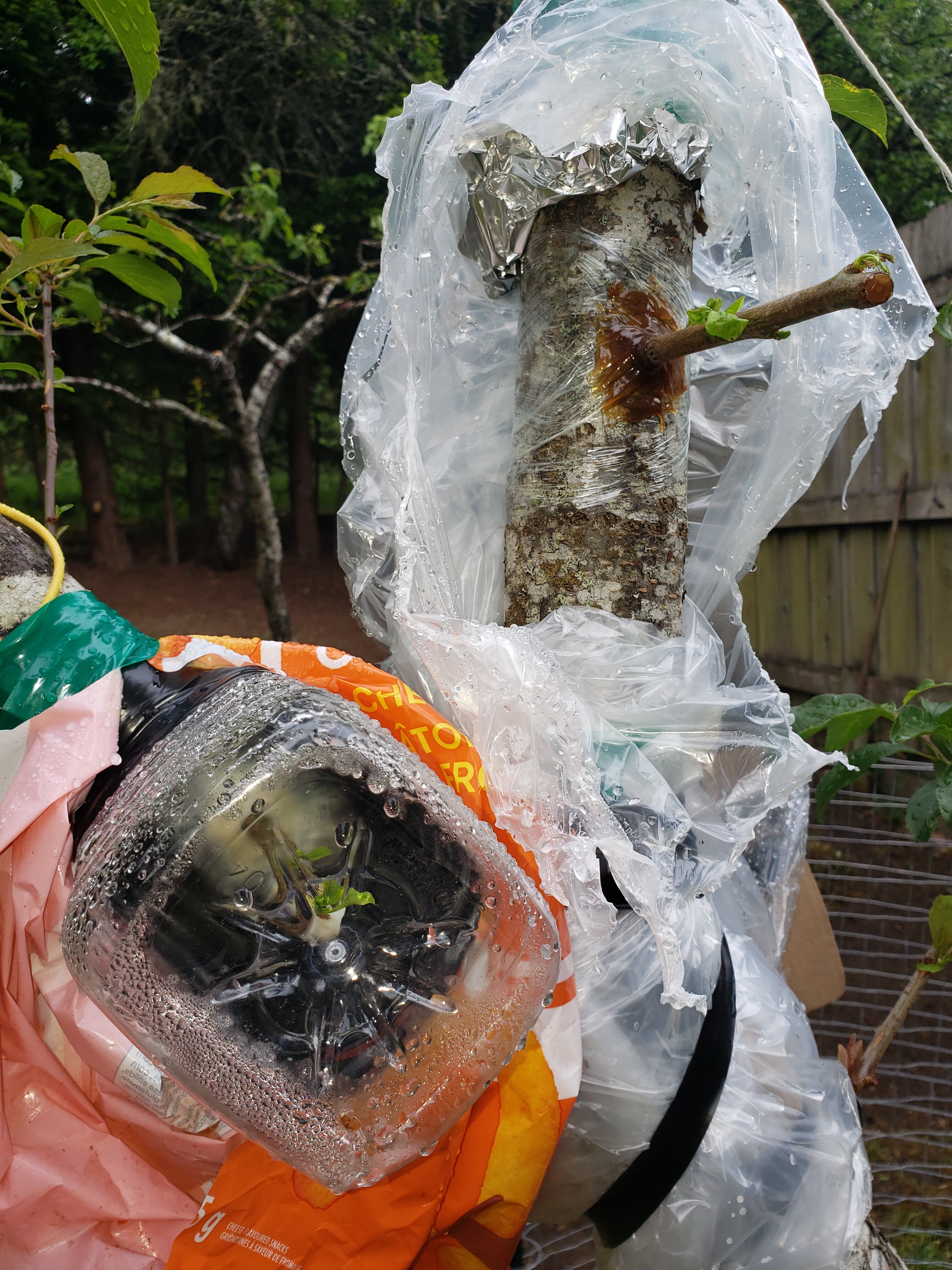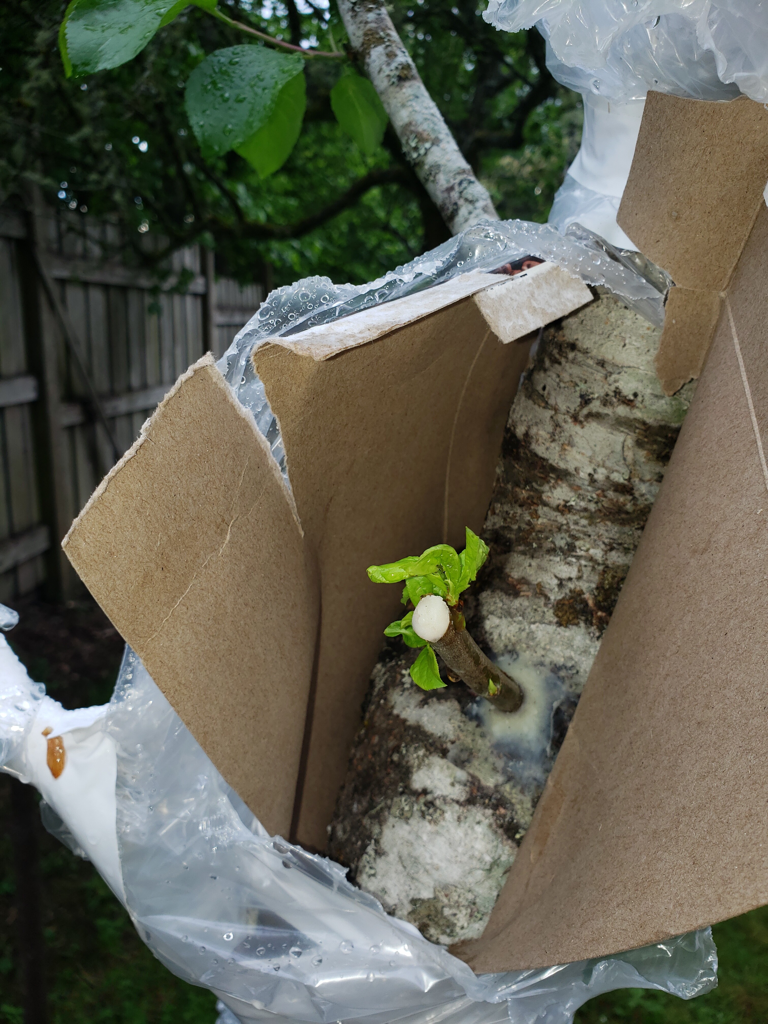The other Black Amber scion that I grafted to the same Shiro plum tree seems to be budding (but barely noticeable) from latent buds I cut from the same branch. Considering this scion was completely enclosed and sealed by a plastic bottle I would have thought it would have been the faster starter.
